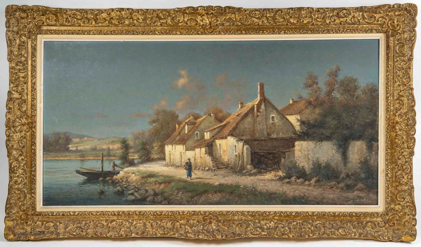 La scène représente un petit village ou un hameau au bord de l’eau, probablement une rivière ou un étang. L’atmosphère y est calme, presque nostalgique, baignée d’une lumière douce évoquant soit le matin, soit la fin de l’après-midi. Le style est caractéristique du réalisme rural ou de l’école de Barbizon, qui s’attachait à dépeindre la vie paysanne et les paysages naturels avec authenticité.
