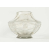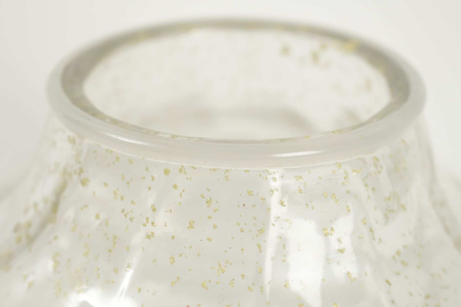 Vase en forme de toupie. Épreuve de tirage industriel réalisée en verre blanc transparent à inclusions de paillons d’or intercalaire. Décor de serpentins de verre et de cabochons appliqués et modelés à chaud.