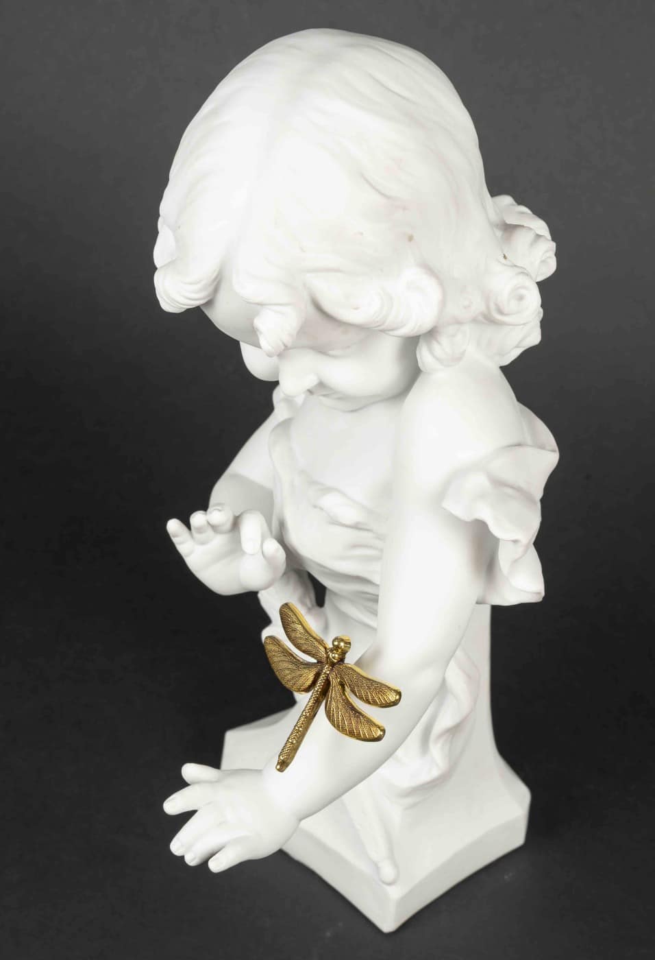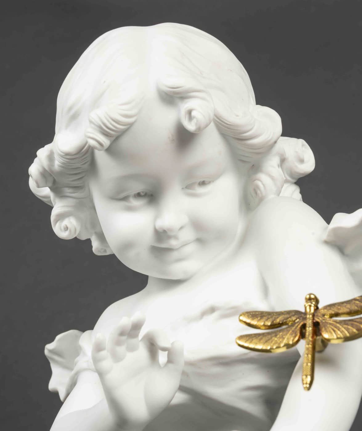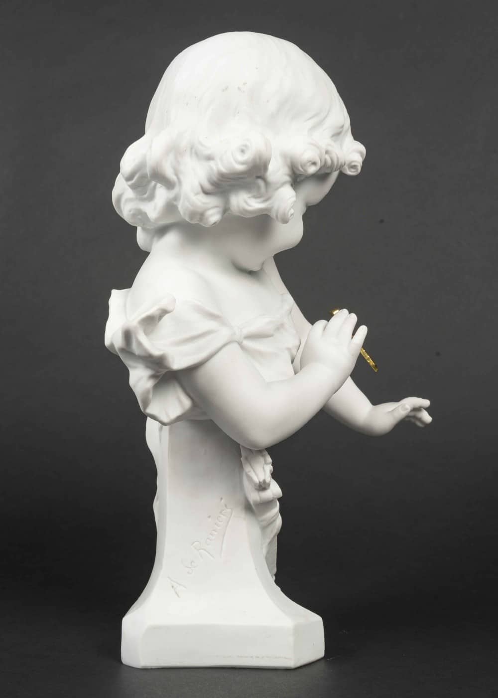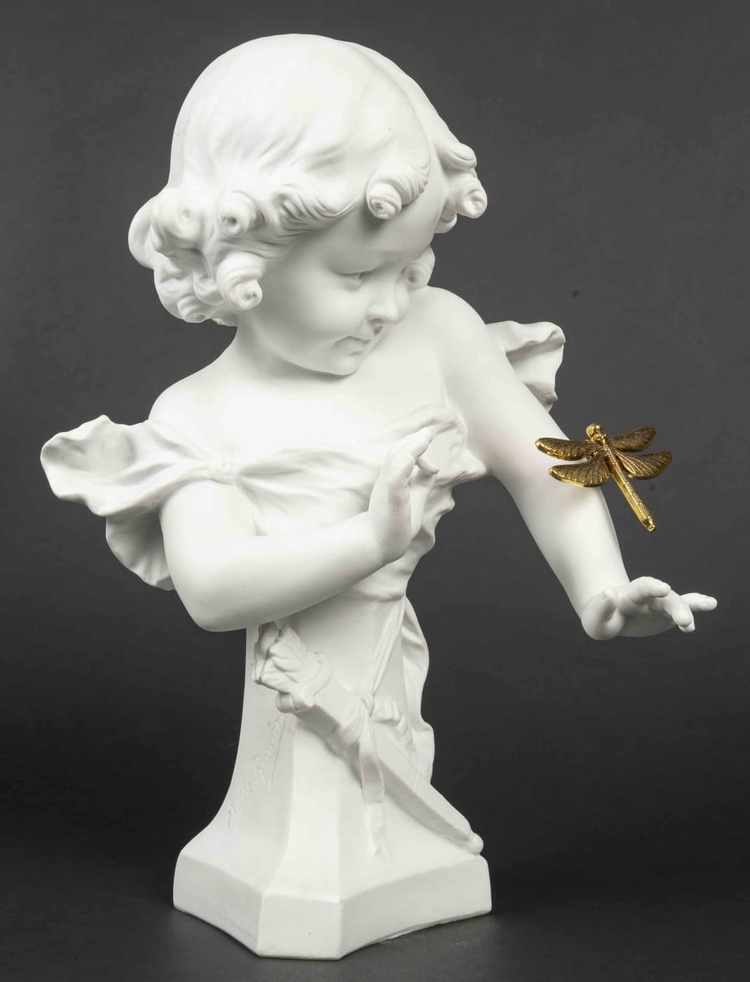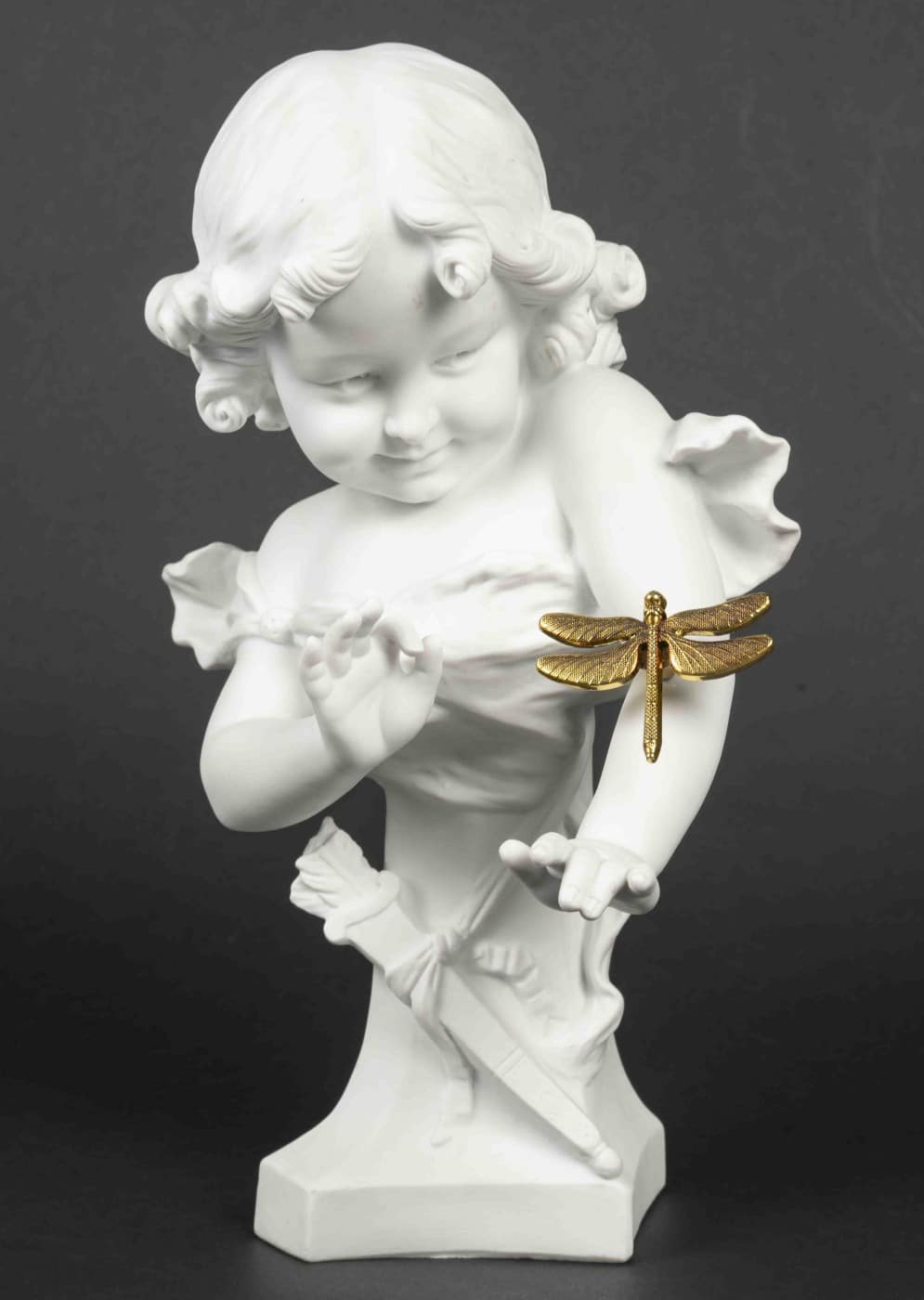 Aristide de RANIERI (1865-1929). Fillette au carquois. Buste en biscuit, signé sur un côté. H : 32,5 cm La libellule sur son bras (l’original est perdu ou cassé, celle-ci est rapporter)