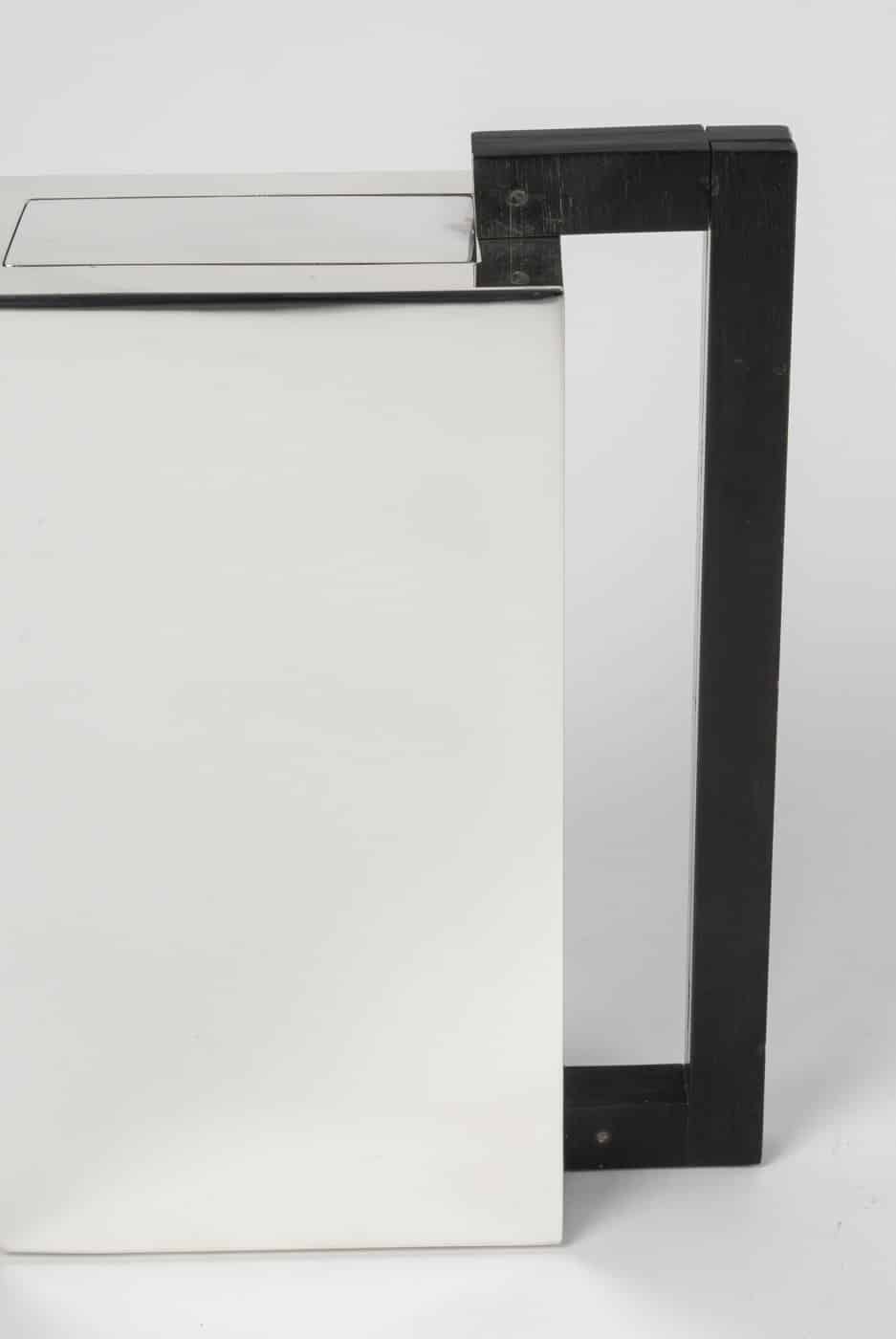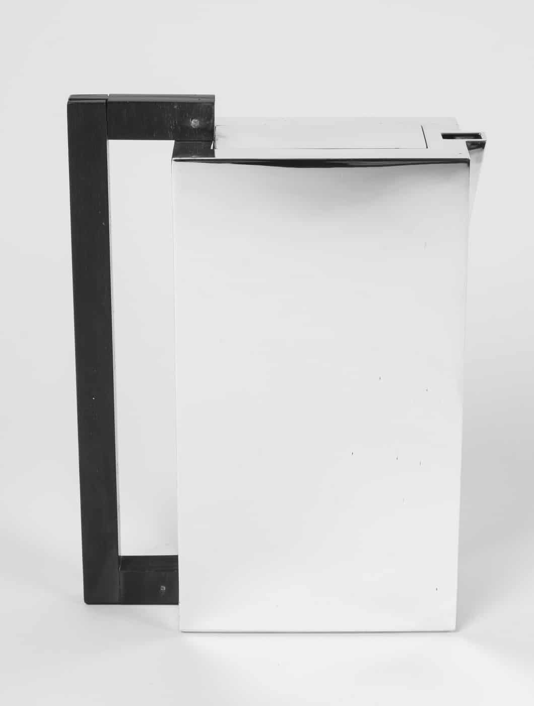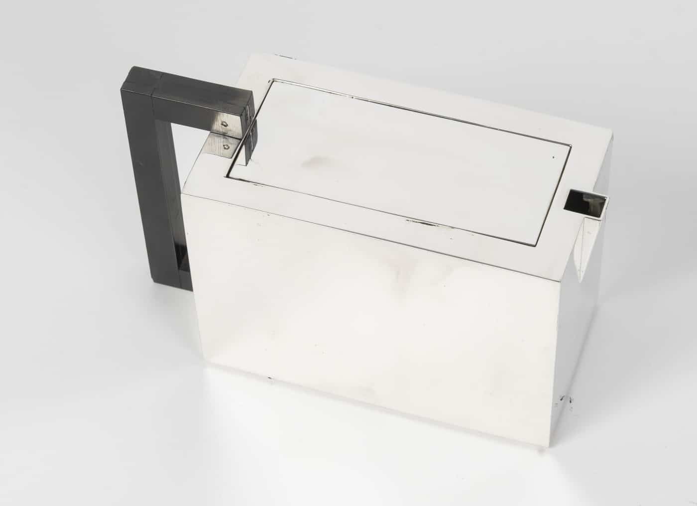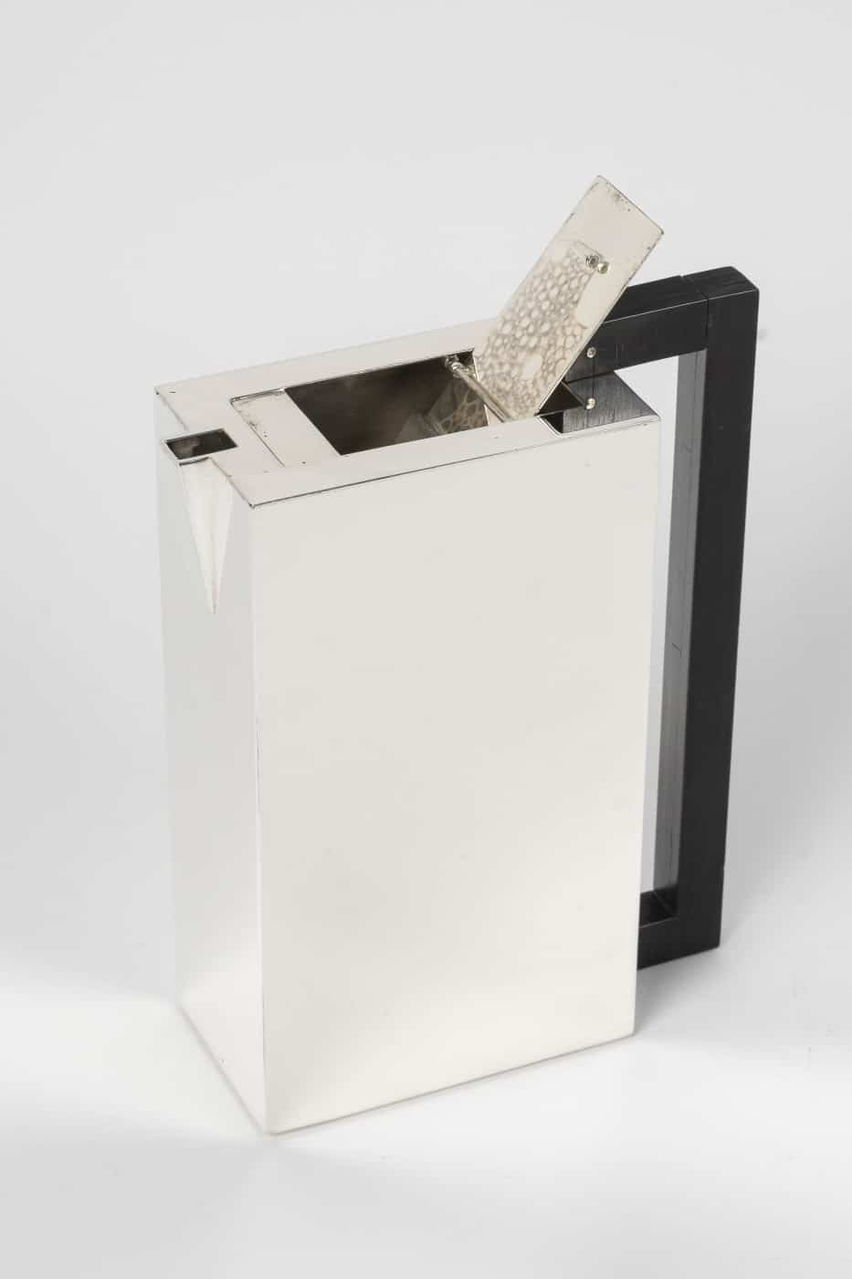 Silhouette architecturée, ligne verticale dominante et couvercle rectangulaire.