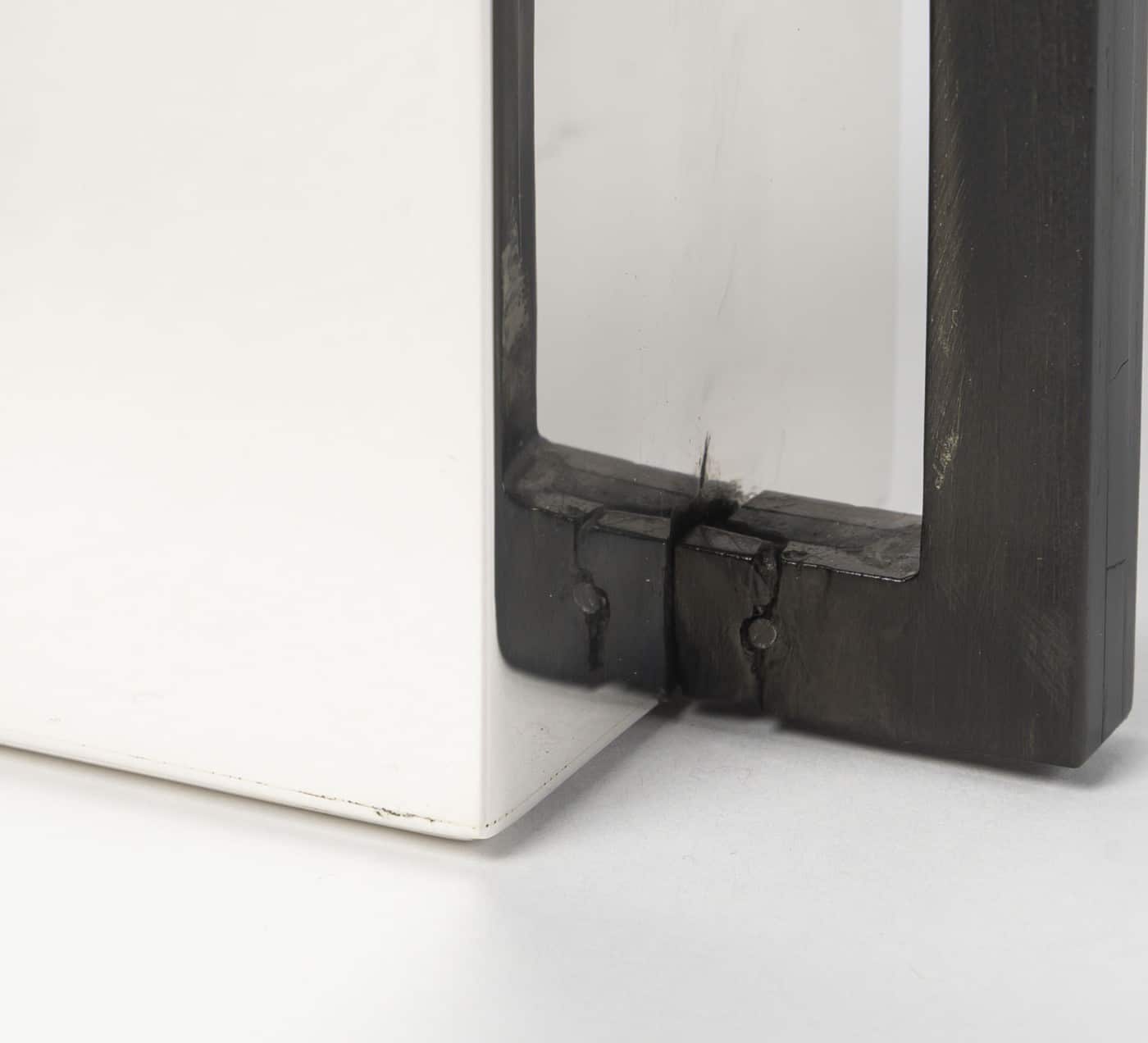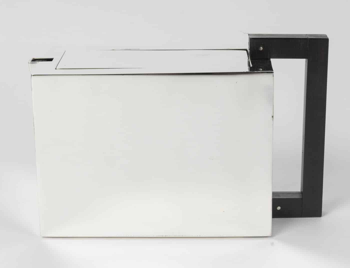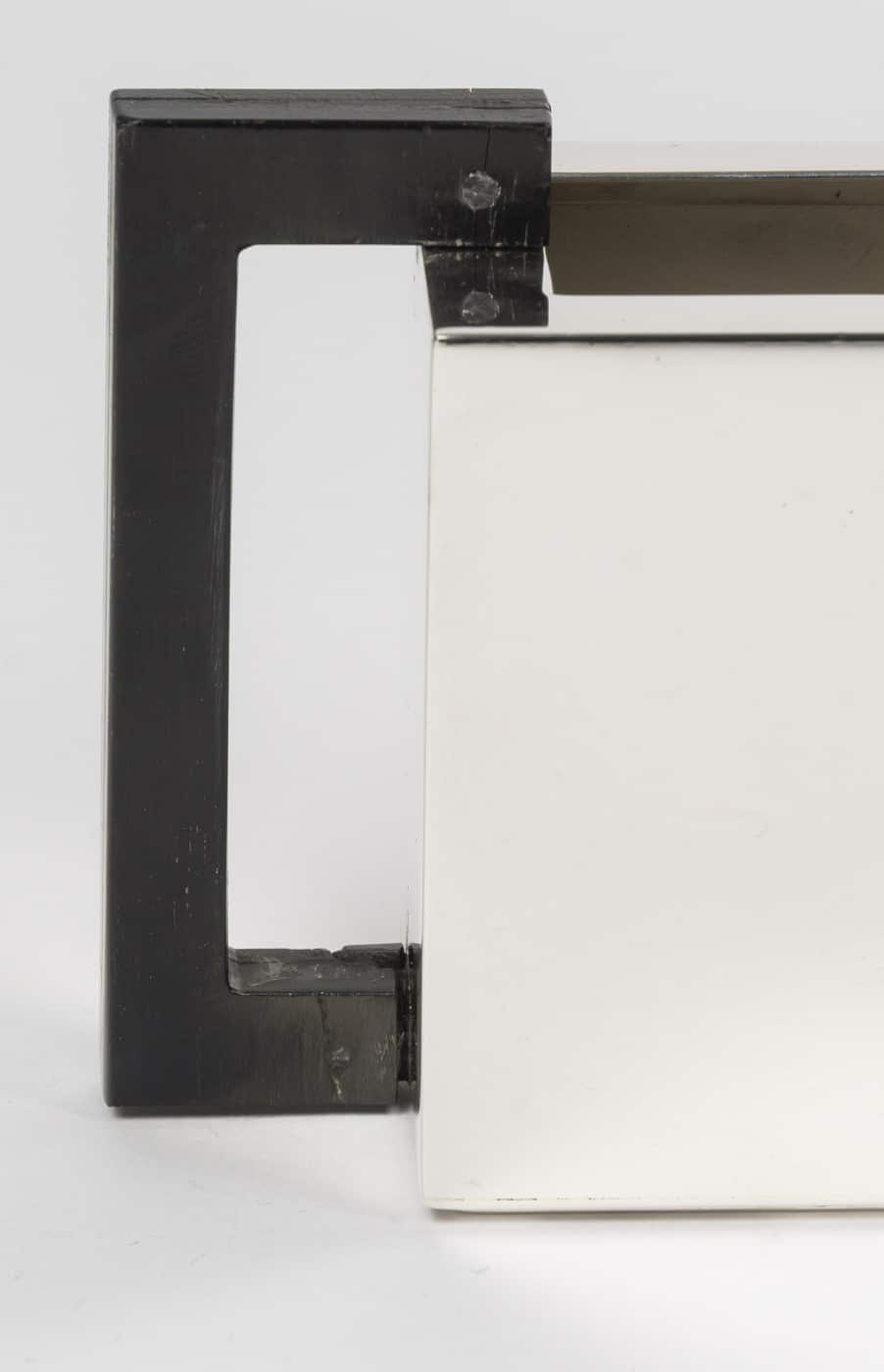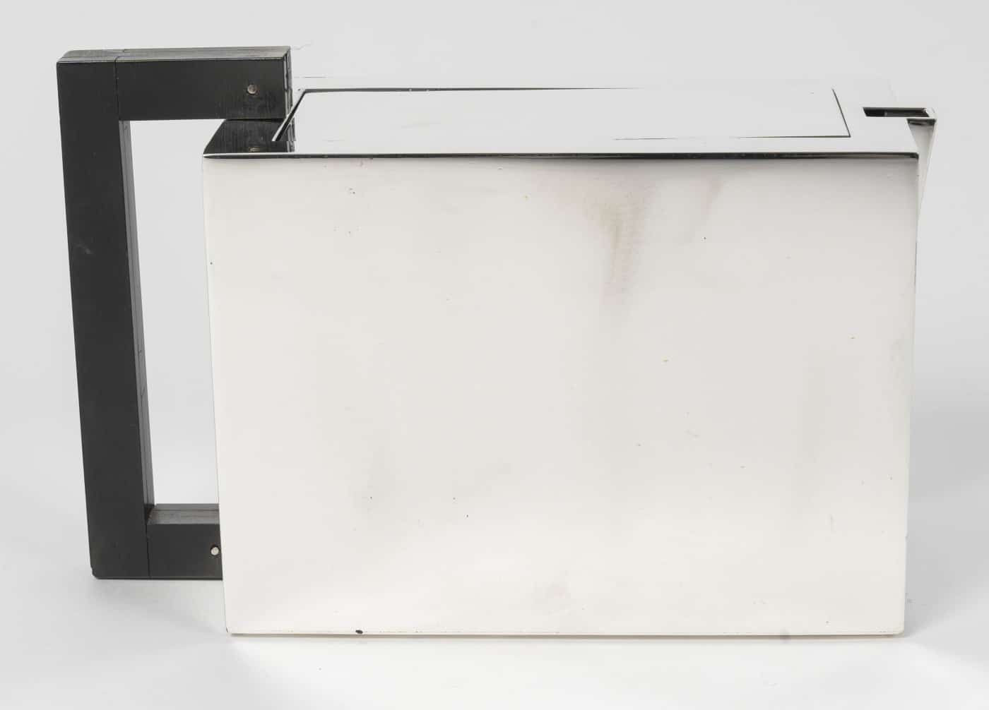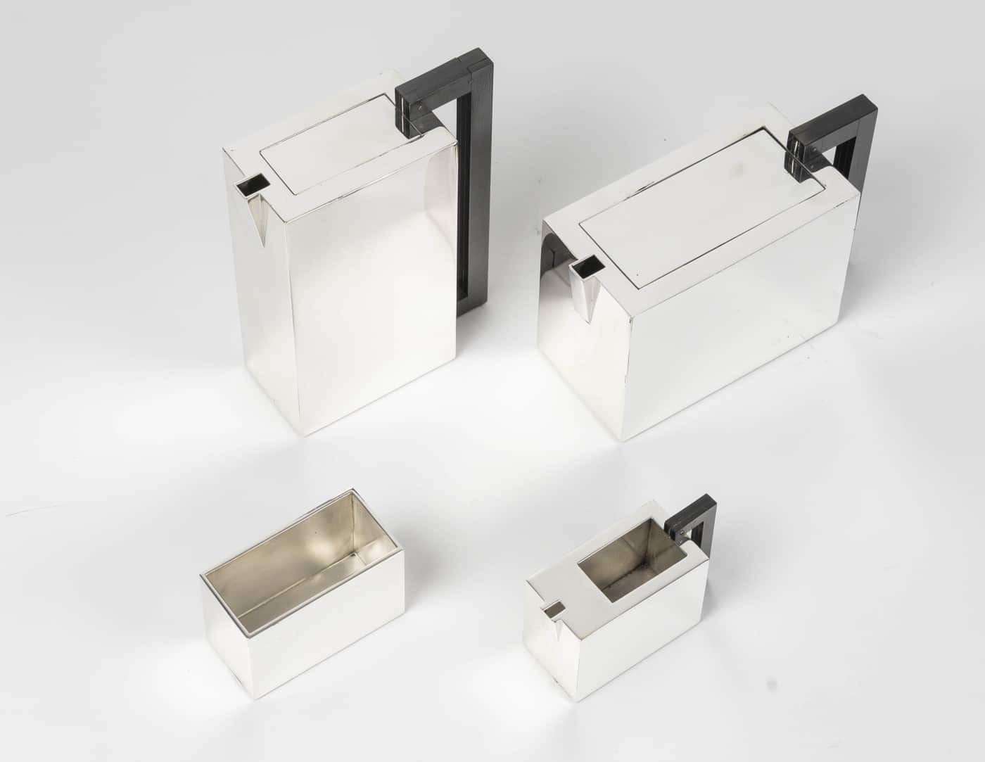 Silhouette architecturée, ligne verticale dominante et couvercle rectangulaire.
