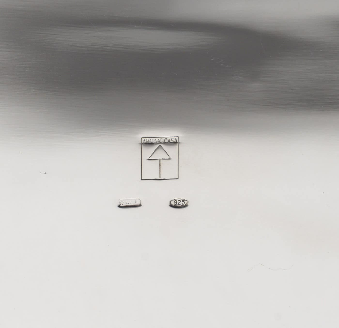 historisme : « Le service porte le poinçon ‘Armani Casa’, utilisé par la maison de design du groupe Giorgio Armani à partir des années 2000. Il est accompagné du poinçon ‘925’ garantissant l’argent massif, ainsi que d’un poinçon ovale d’orfèvre italien (partiellement lisible), typique des poinçons normalisés après 1968. Selon sa forme et la typographie, il pourrait correspondre à un atelier de la région de Vicenza ou de Padoue, zones traditionnellement associées à la fabrication d’argenterie contemporaine pour les maisons de luxe italiennes. La production peut être située dans les années 2000–2010. »