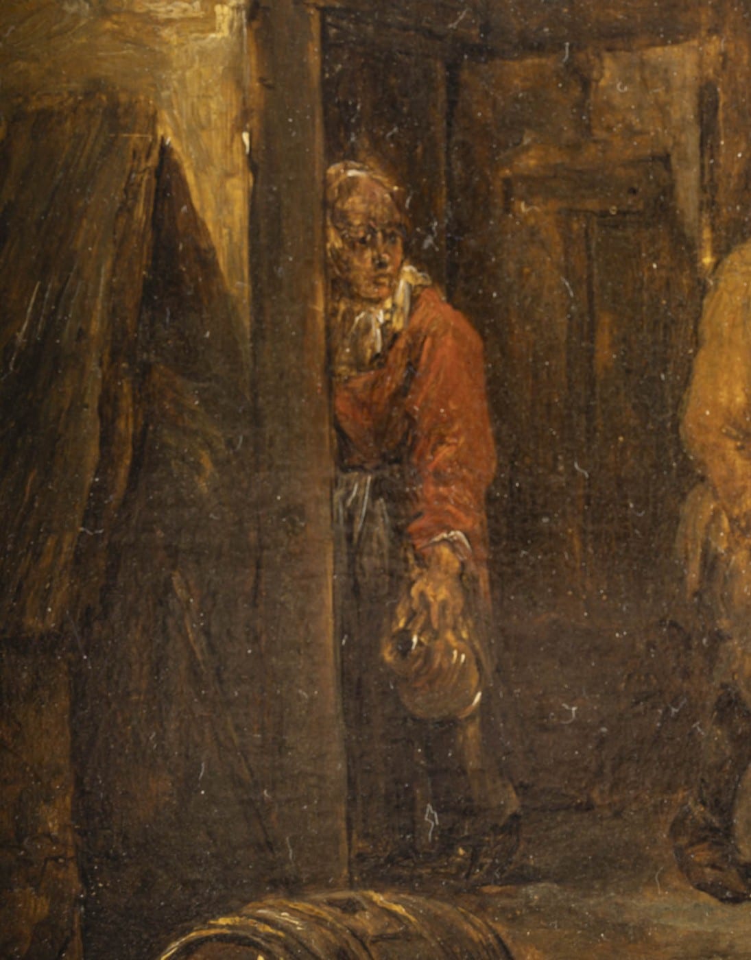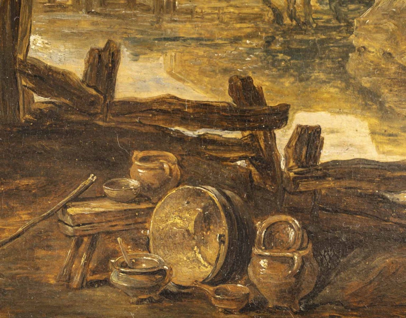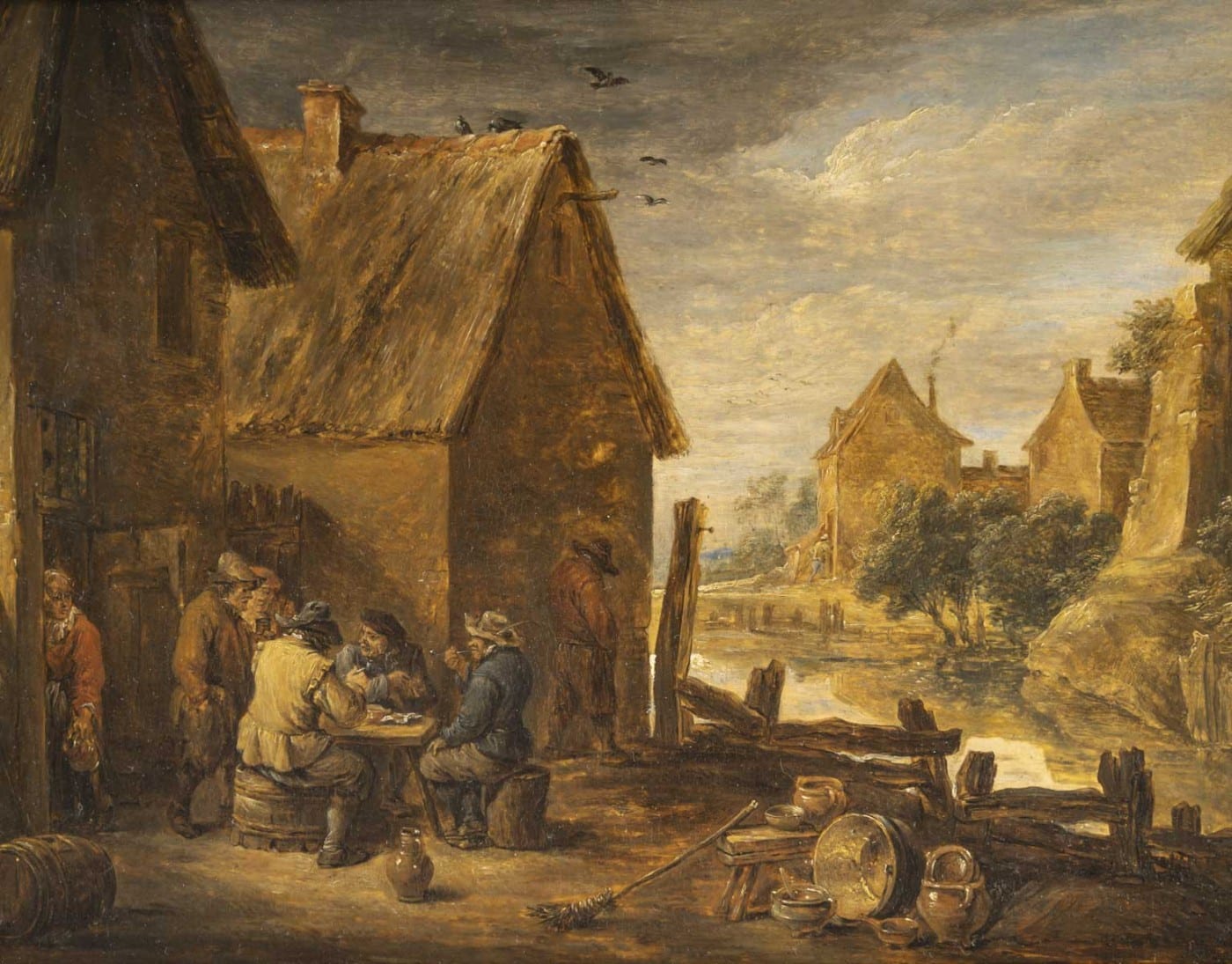 La scène se situe en extérieur devant la taverne, le paysage occupe une grande partie du tableau.