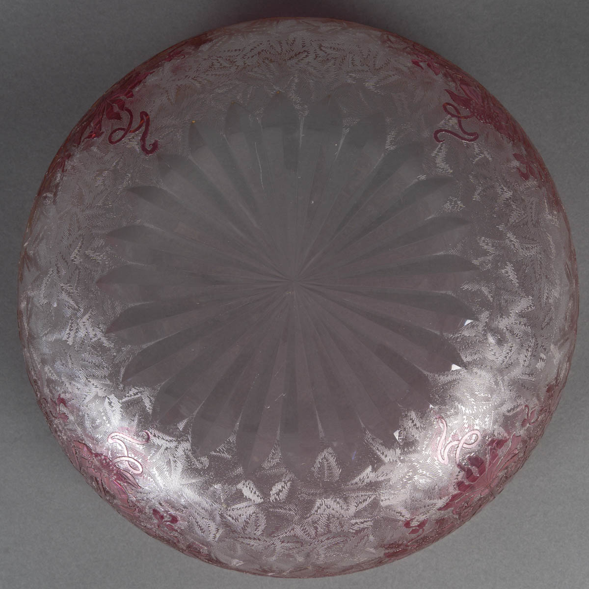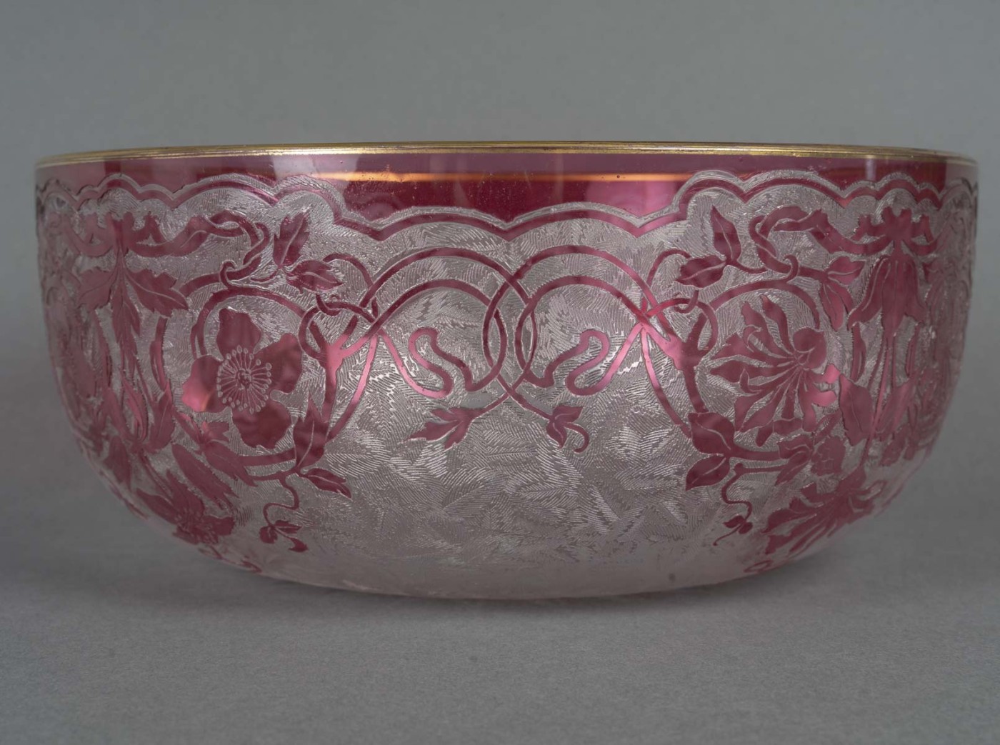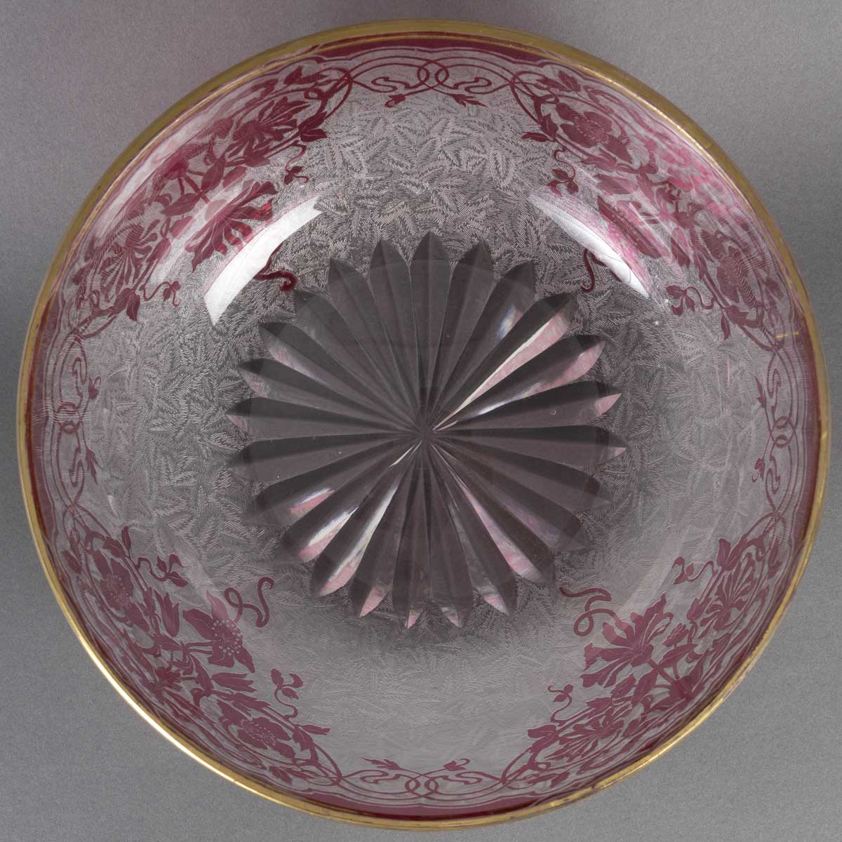 Coupe en cristal multicouche translucide et rose gravée à la roue, rythmée toute-face d’un décor de fleurs épanouies, la lèvre rehaussée d’un filet doré.
