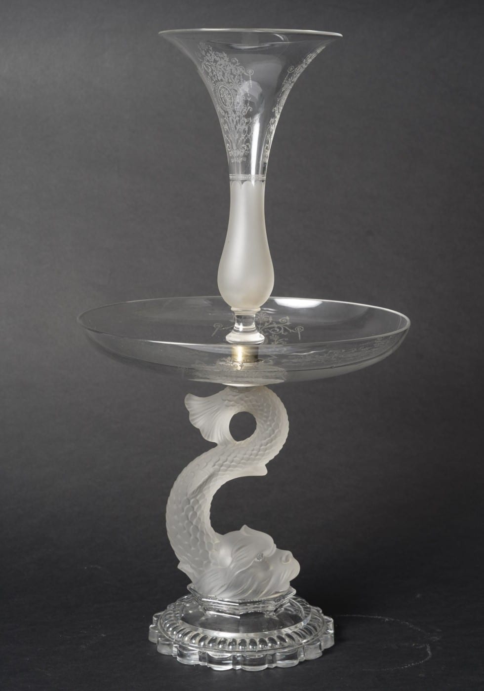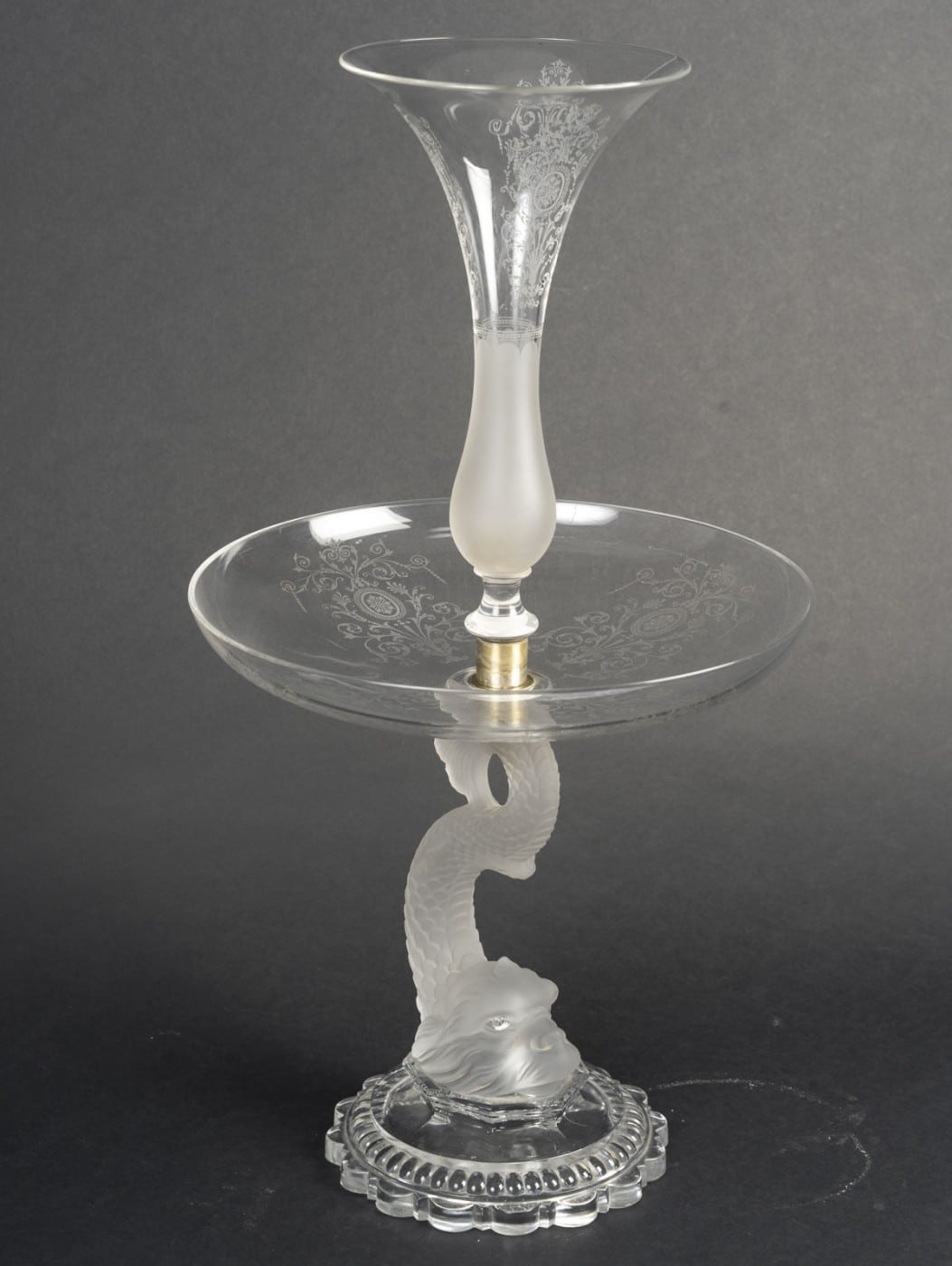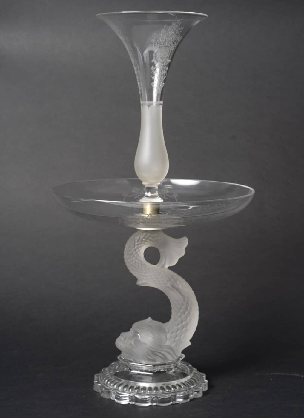 Élégant centre de table en cristal taillé et dépoli, reposant sur un piétement figurant un poisson stylisé aux lignes délicates.