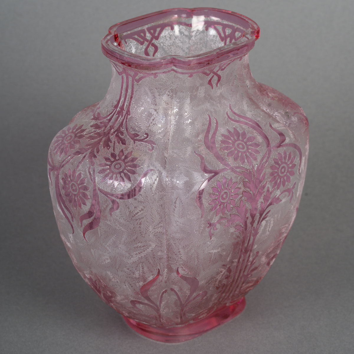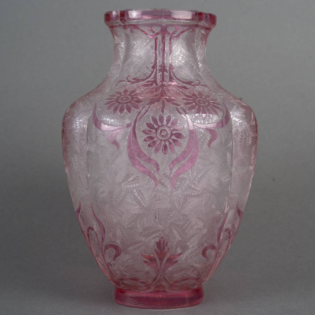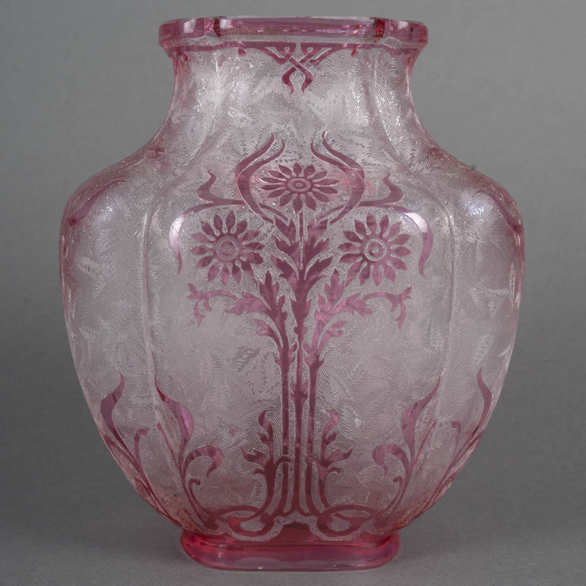 Vase en cristal multicouche translucide et rose gravé à la roue, rythmé toute-face d’un décor de fleurs épanouies.