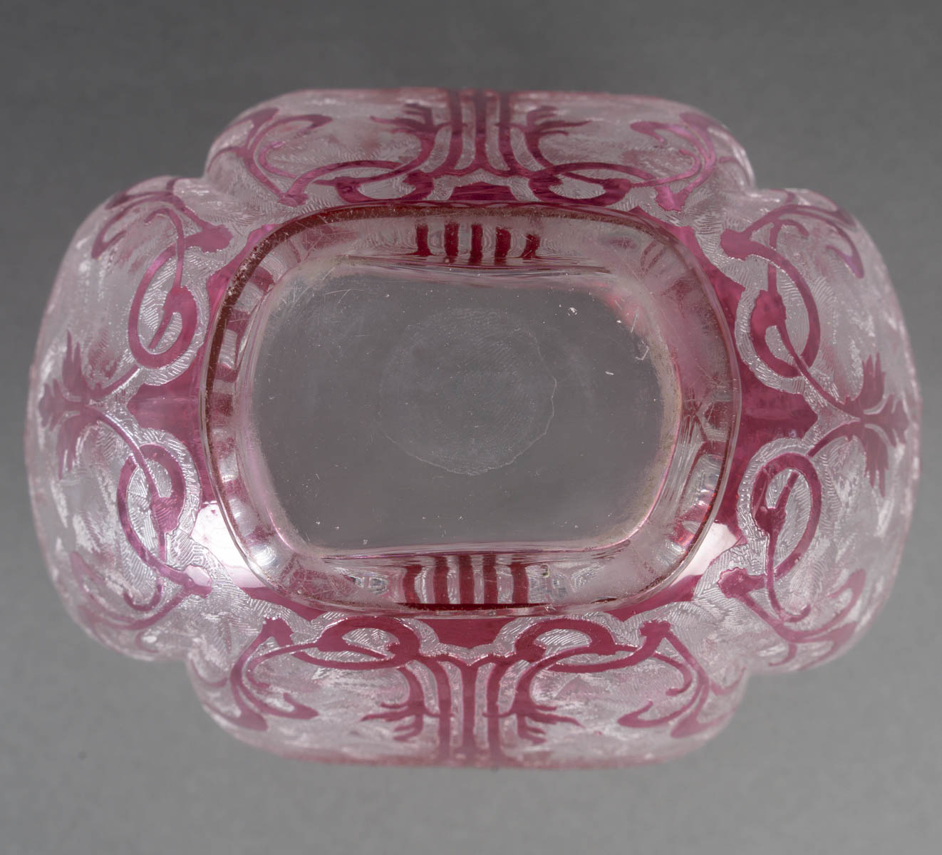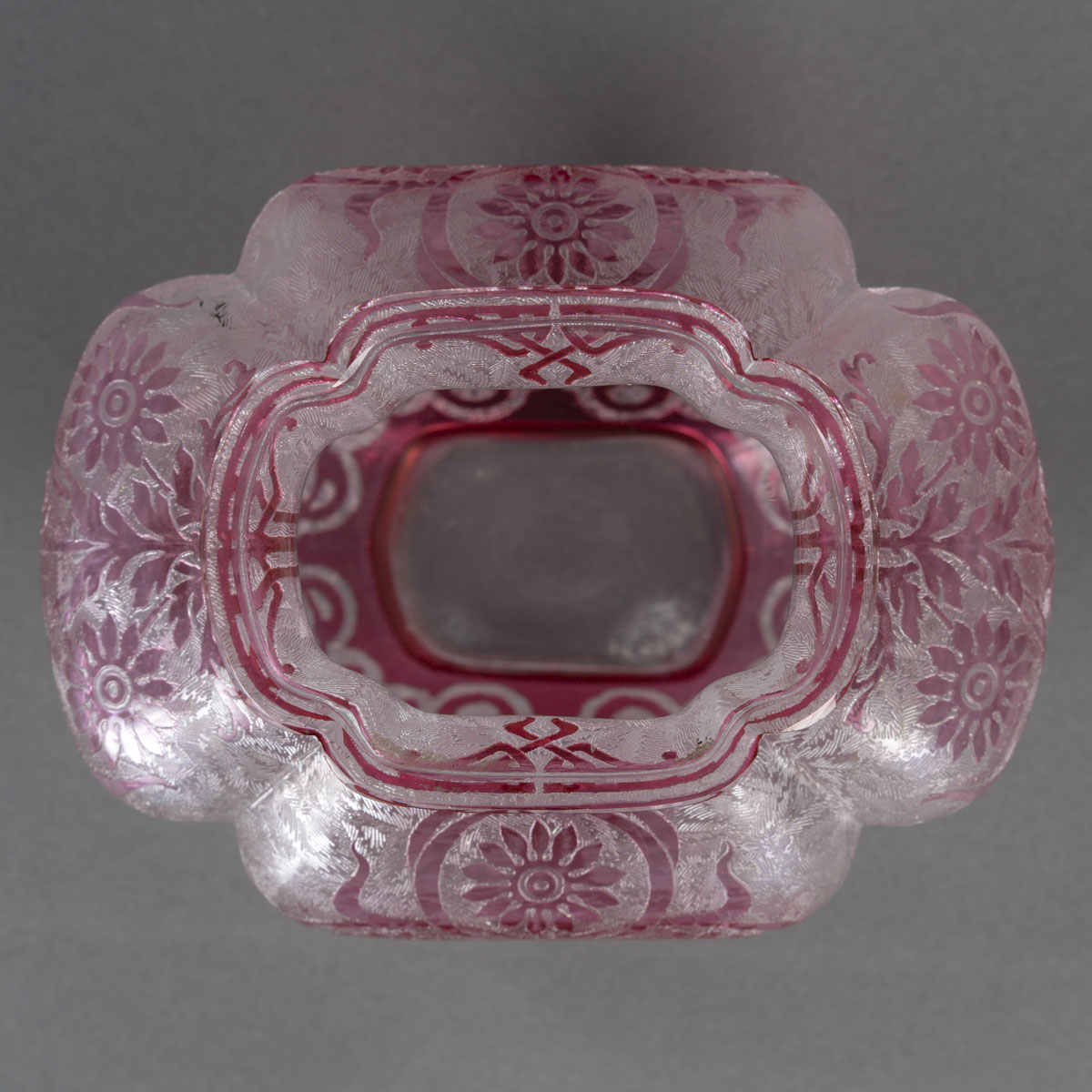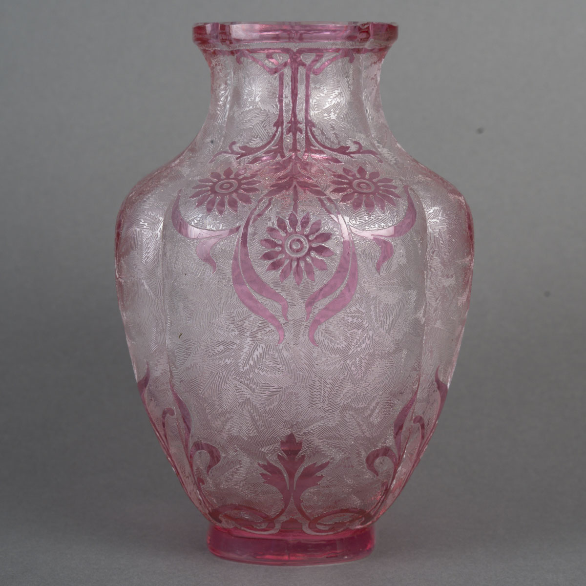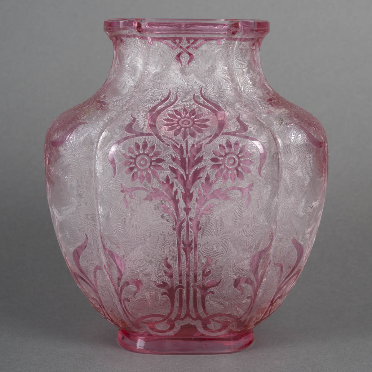 Vase en cristal multicouche translucide et rose gravé à la roue, rythmé toute-face d’un décor de fleurs épanouies.