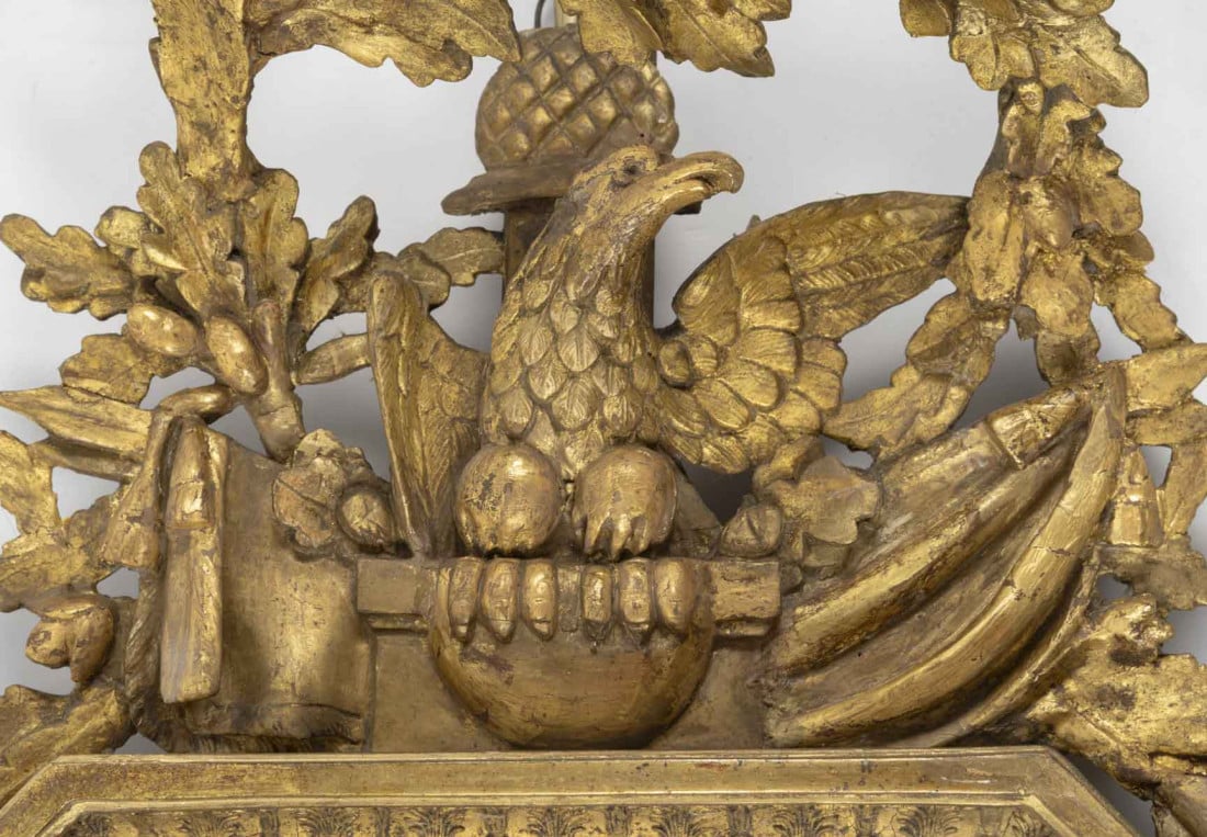 Orné d’un cadre en bois doré de forme octognale surmonté d’un fronton en bois doré et sculpté d’un aigle impérial sur un globe entouré d’une couronne de feuilles de chênes et de deux drapeaux.