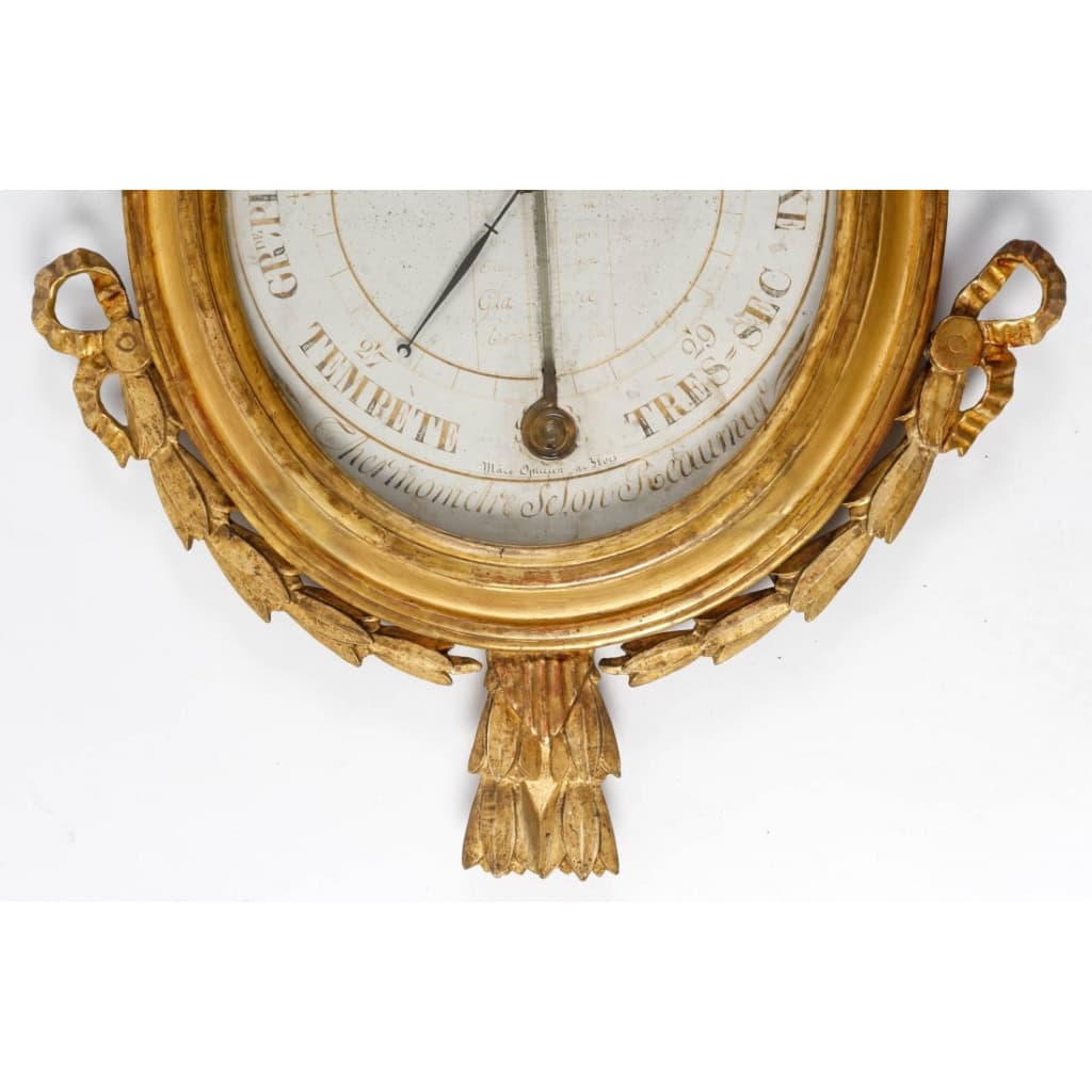 Baromètre – thermomètre d’époque Louis XVI en bois sculpté et doré décoré de feuilles de laurier. Son amortissement est décoré des attributs du jardinage entourés d’une couronne de feuilles de laurier. Intéressantes références historiques pour le thermomètre. La dorure est d’origine. Le mécanisme a été révisé.