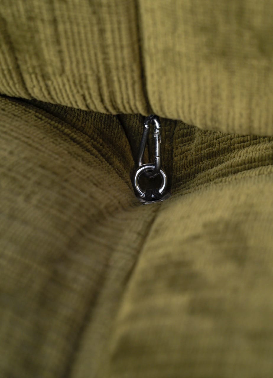 Tissu chenille, piètement hêtre naturel massif et anneaux laiton, mousqueton acier chromé brillant, déhoussable.