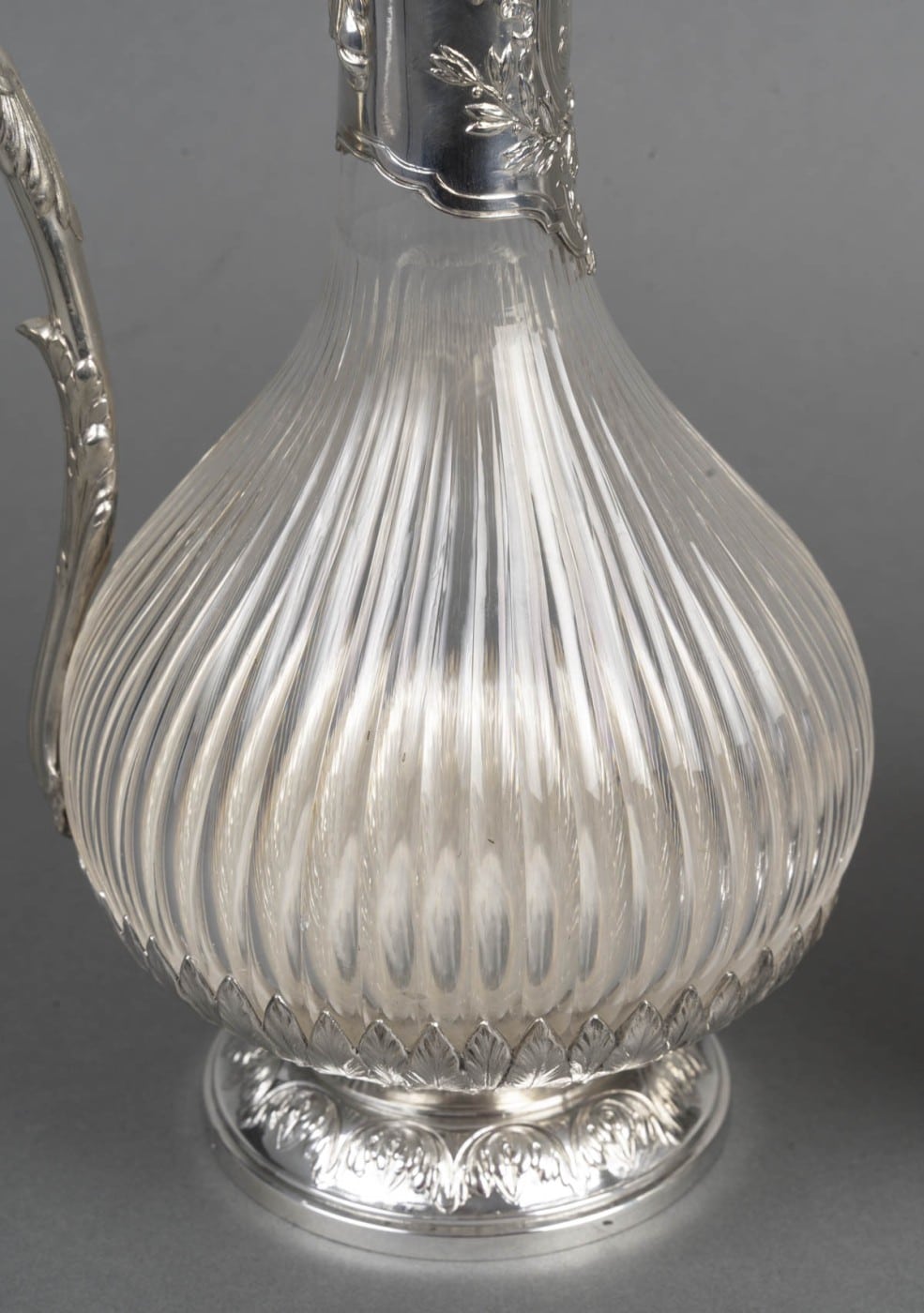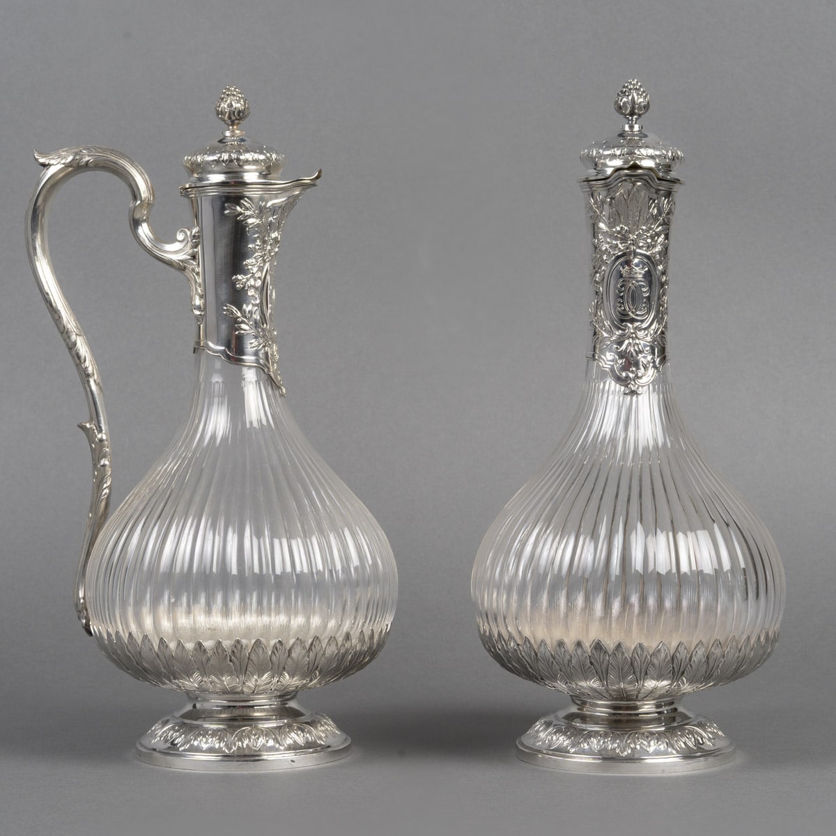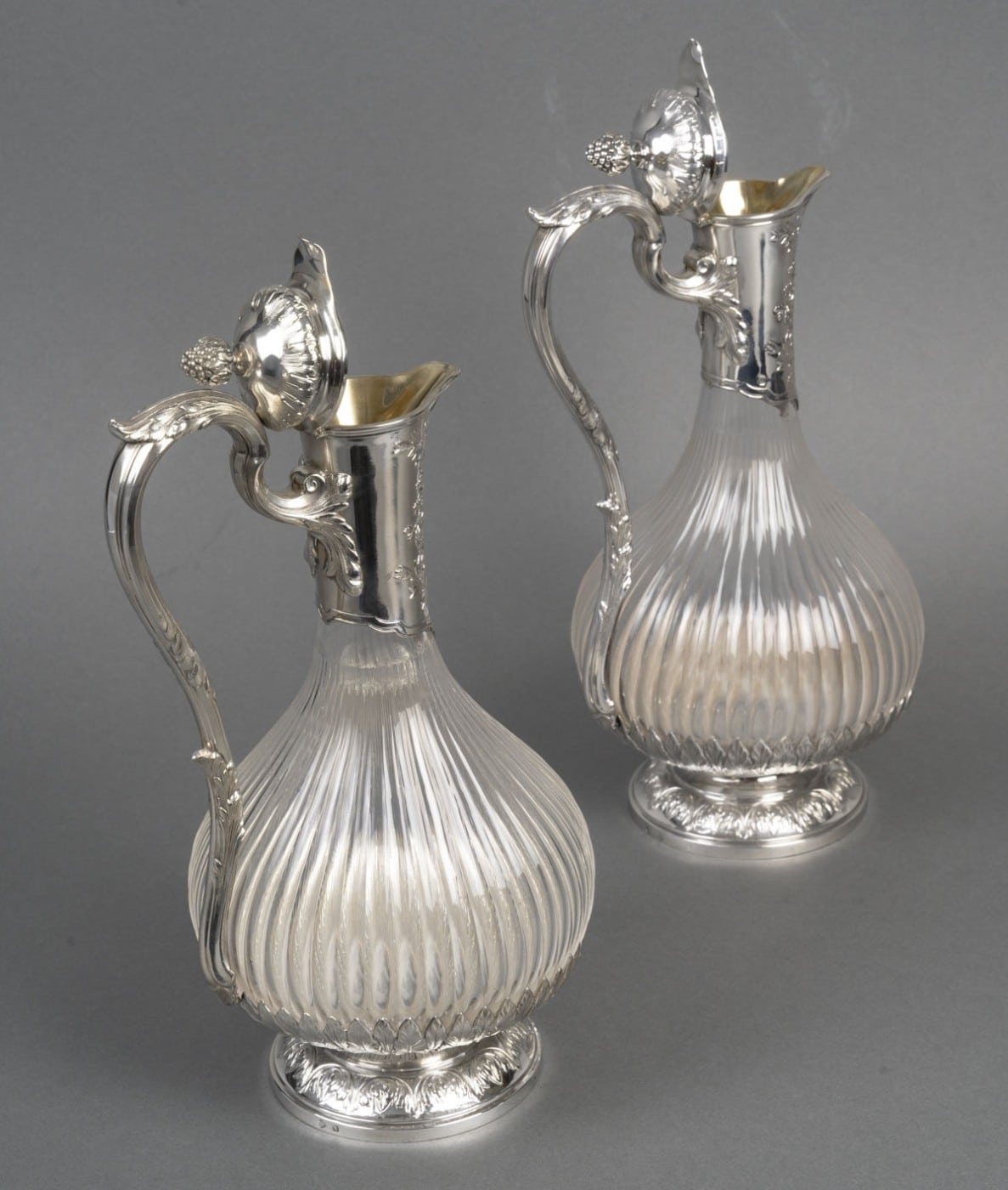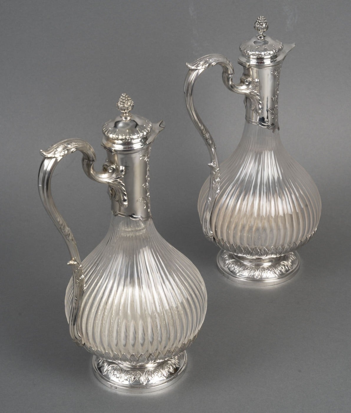 Élégante paire d’aiguières, en cristal soufflé et taillé en côtes torsadées, montée d’une riche orfèvrerie en argent massif finement ciselée. Les montures présentent un décor de rinceaux feuillagés, guirlandes fleuries et médaillons ovales encadrés de motifs Rocaille.