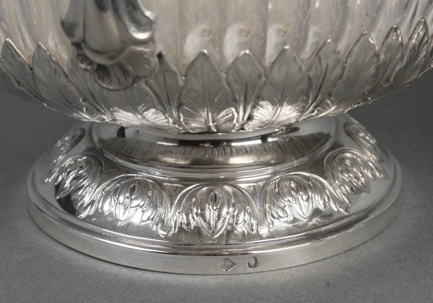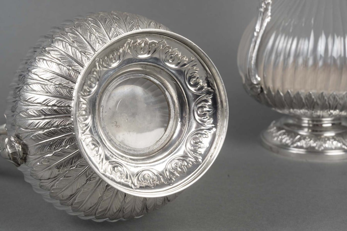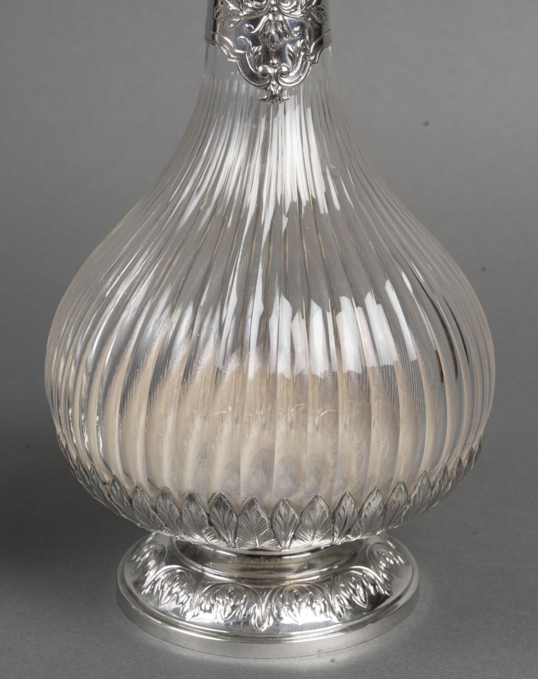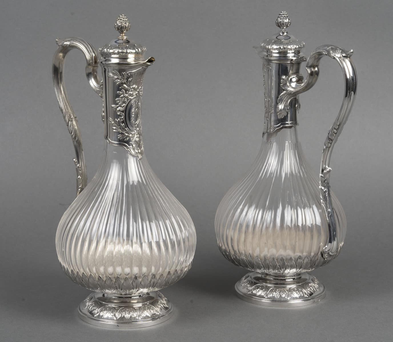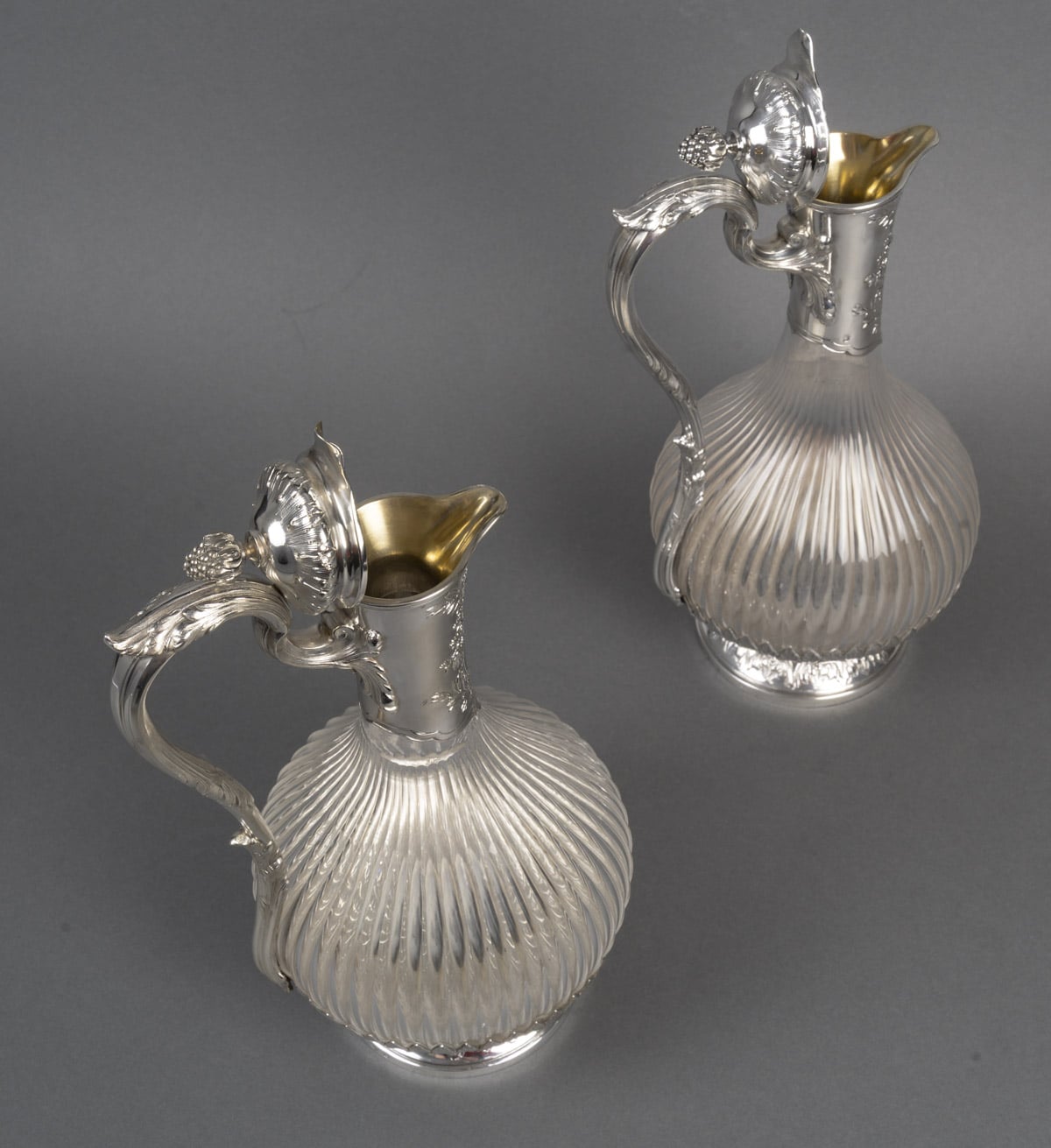 Élégante paire d’aiguières, en cristal soufflé et taillé en côtes torsadées, montée d’une riche orfèvrerie en argent massif finement ciselée. Les montures présentent un décor de rinceaux feuillagés, guirlandes fleuries et médaillons ovales encadrés de motifs Rocaille.