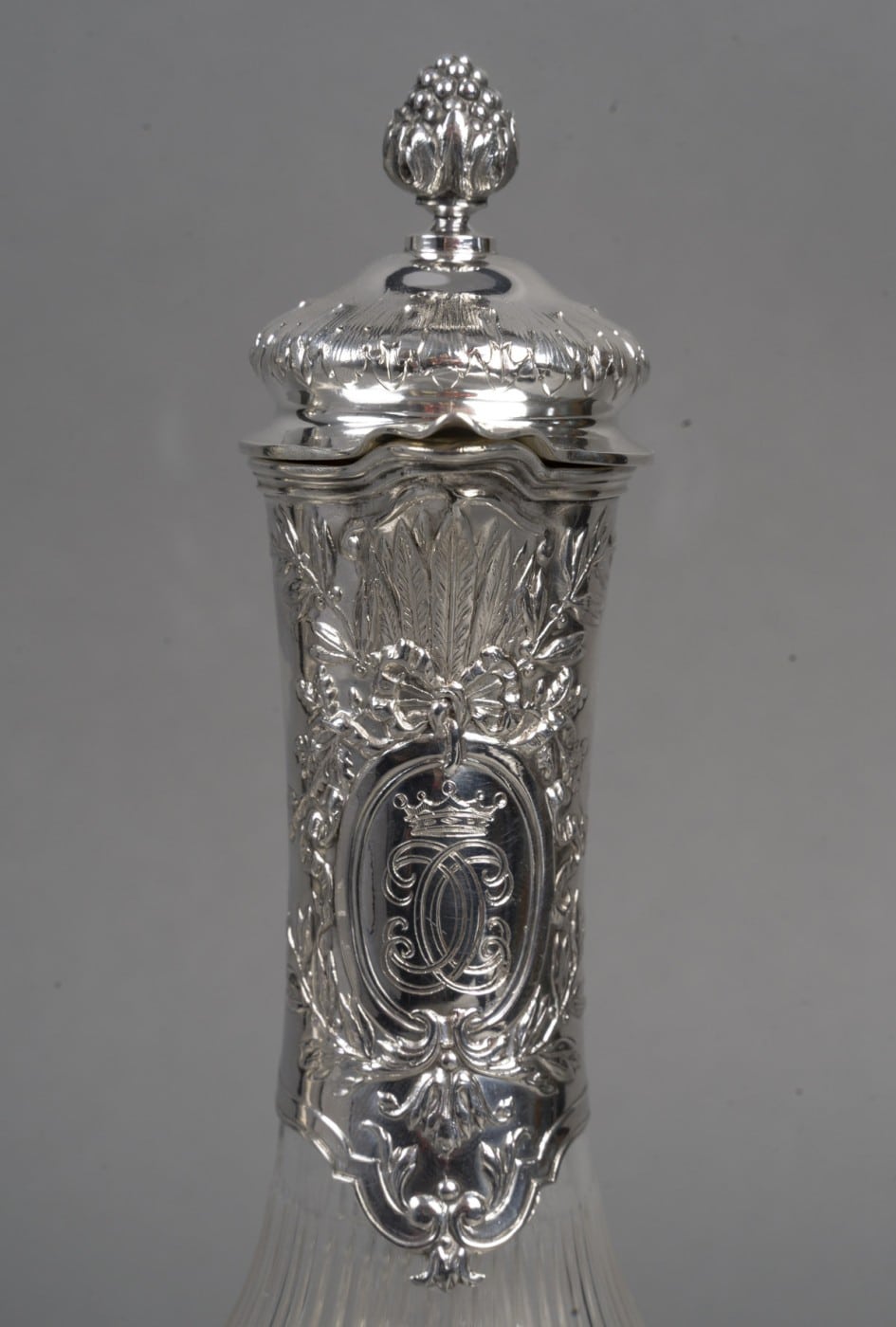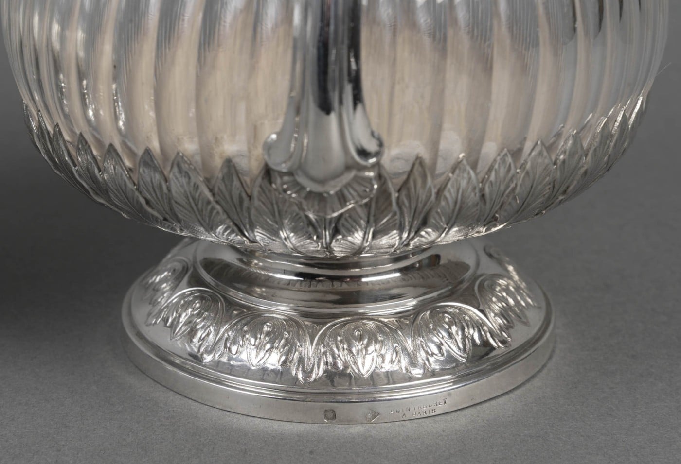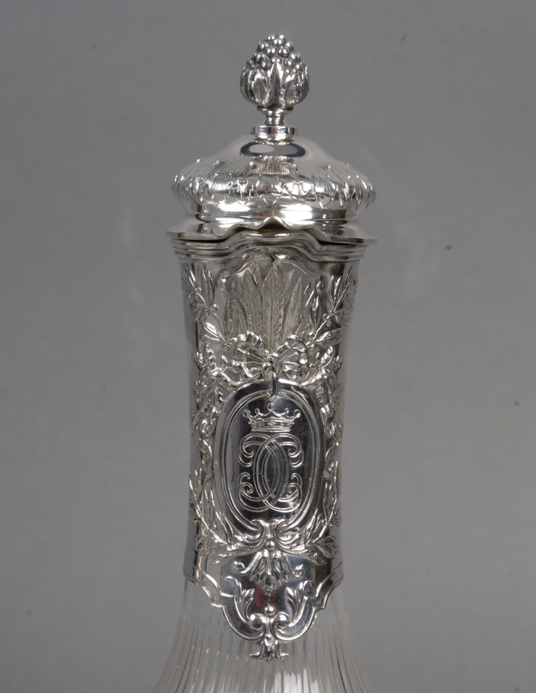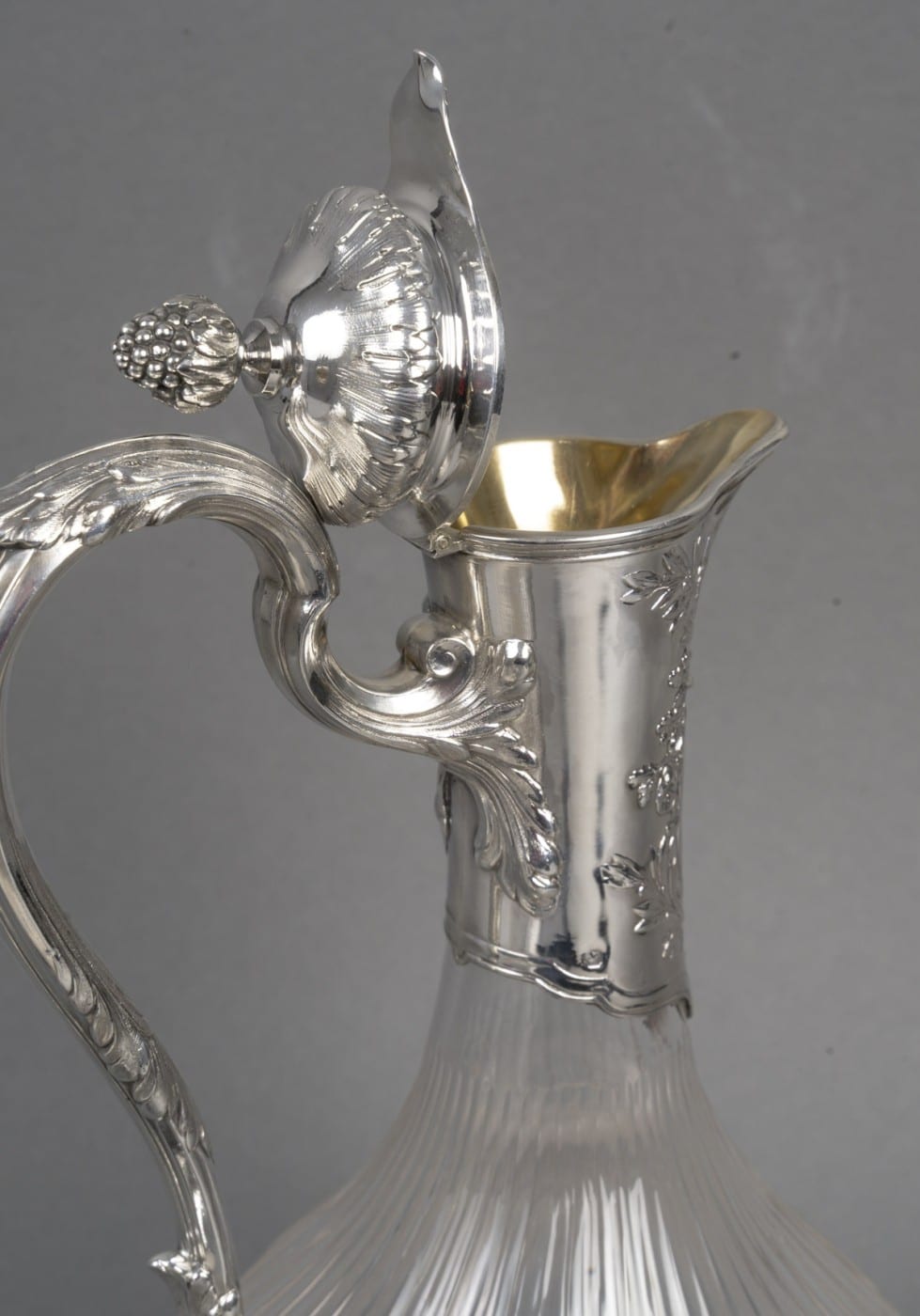 Ce type d’aiguières illustre le raffinement des arts de la table sous la Troisième République, où les orfèvres français – dans la lignée de Froment-Meurice, Odiot ou Cardeilhac – marient la transparence du cristal à la richesse décorative de l’argent massif.