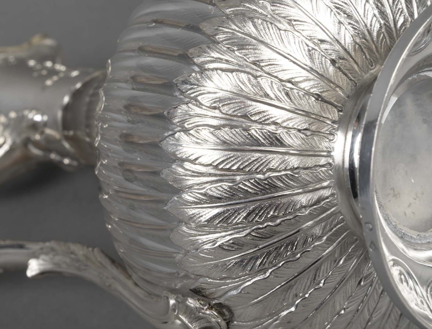 Les couvercles à charnière sont surmontés de fruits sculptés en graine ; les anses sinueuses adoptent une ligne gracieuse et équilibrée. Les piédouches sont ornés d’un délicat motif de feuilles d’acanthe et de palmettes, typique du goût Néo-Louis XV de la fin du XIXᵉ siècle.