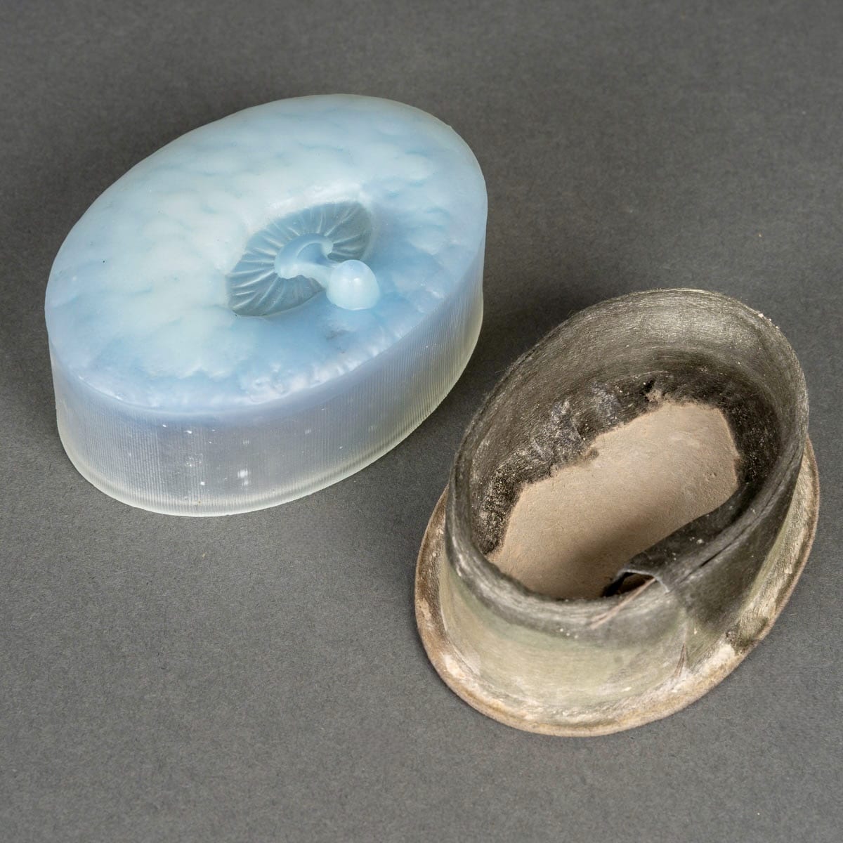 Boîte « Corail Rouge », « La Perle Noire » en verre opalescent patiné bleu de René Lalique créée en 1927 pour Forvil.