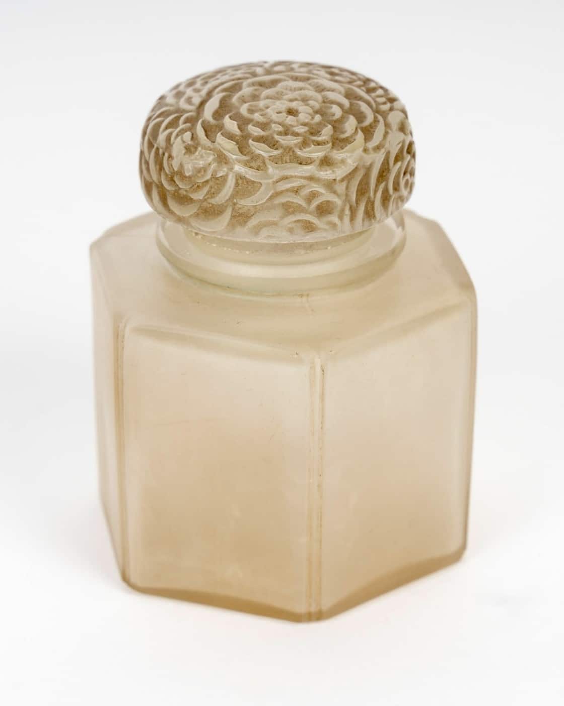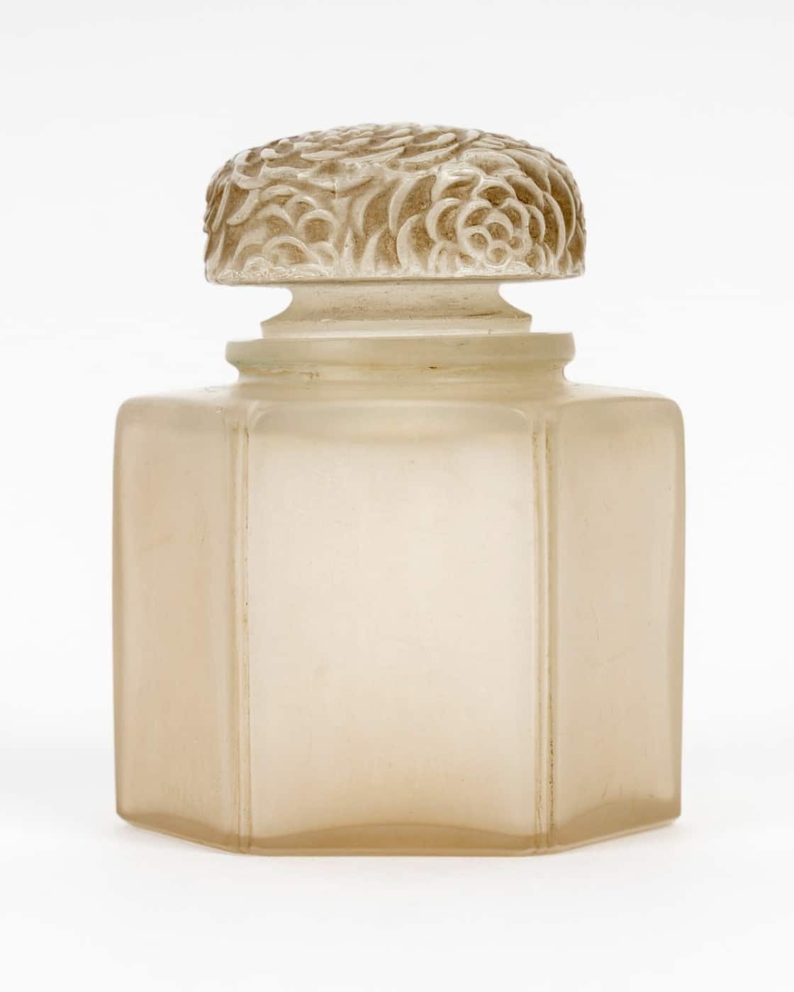 Boîte Pot à Crème « Chrysanthème » en verre blanc patiné sépia de René Lalique créé en 1913.