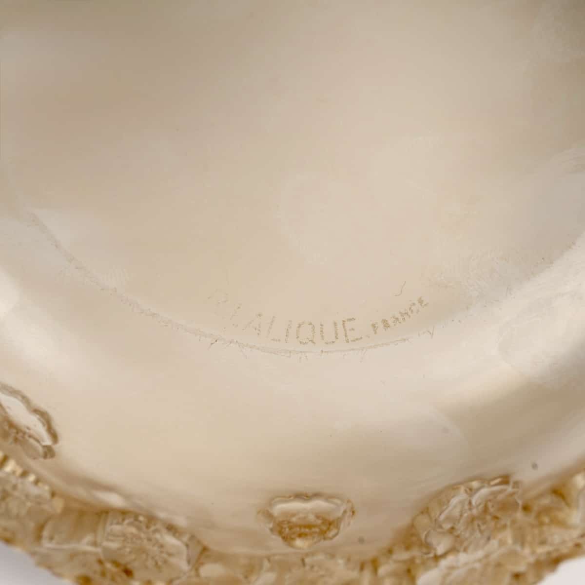 Boîte « Primevères » en verre blanc patiné sépia de René Lalique créée en 1927.