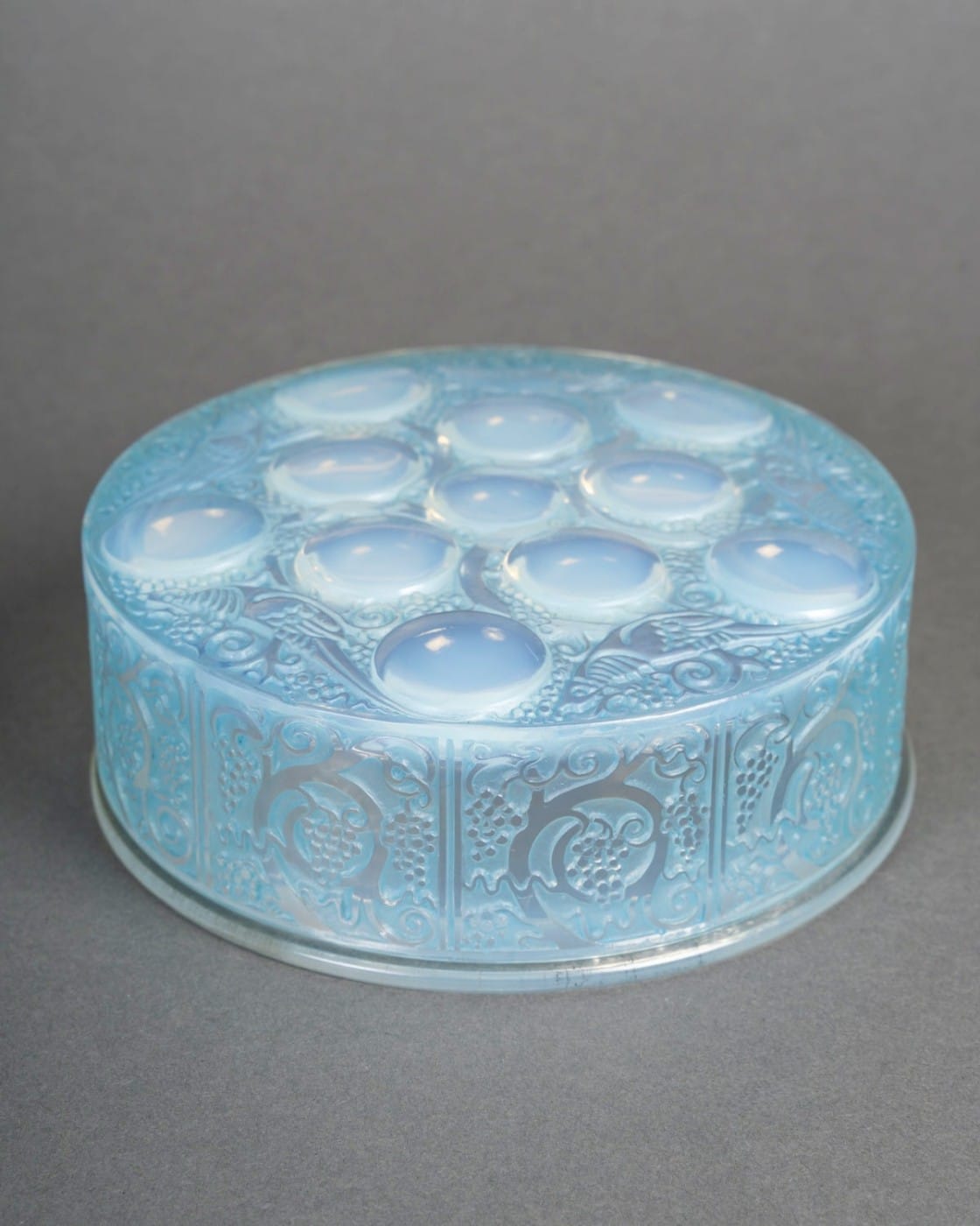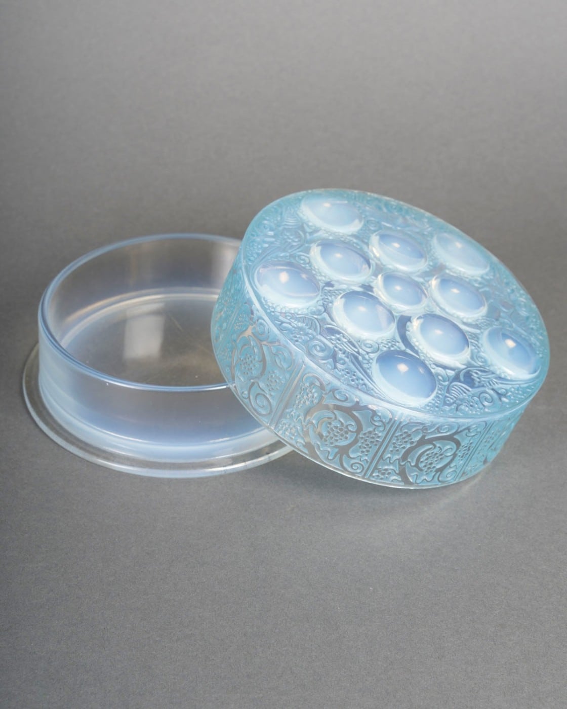 Boîte « Roger » en verre opalescent patiné bleu de René Lalique créée en 1926.