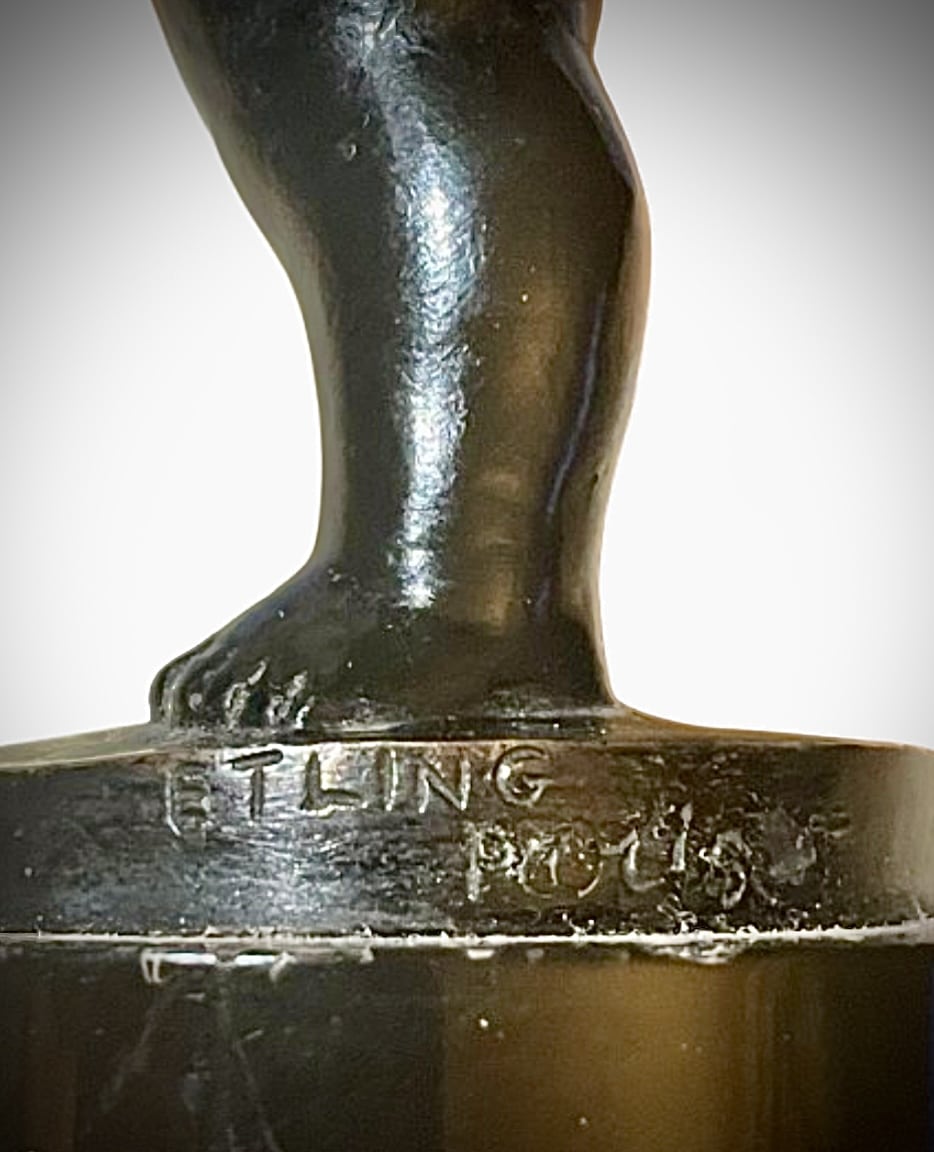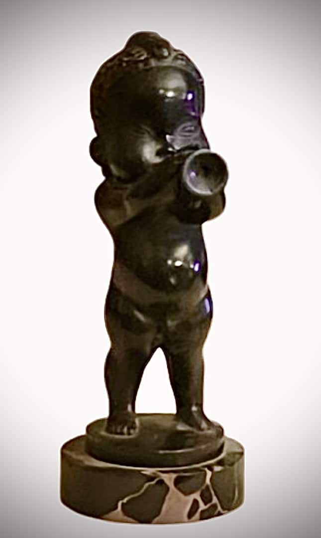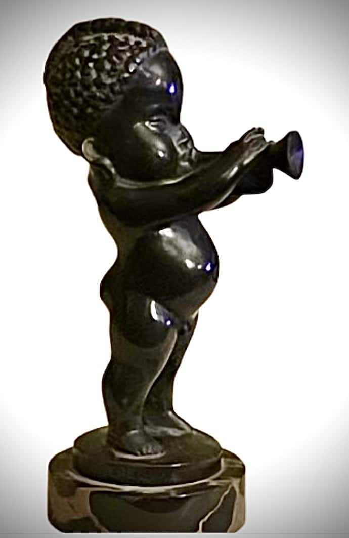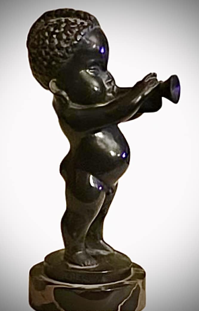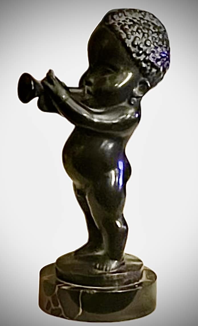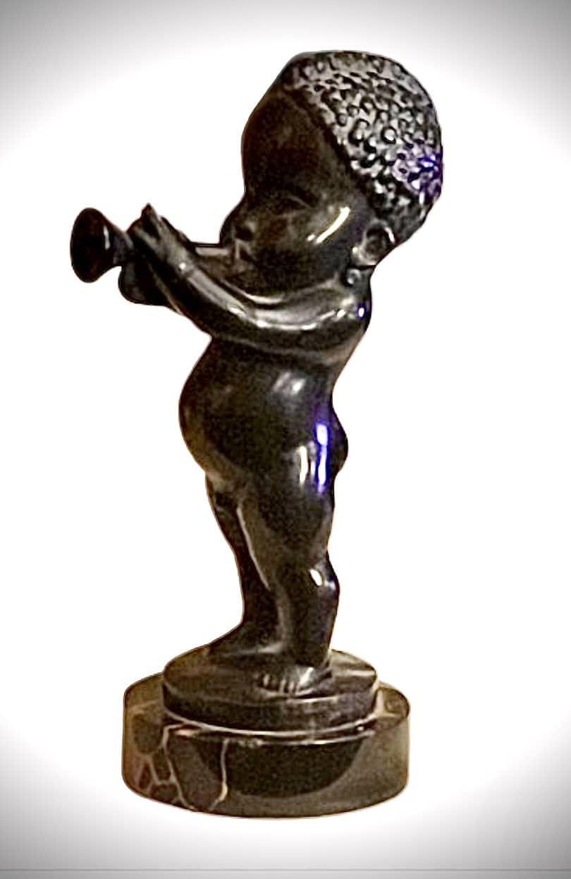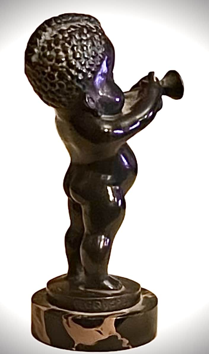 RARE BOUCHON DE RADIATEUR MASCOTTE AUTOMOBILE REPRÉSENTANT UN PETIT JOUEUR DE CORNET ( PEUT ÊTRE LOUIS ARMSTRONG JEUNE ) EN BRONZE SIGNÉ DE BECQUEREL FONDEUR ETLING