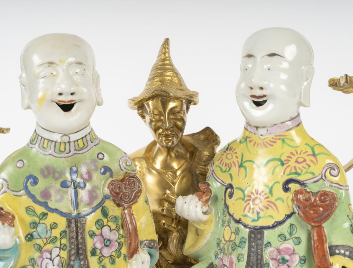 Bougeoir en bronze doré formé d’un couple de personnages riants en porcelaine, dans une monture en bronze figurant des rinceaux.