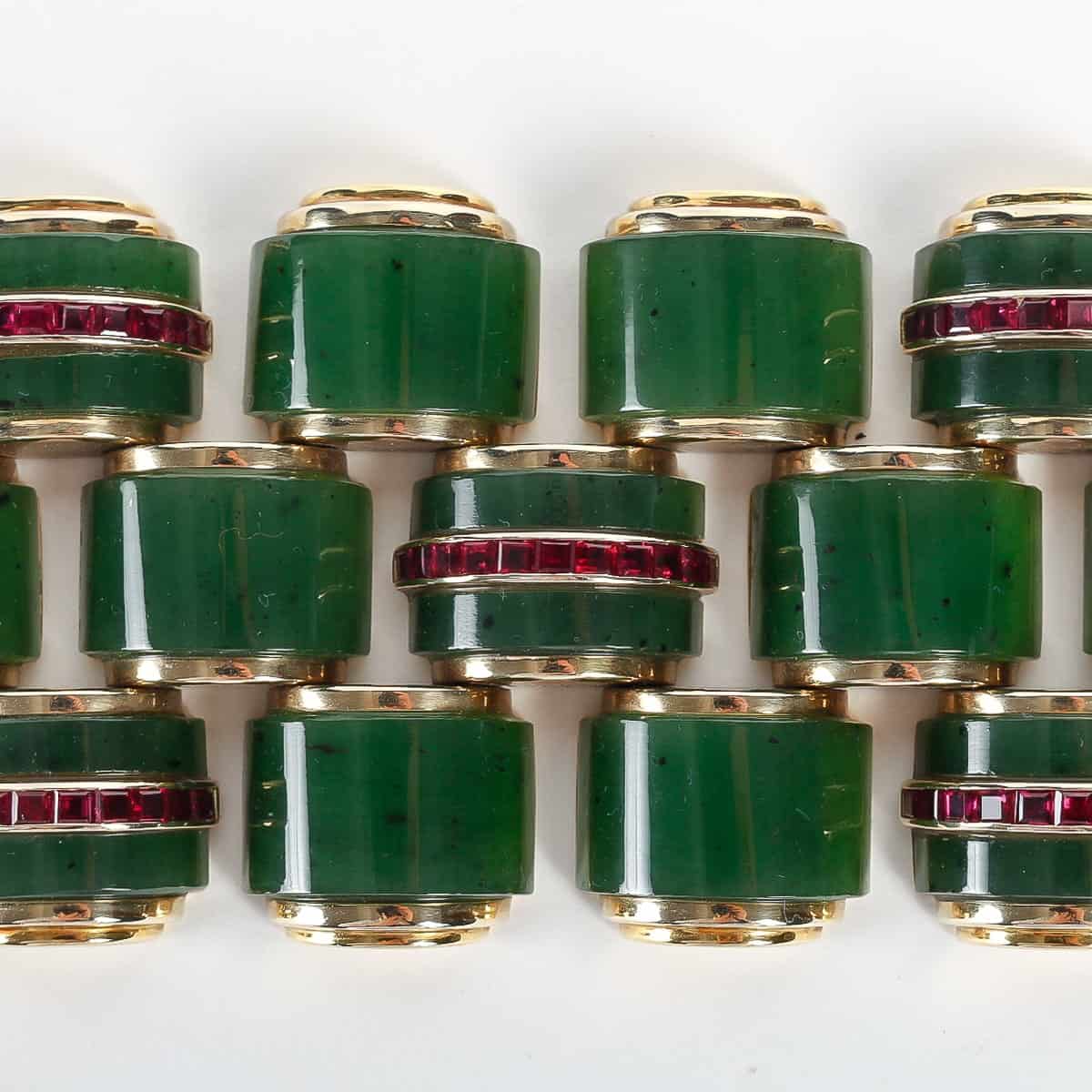 Bracelet « Tank » en or jaune, jade et rubis calibrés créé par Puiforcat. Typiquement Art-Déco.