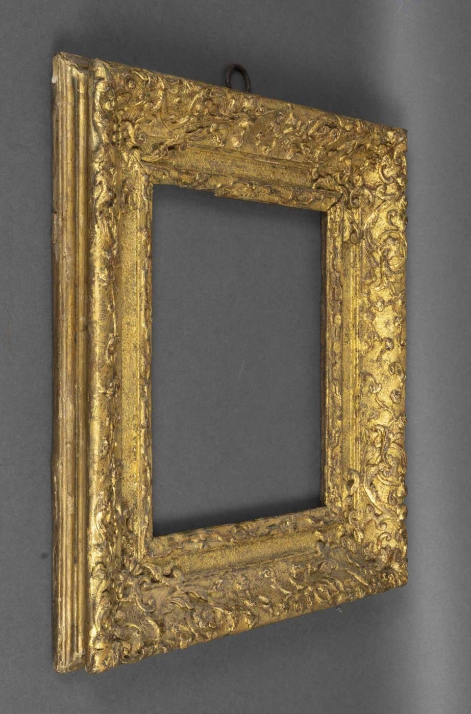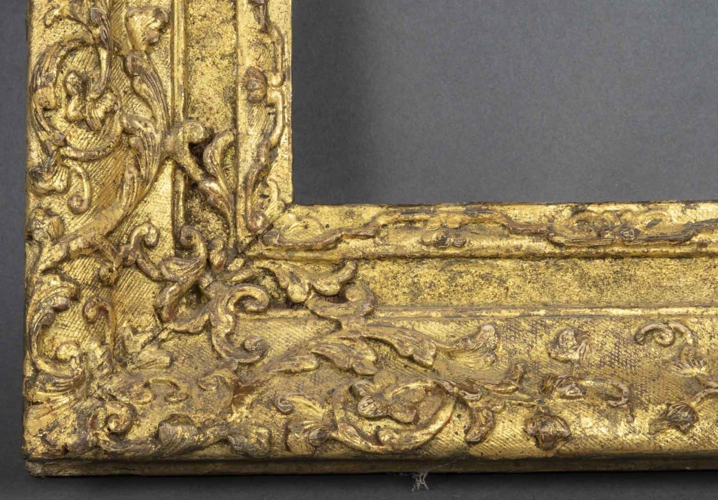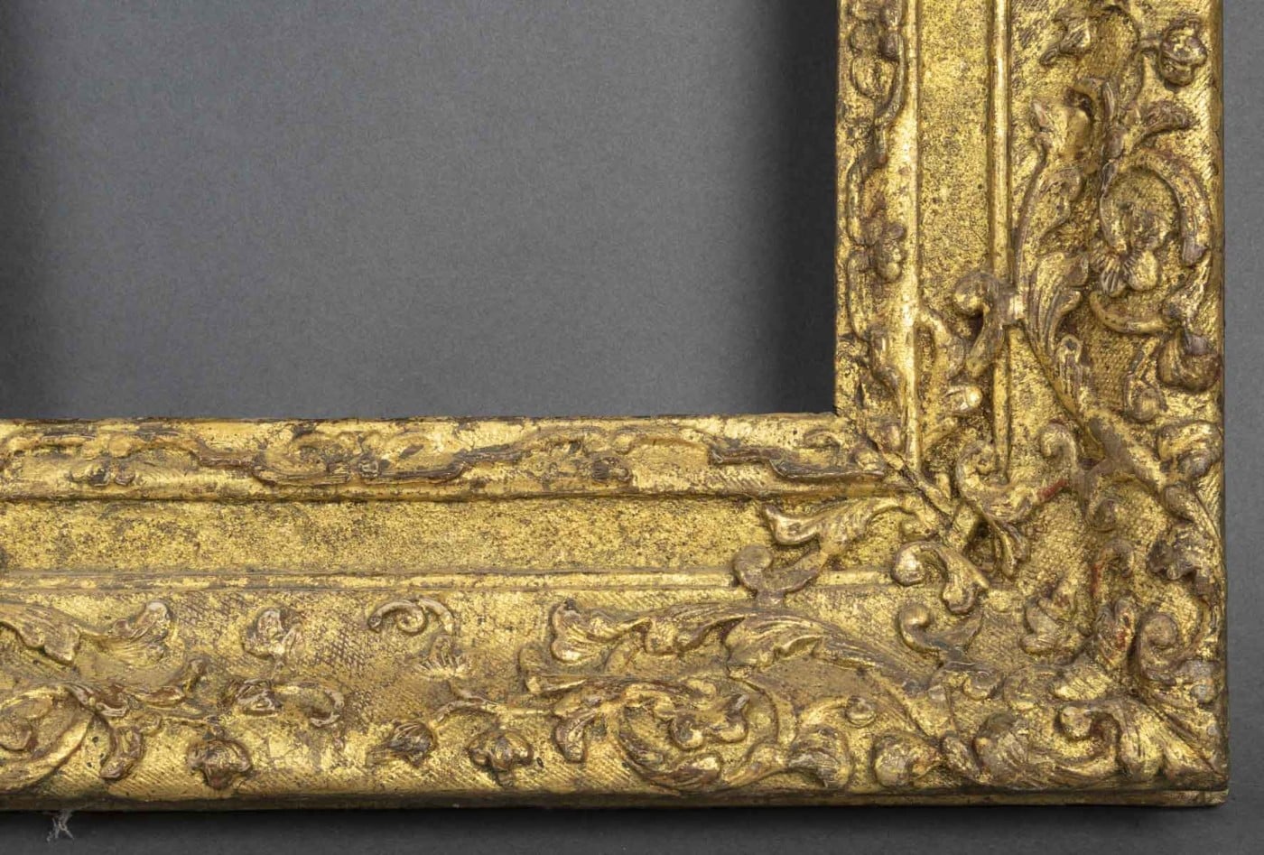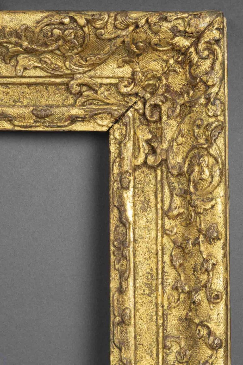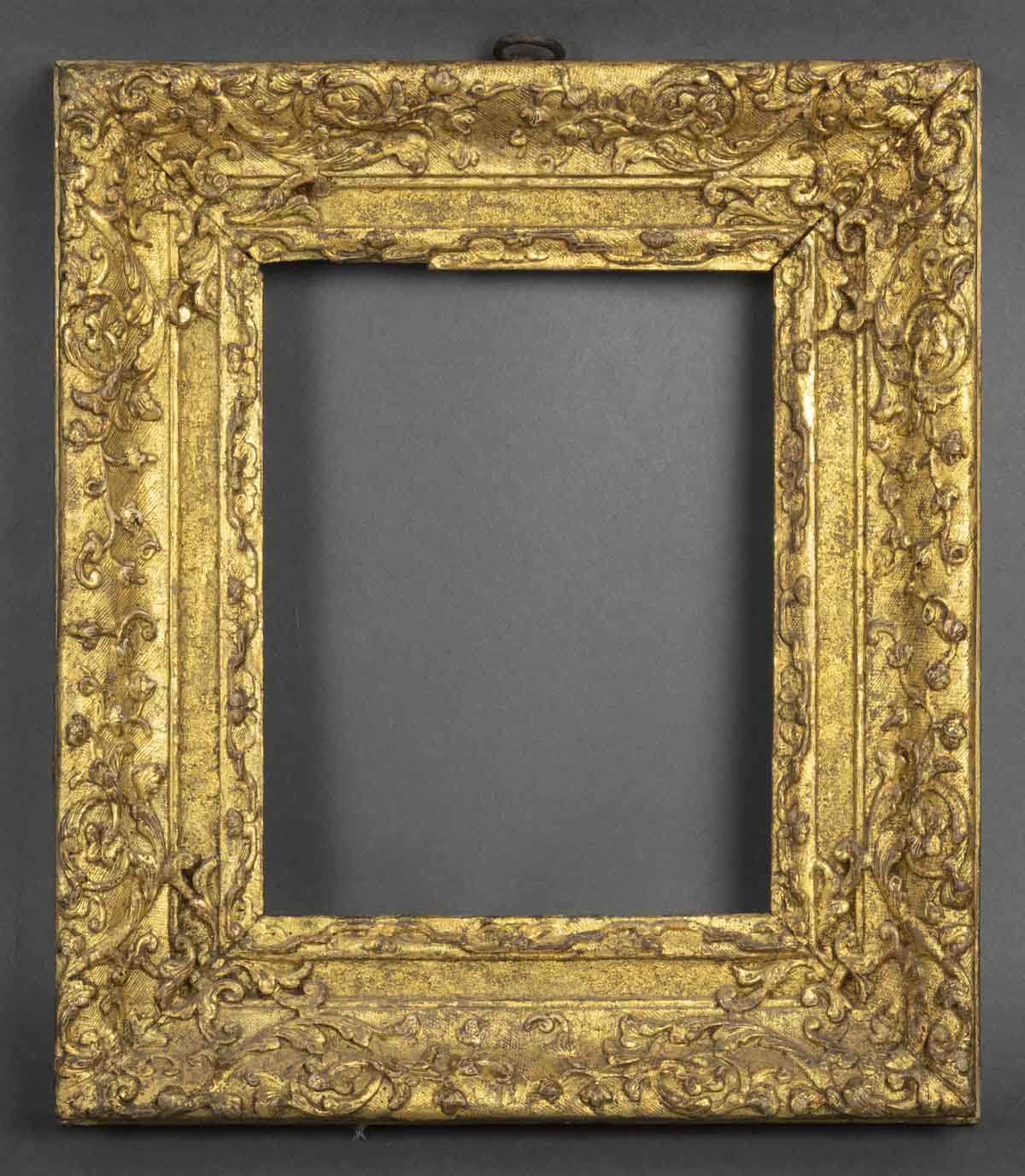 Cadre en chêne sculpté, doré à décor de frises de lambrequins, culots, enroulements de feuilles et fleurs d’acanthe.
