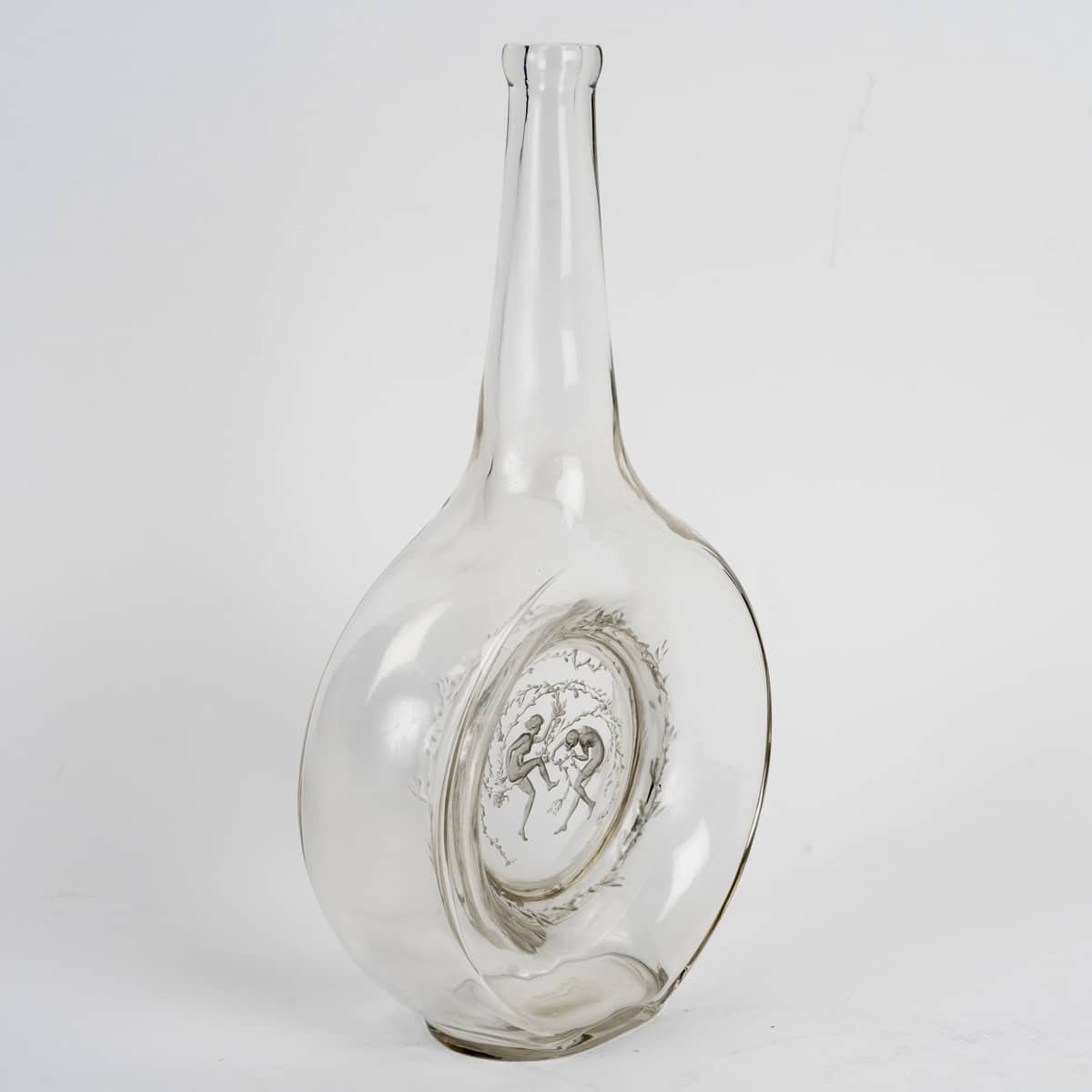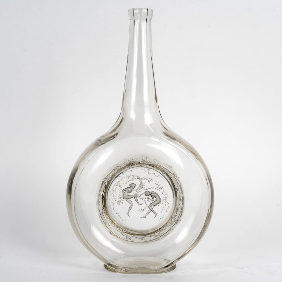 Carafe « Deux Danseuses » en verre blanc patiné bleu de René Lalique créée en 1912.