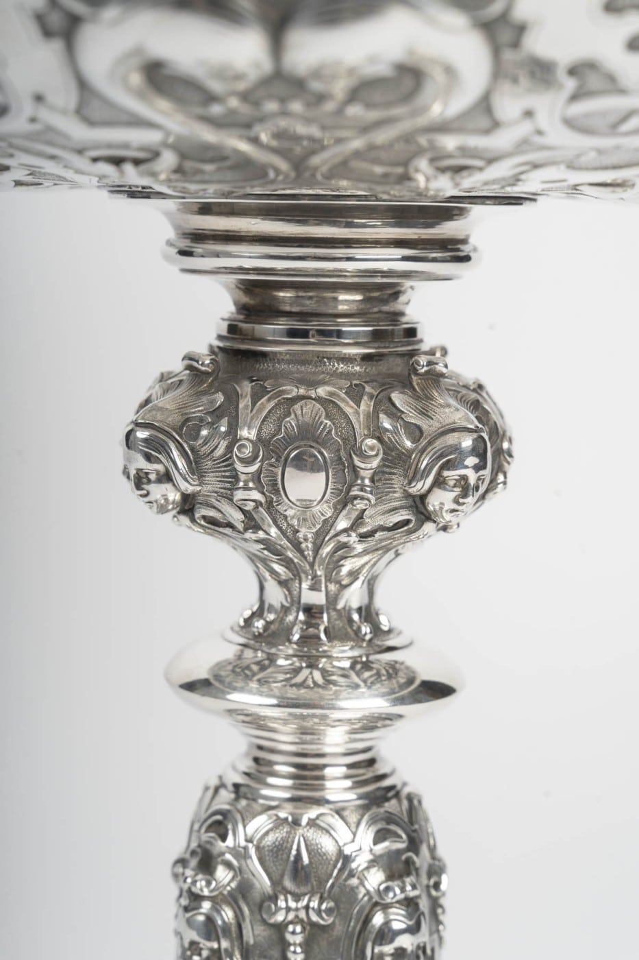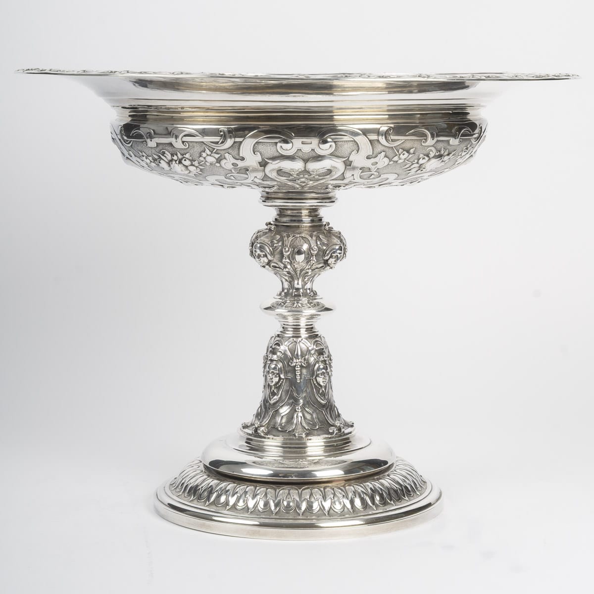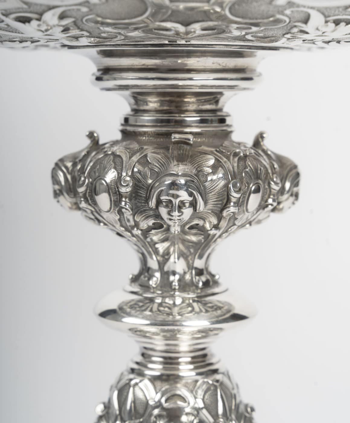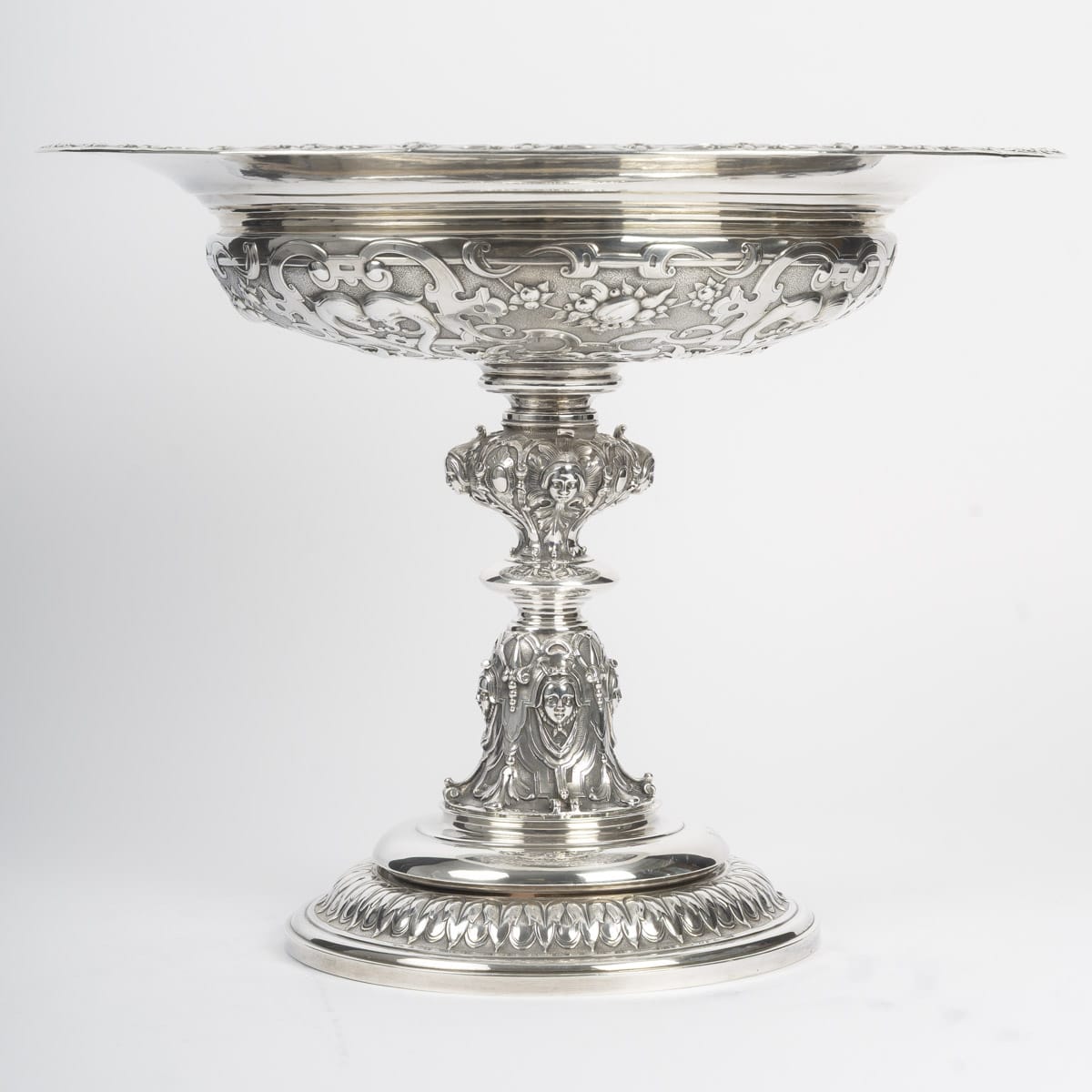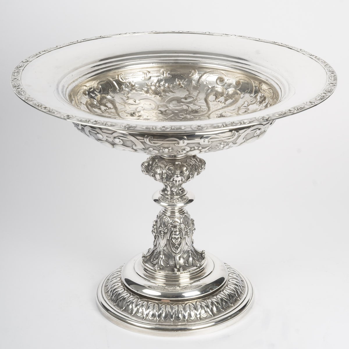 Superbe coupe circulaire en argent massif reposant sur un haut piédouche richement sculpté .