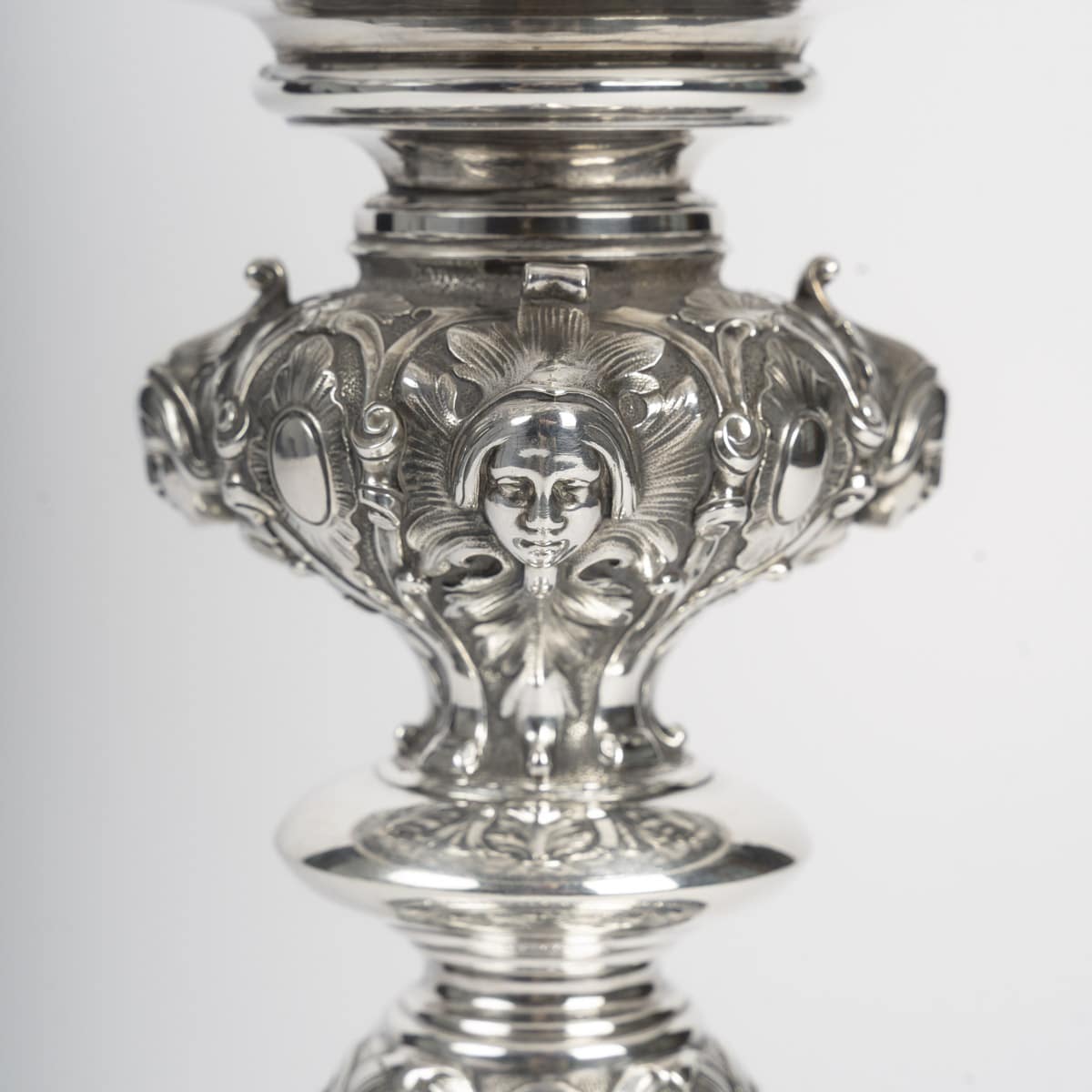 La tige balustre et le piédouche présentent un décor particulièrement remarquable de mascarons féminins en fort relief, encadrés de volutes, palmettes et motifs végétaux d’inspiration néo-Renaissance, typiques du répertoire ornemental développé par la maison ODIOT au XIXᵉ siècle. La base circulaire, largement étagée, est soulignée d’une frise de feuilles d’eau ciselées.