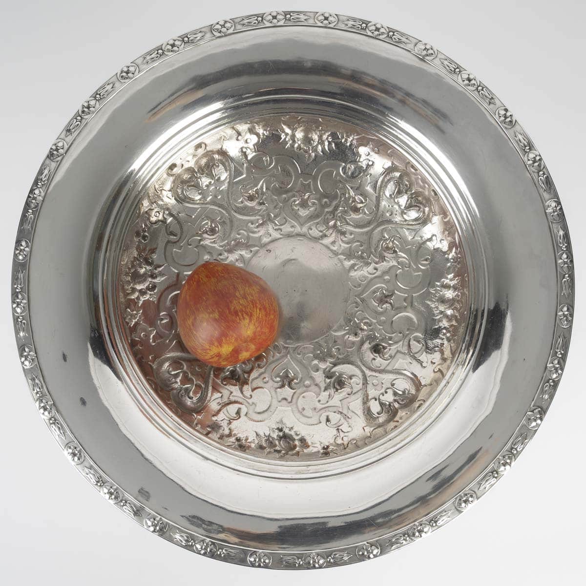 Le large bassin, à bord légèrement évasé, est orné d’un décor finement ciselé de rinceaux feuillagés, cartouches et guirlandes florales, traité en alternance de surfaces polies et amaties, soulignant la virtuosité du travail d’orfèvrerie.