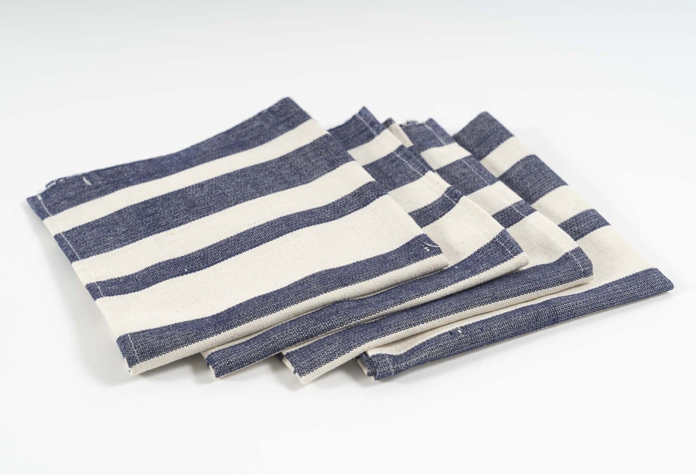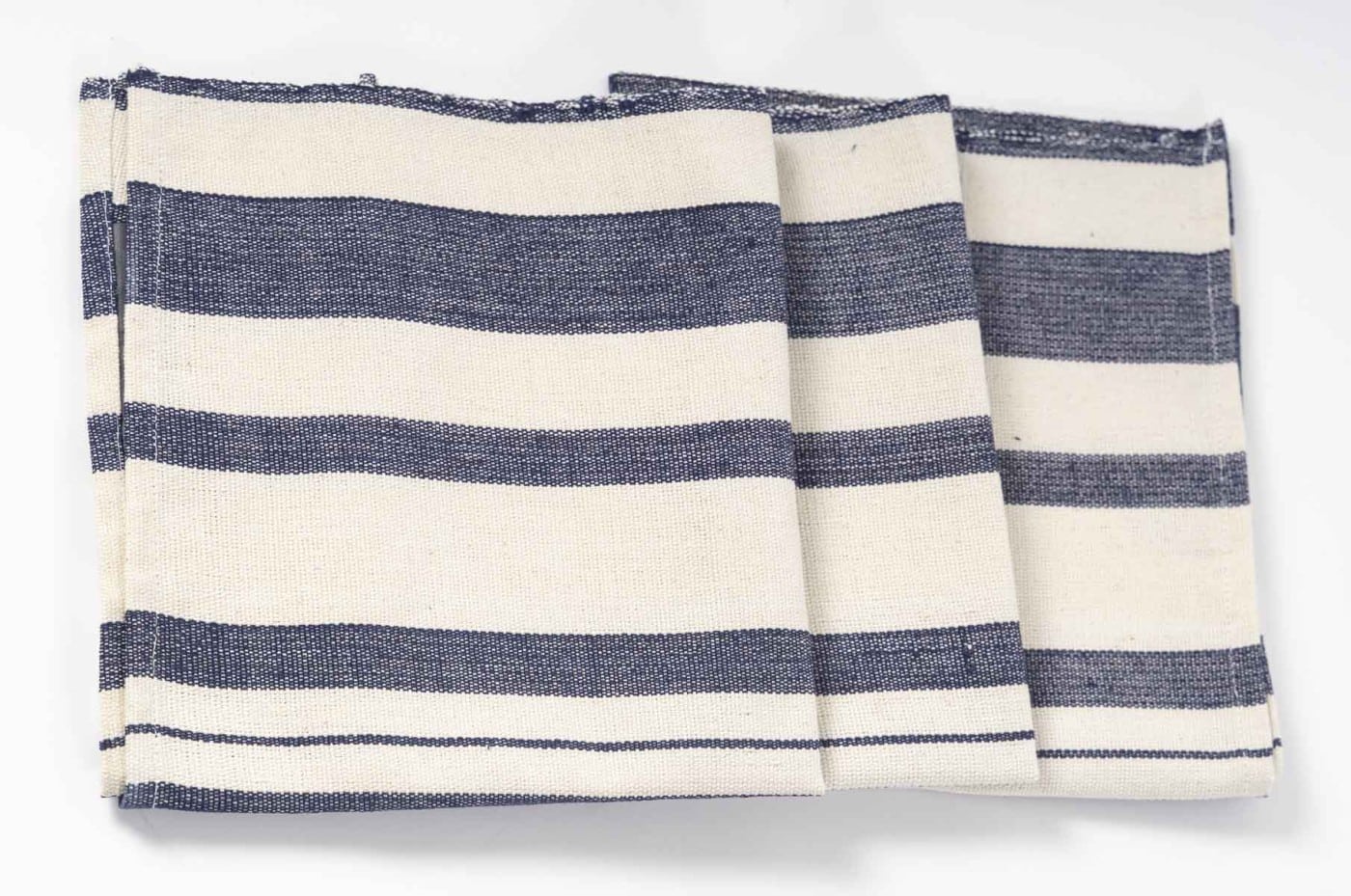 Inspiré par la mer et les nuits d’hiver, “Étoile Marine” allie sobriété et élégance. Ses rayures bleu profond sur fond écru apportent une note intemporelle à votre table. Chaque pièce est tissée à la main, en coton biologique, pour un rendu à la fois doux et durable.