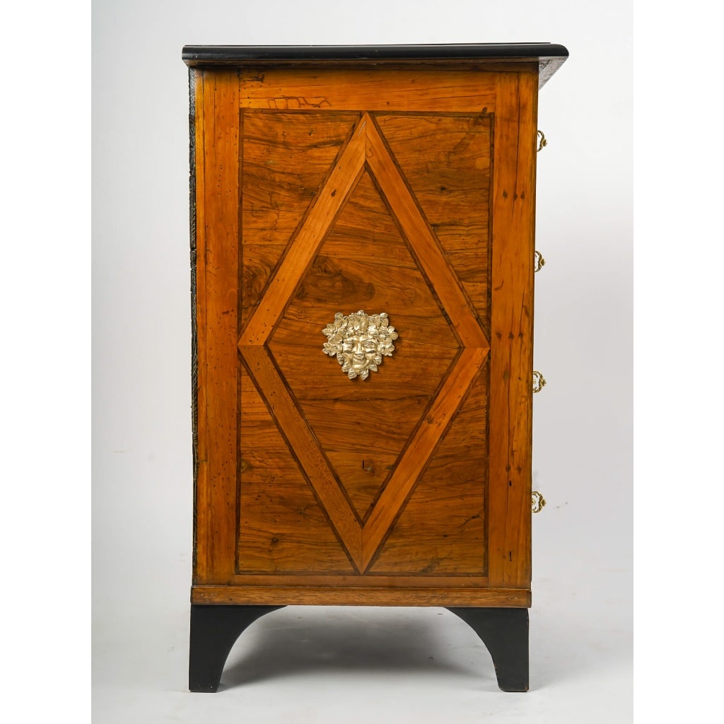 Un petit chiffonnier ou petit meuble d’entre deux en bois de placages indigènes précieux présentant sur les façades des quatre tiroirs et sur le plateau un superbe et riche décor en marqueterie représentant des rinceaux, vases, oiseaux, mascarons, et fleurs sur fond d’ébène. Élégante décoration de bronzes ciselés et dorés dont des têtes de Bacchus sur les côtés.