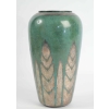 Vase en dinanderie à décor de feuillage.Vase ovoïde en dinanderie à décor géométrique stylisé en cuivre patiné vert et fond argent