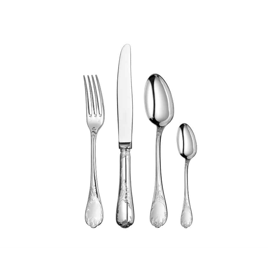 Marly, named after a no-longer-standing pleasure palace built by Louis XIV outside Paris, has been one of the most detailed and ornate patterns in the Christofle’s catalog since it was created in 1897. The fine chasing is an exquisite example of Rocaille with its asymmetrical crawling plant and shell motifs.
