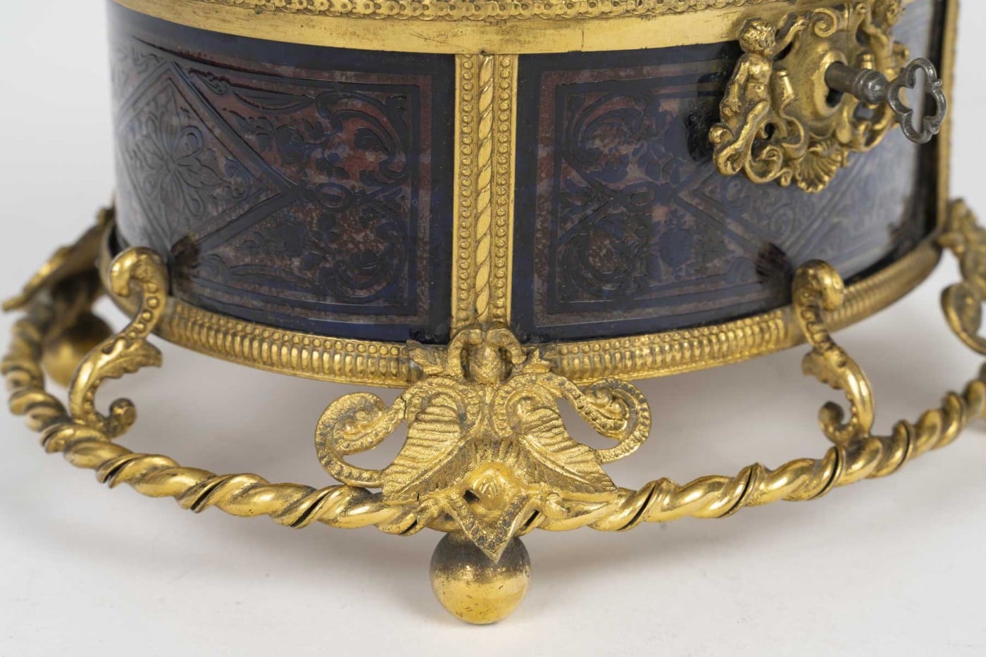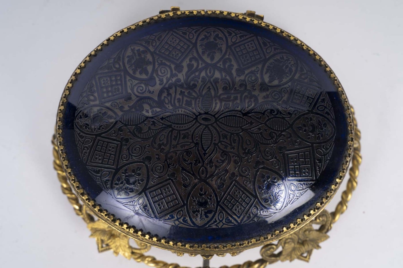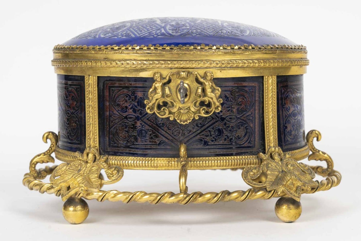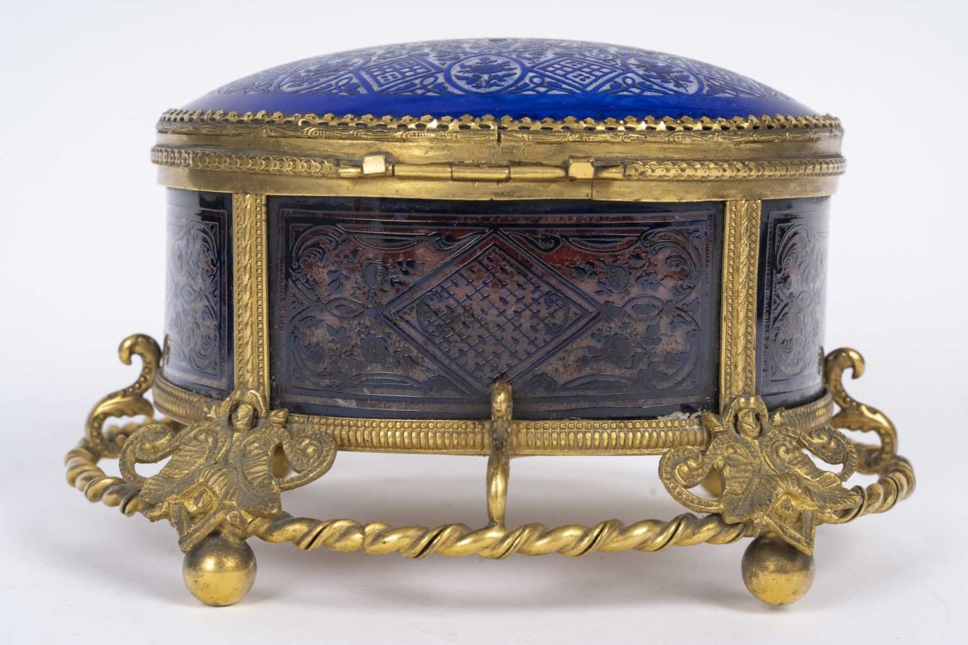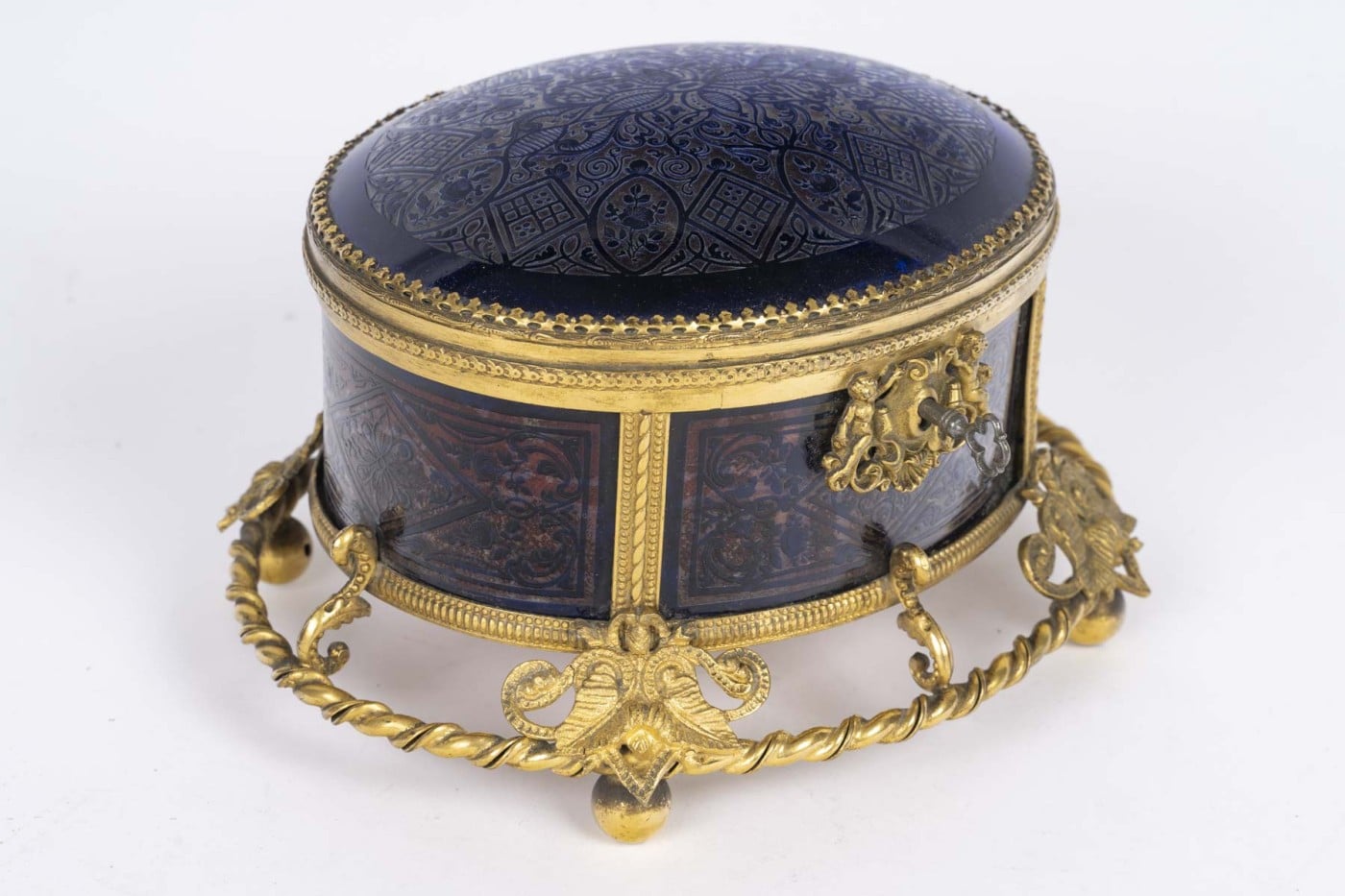 Élégant coffret de forme ovale en cristal bleu profond finement gravé à décor de motifs floraux et géométriques, reposant sur une riche monture en bronze doré finement ciselée, ornée de mascarons, guirlandes et enroulements.