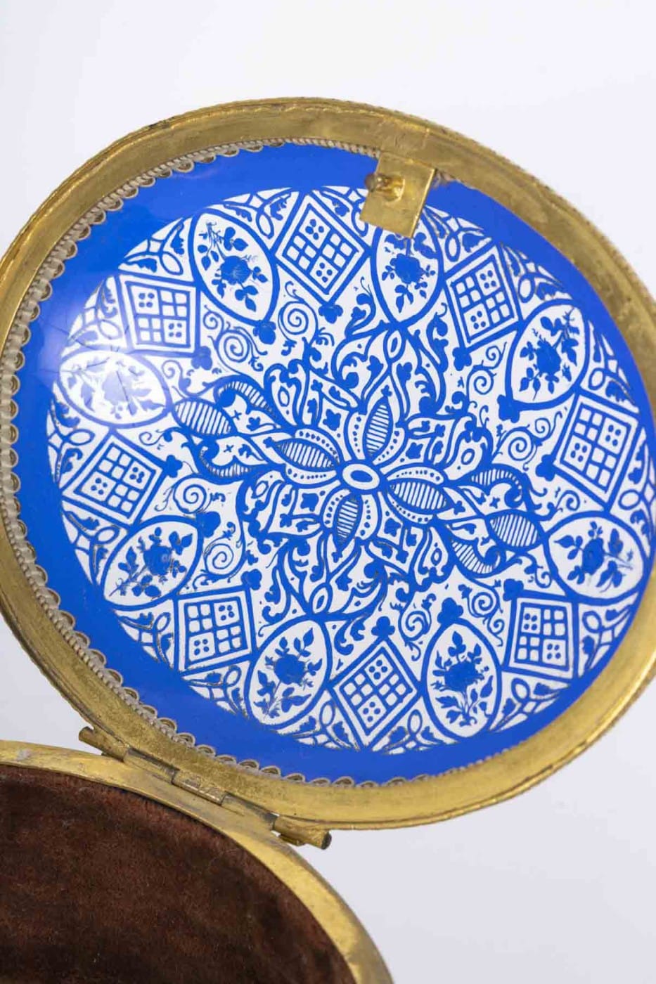 Le couvercle bombé s’ouvre pour révéler un intérieur tapissé de velours ancien et un dessous de couvercle en cristal bleu décoré d’un superbe motif gravé.