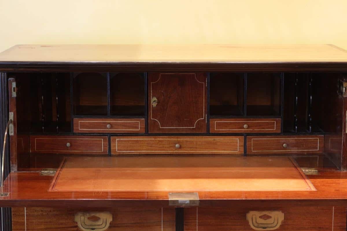 En acajou avec un bâti en camphre elle est garnie d’une bordure en palissandre qui encadre les tiroirs et les montants.