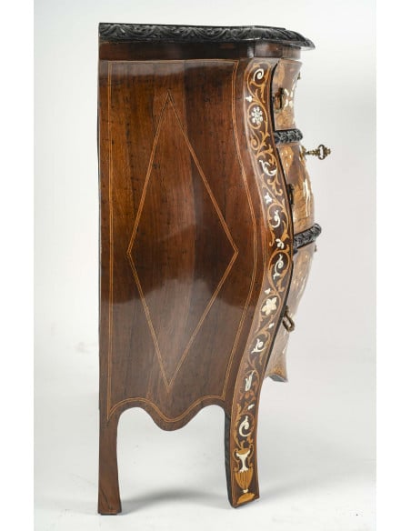 Rare commode lombarde d’entre deux en noyer et marqueterie de bois fruitier, os et nacre. L’ensemble à décor marqueté de scènes de chasse de lion, de cerf, de loup et de sanglier. Elle ouvre en façade galbée et cintrée par trois tiroirs à traverses sculptées. Le dessus de la commode et des tiroirs représentent chacun le type de chasse pratiquée par l’aristocratie.