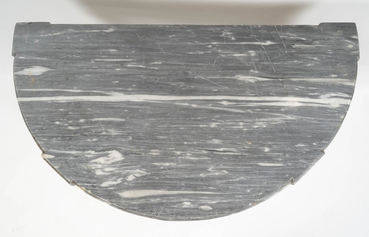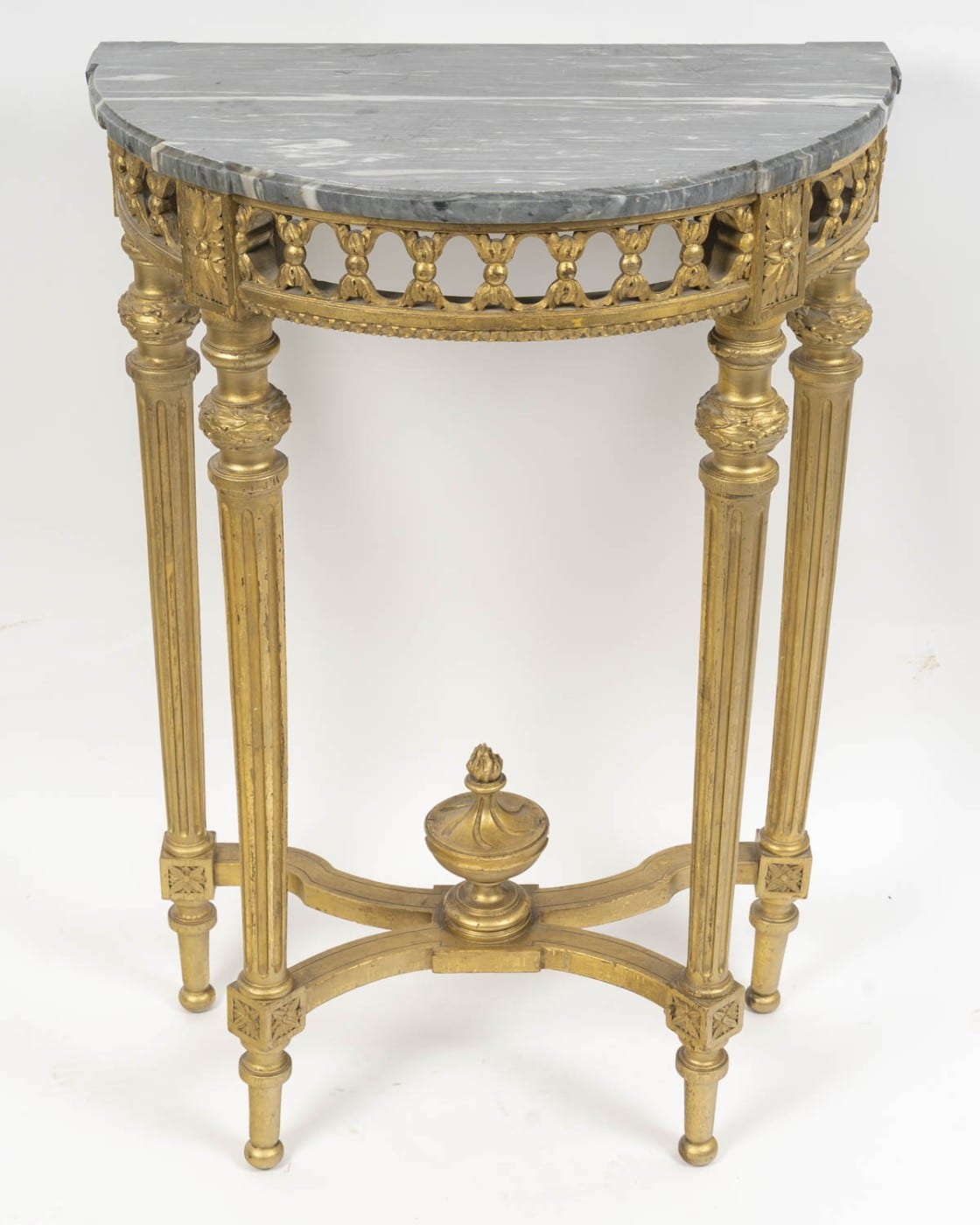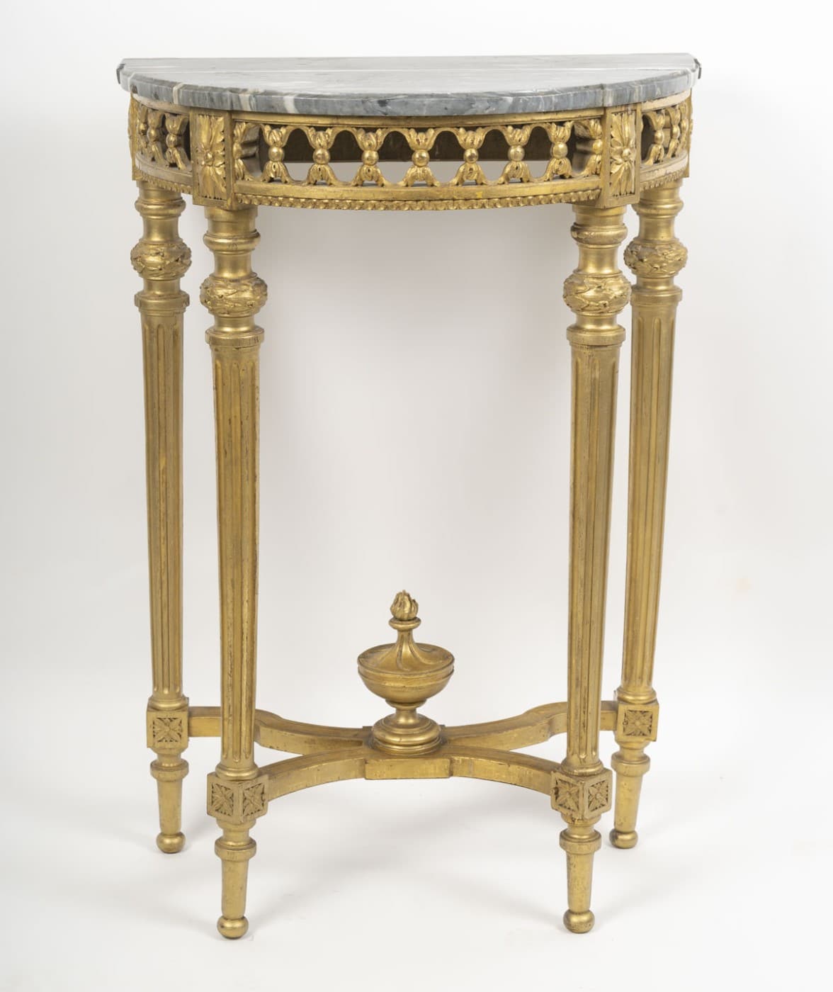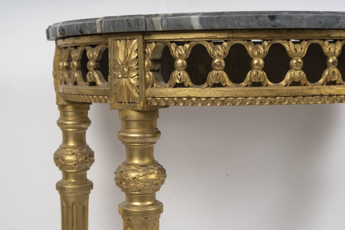 Les 4 pieds cannelés remonte vers une ceinture ajourée soutenant le plateau de marbre.