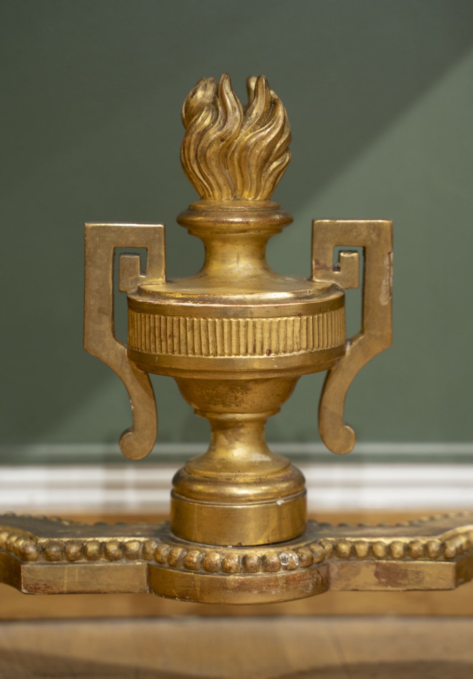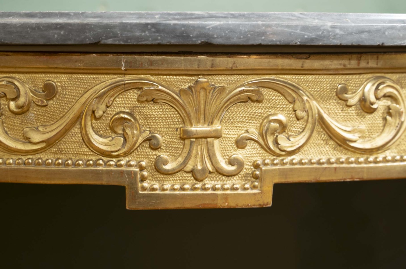 Elégante console Louis XVI en bois sculpté et doré à quatre pieds. La ceinture est sculptée de rinceaux et de marguerites, le piètement est composé de quatre pieds cannelés et rudentés reliés par une entretoise garnie d’un vase. Le marbre gris veiné est en parfait état.