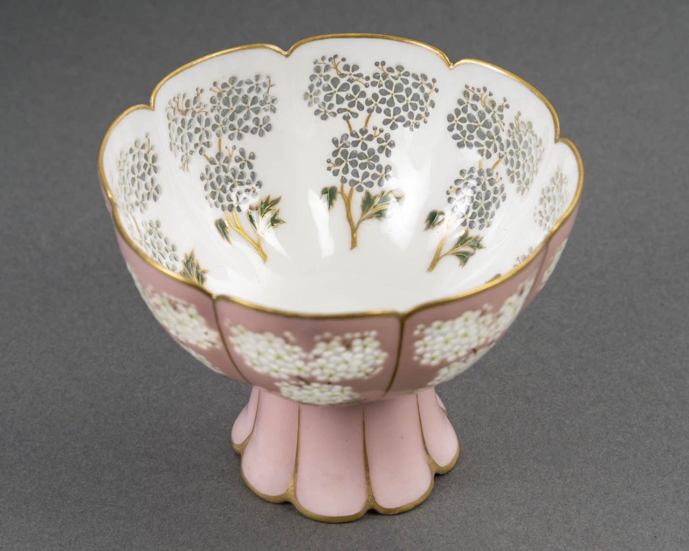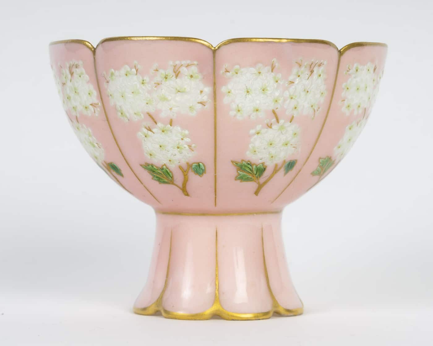 Coupe Camille Naudot en porcelaine à fond rose à décor d’émaux plique-à-jour représentant des fleurs types boules de neige. La coupe polylobée sur piédouche prend la forme d’un lotus.