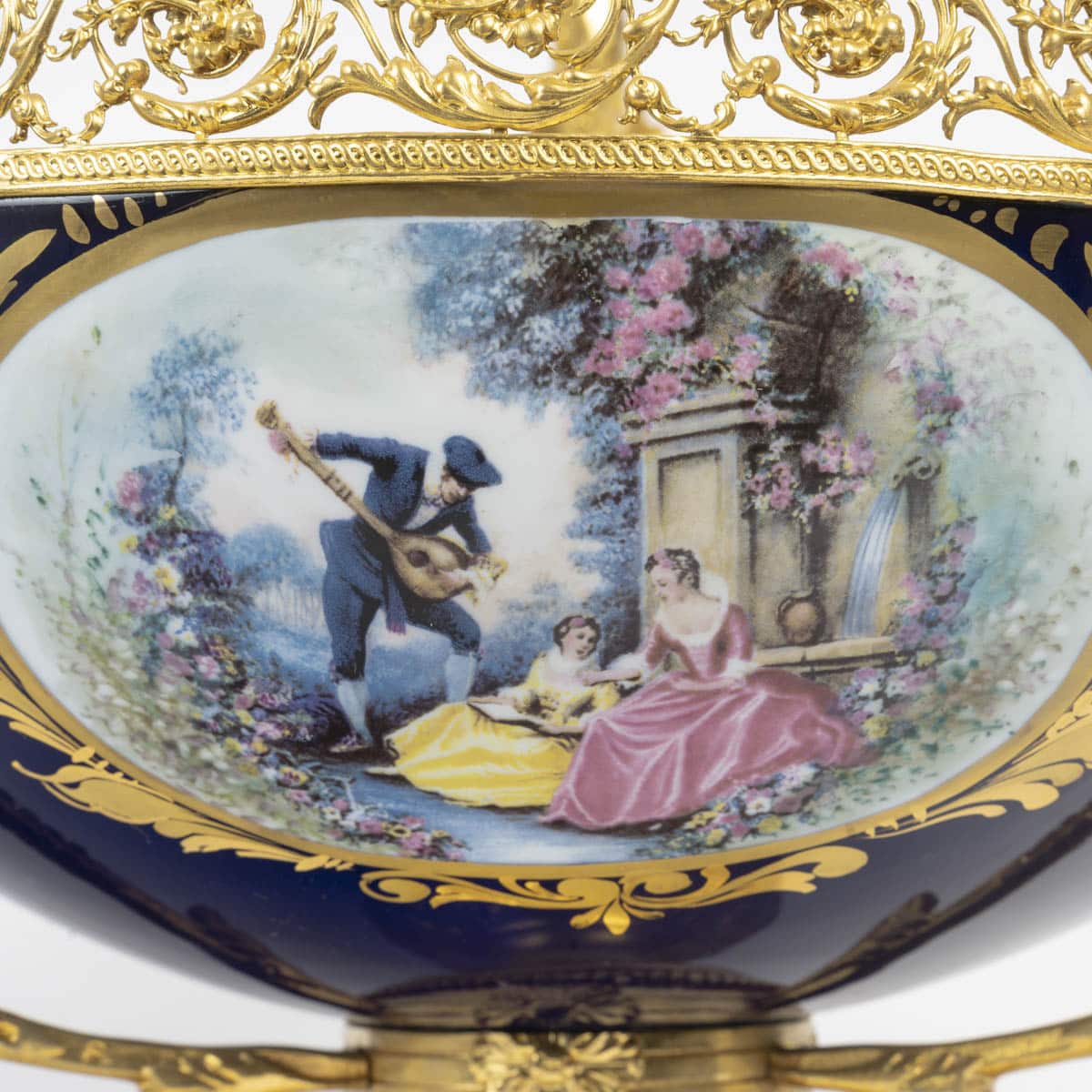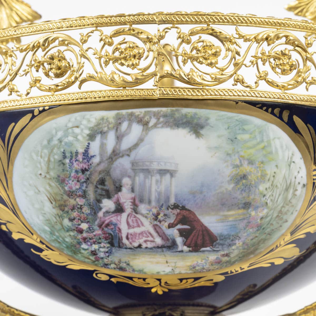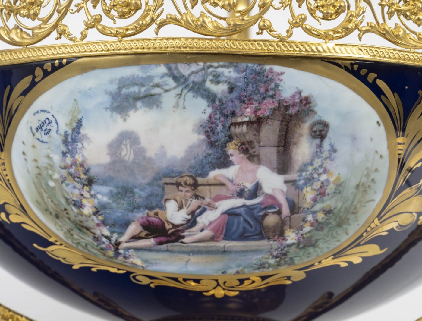 La coupe en porcelaine émaillée de bleu et réhaussée de dorures présente 3 décors romantiques peints à la main, une sérénade, un homme tendant des fleurs à une femme, une femme appuyée contre une fontaine avec son enfant qui joue de la musique.