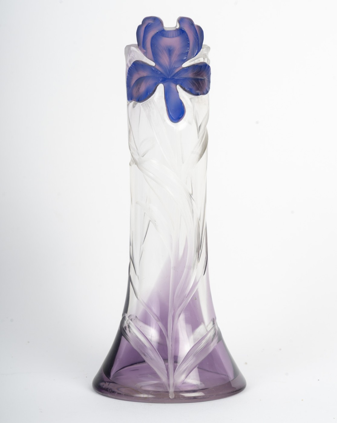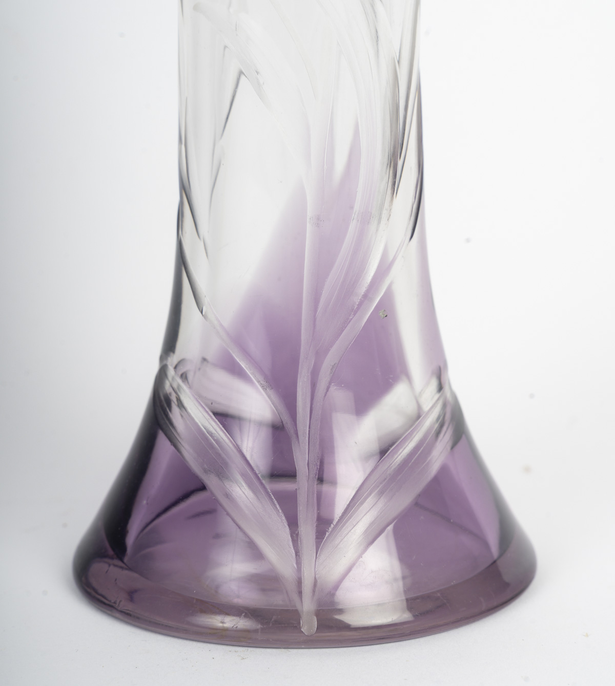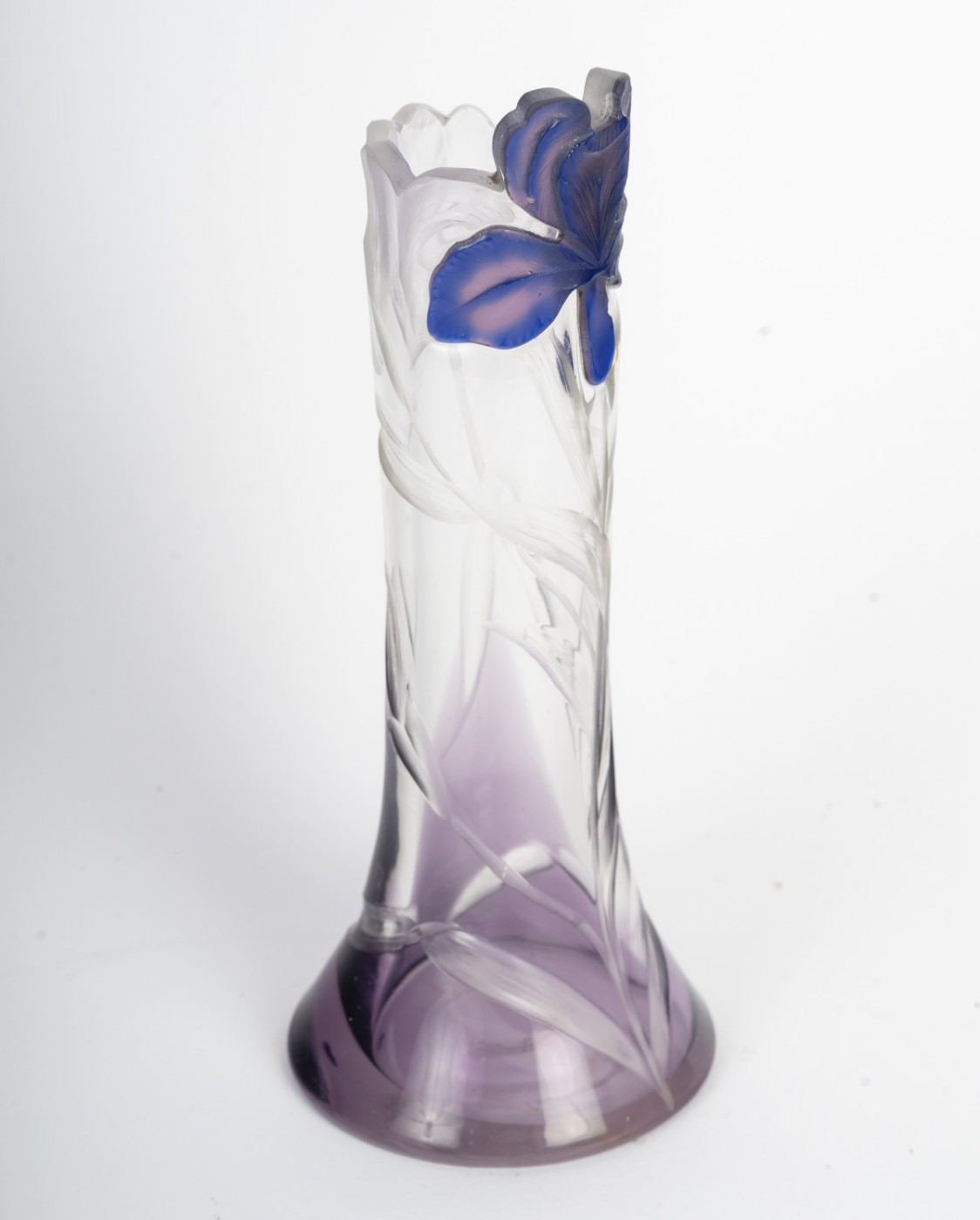 Vase soliflore en verre translucide et mauve, le corps gravé d’une tige de fleur, le col figurant une fleur de violette en applique.