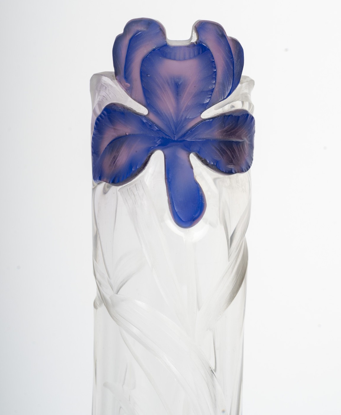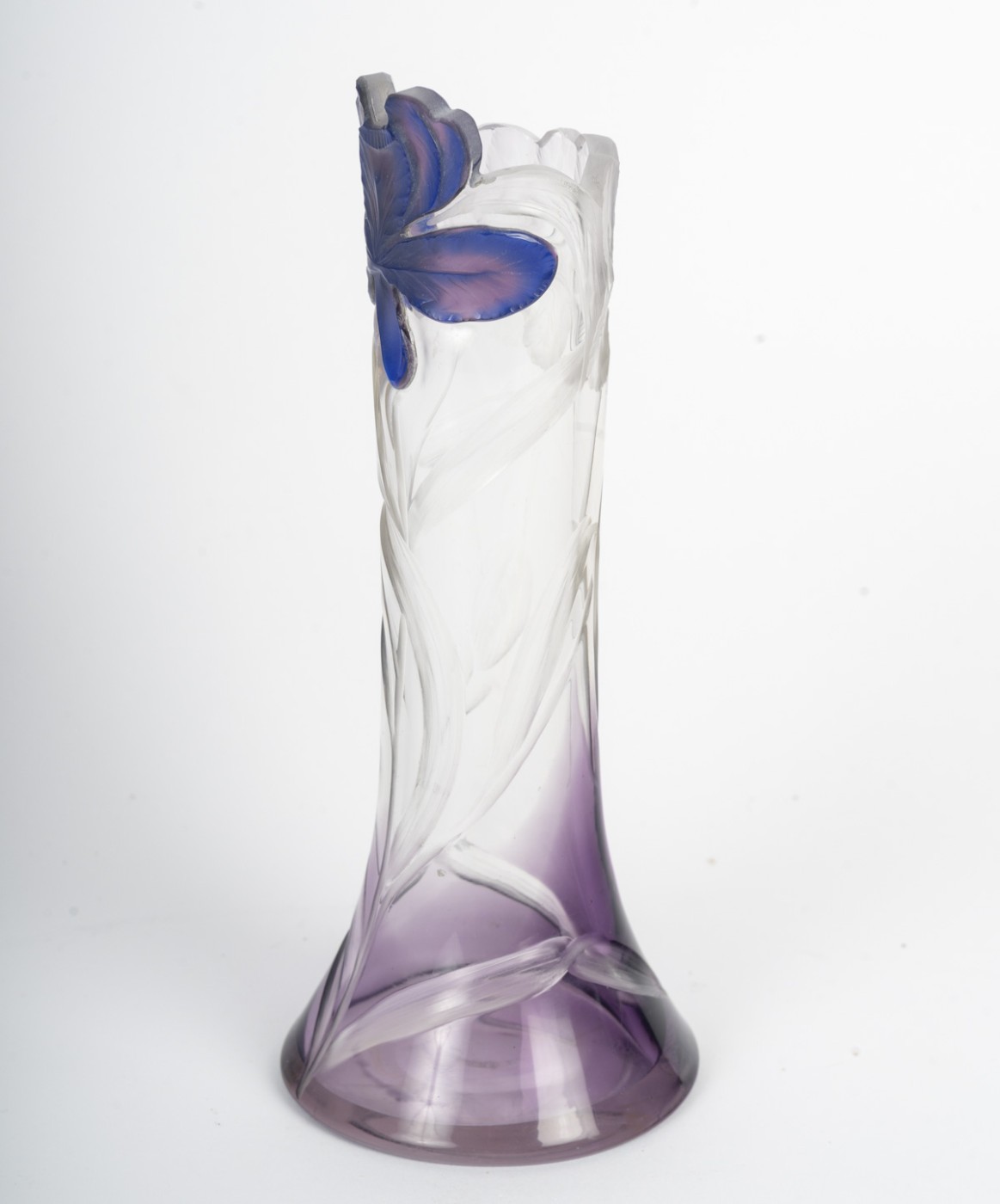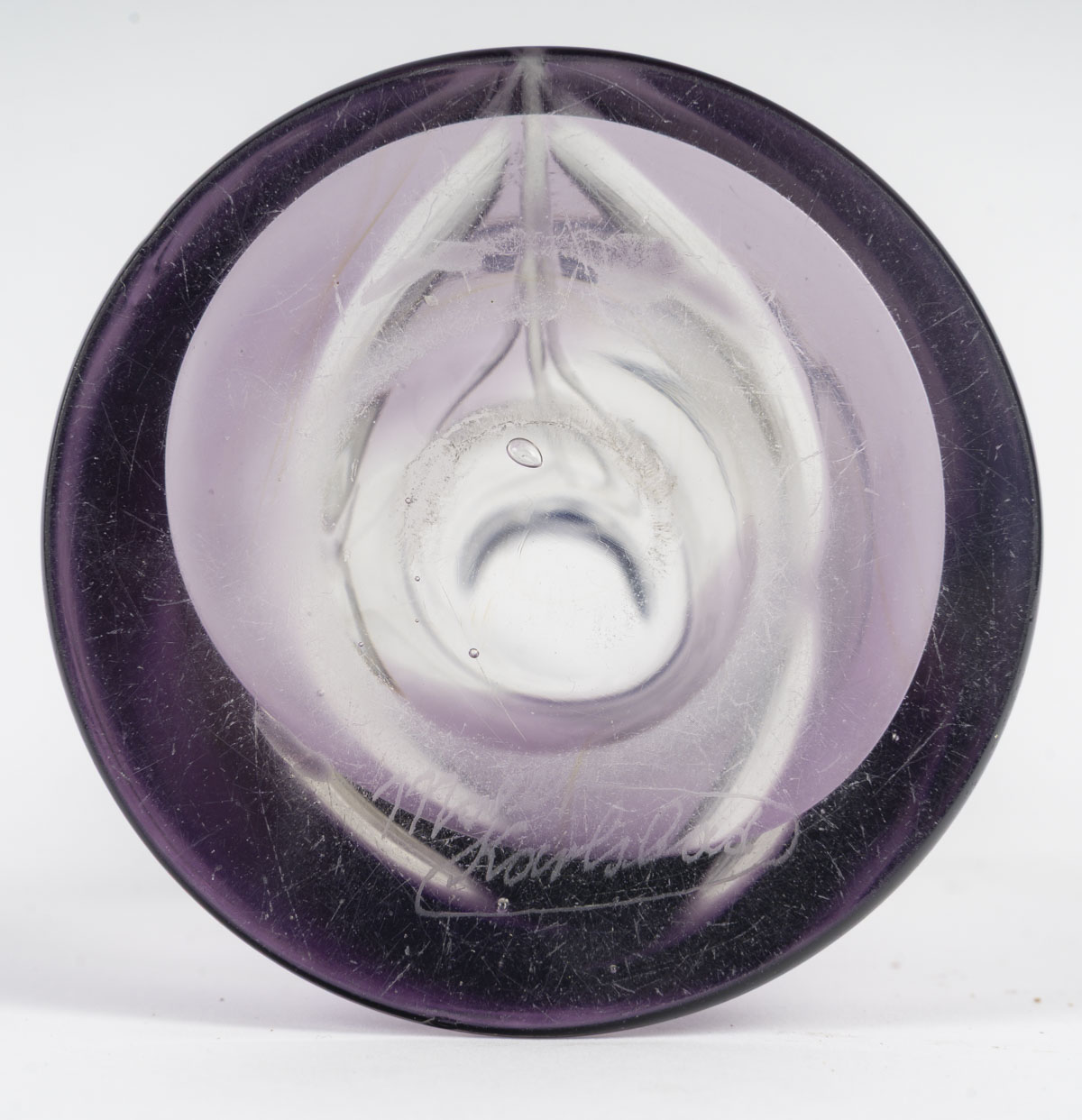 Vase soliflore en verre translucide et mauve, le corps gravé d’une tige de fleur, le col figurant une fleur de violette en applique.