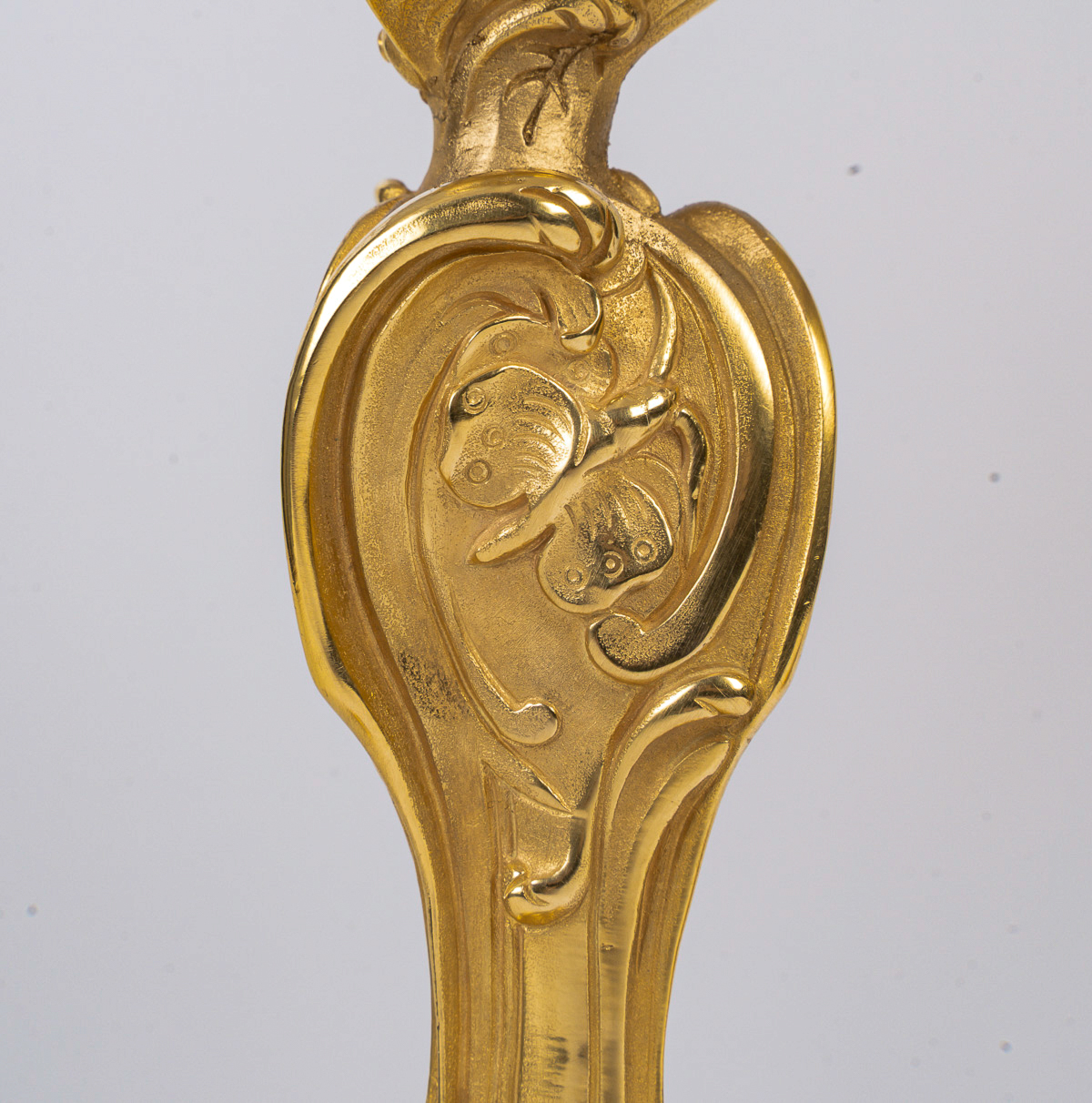 Inspirés des créations de Juste-Aurèle Meissonnier, ces flambeaux témoignent d’un savoir-faire français exceptionnel. Fabriqués vers 1850, ils conservent une dorure remarquablement préservée, conférant à chaque pièce une authenticité unique.