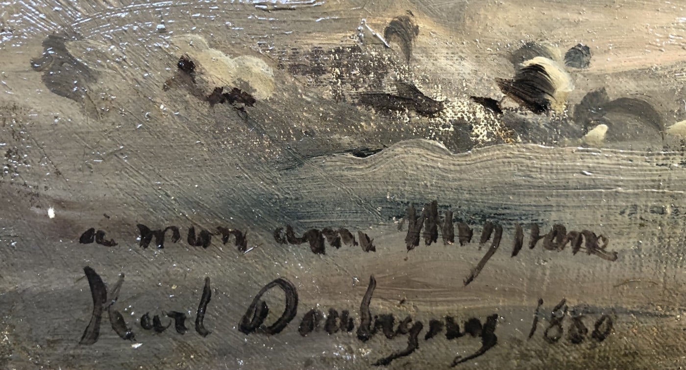 Huile sur toile signée, datée 1880 et dédicacée à son ami en bas à gauche.