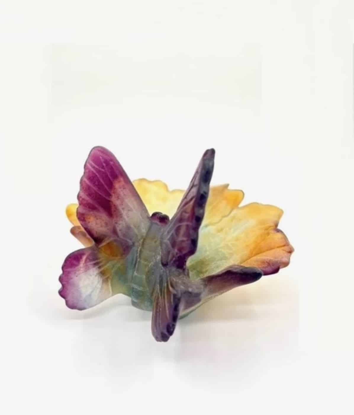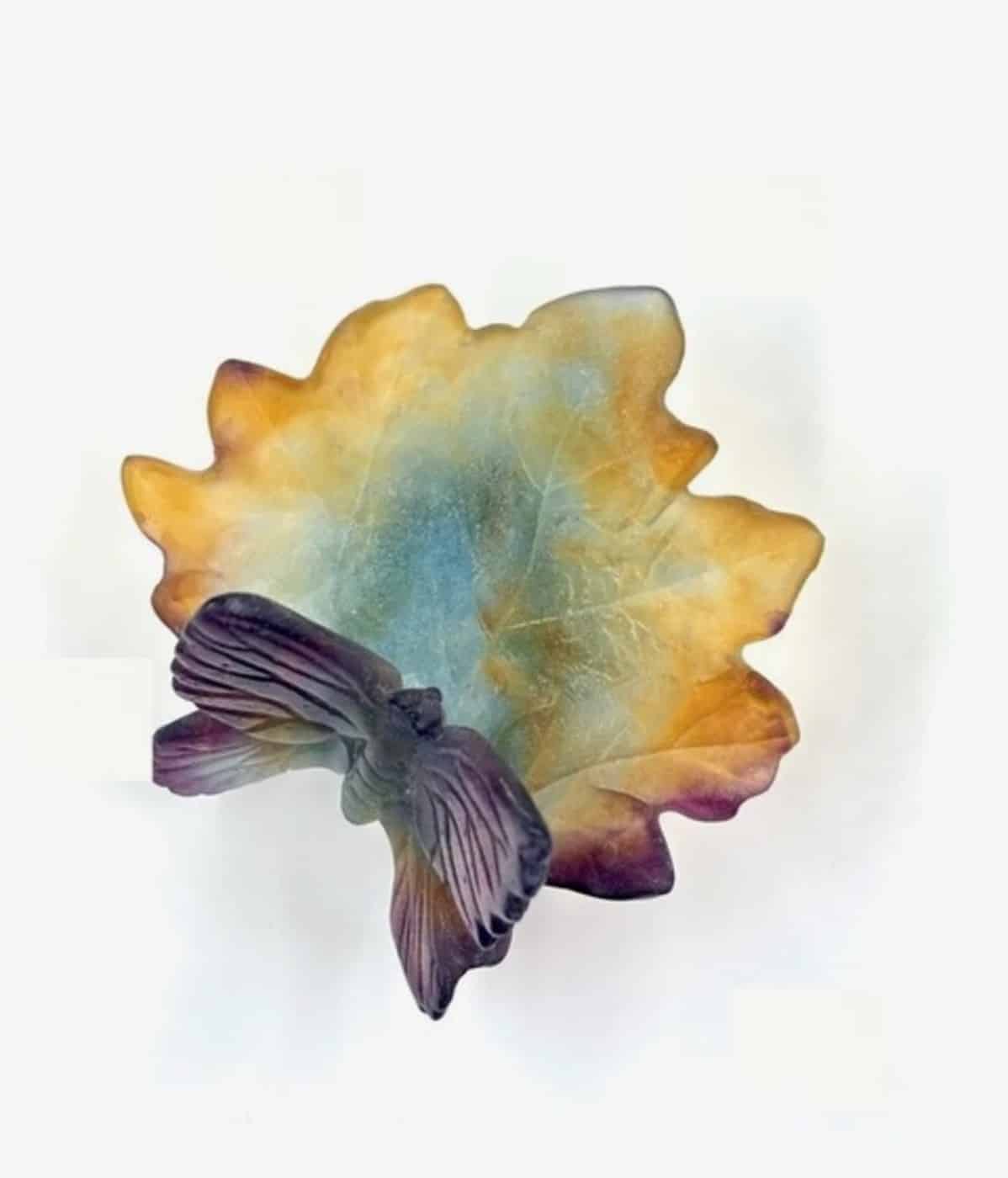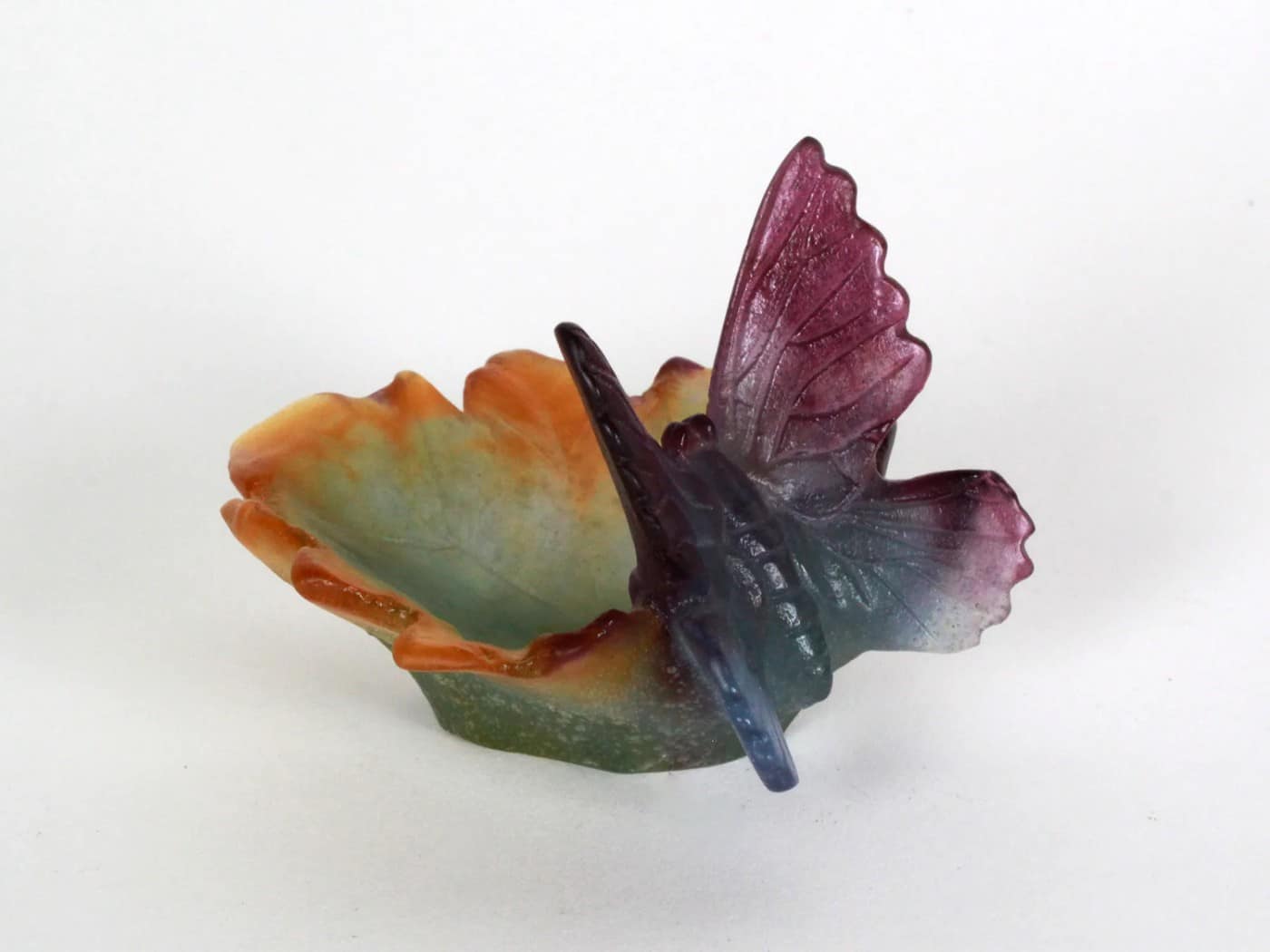 DAUM France Petit vide poches en pâte de verre nuancée violet, bleu et jaune figurant un papillon posé sur une feuille de platane .