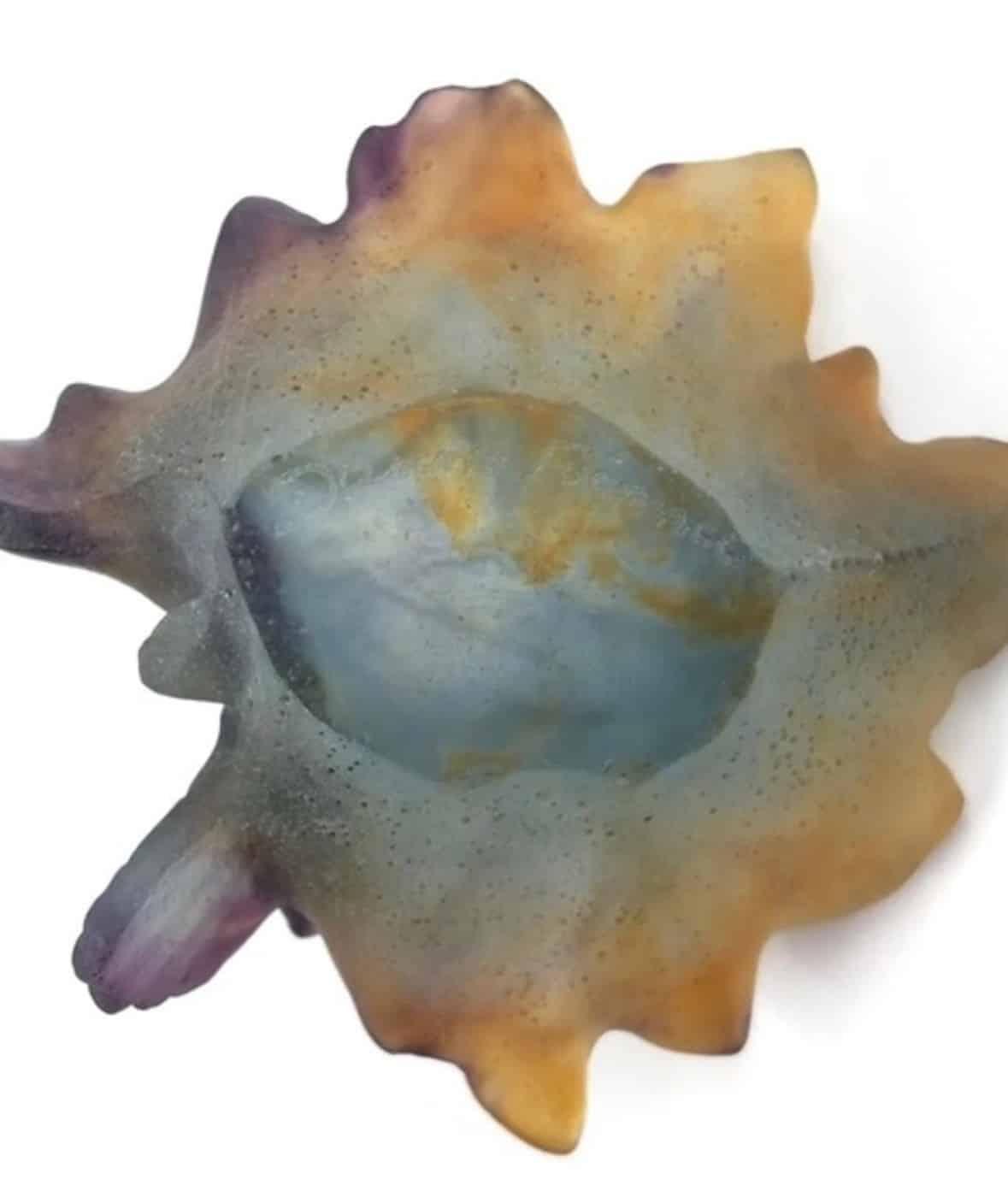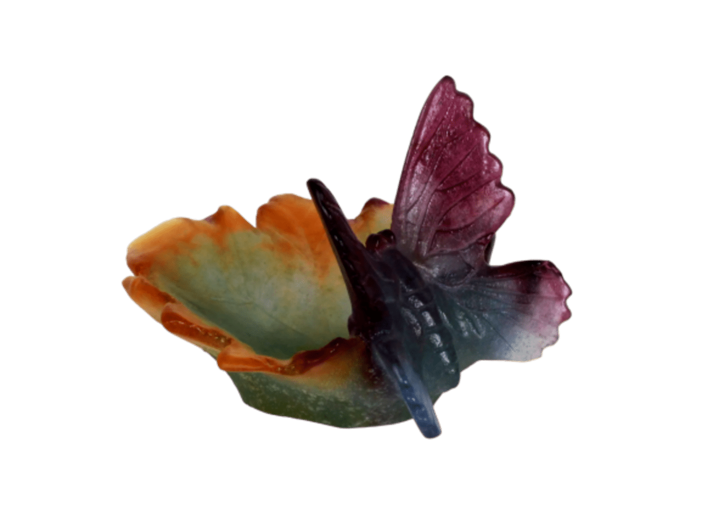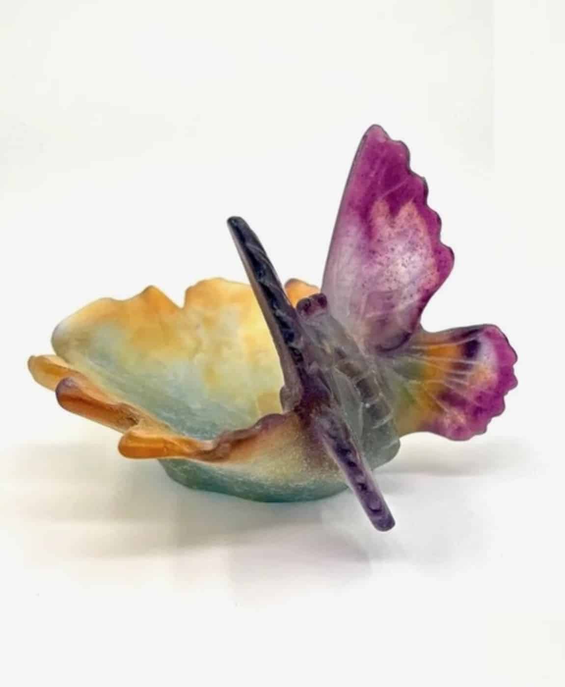 DAUM France Petit vide poches en pâte de verre nuancée violet, bleu et jaune figurant un papillon posé sur une feuille de platane .