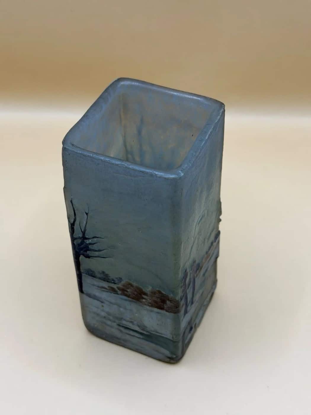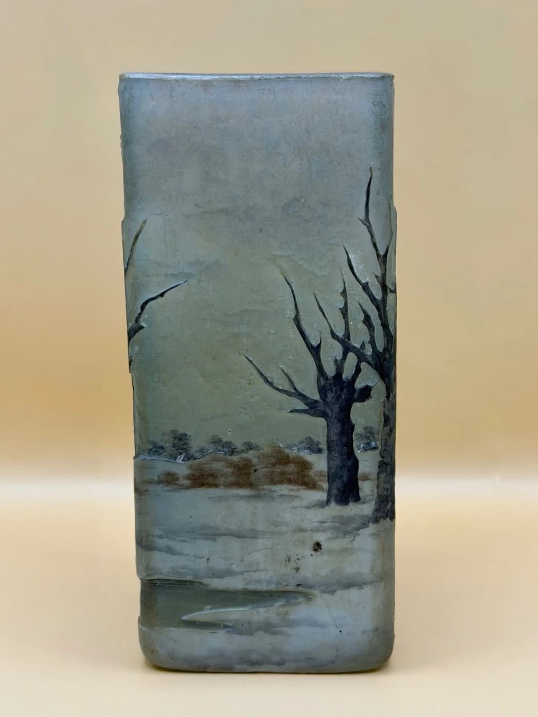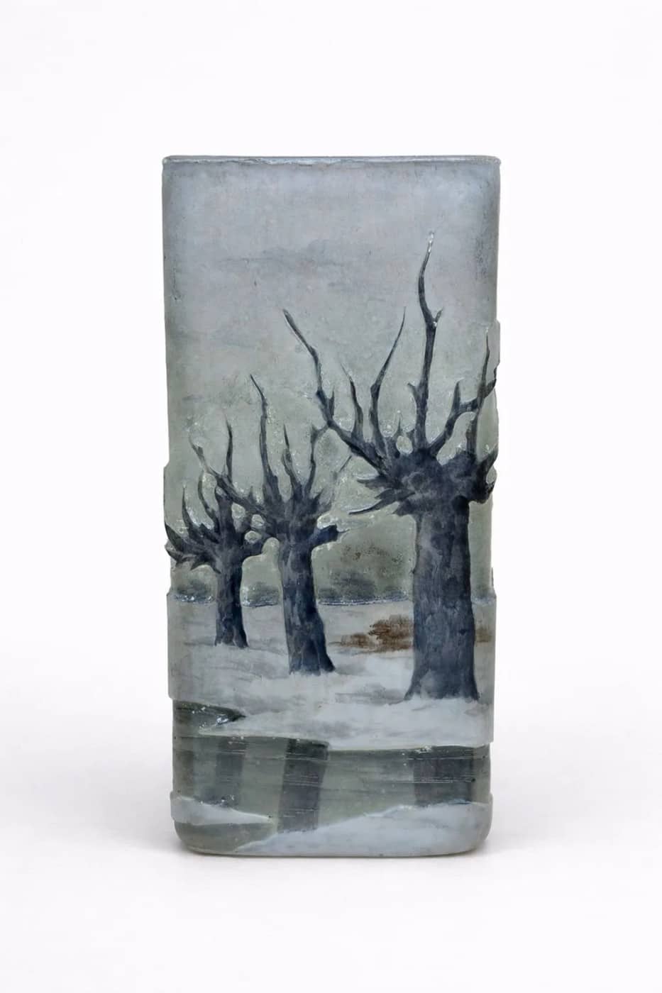 DAUM NANCY Vase a section carrée en verre multicouche à décor dégagé à l’acide et émaillé d’un paysage lacustre hivernal sur fond gris nuancé.