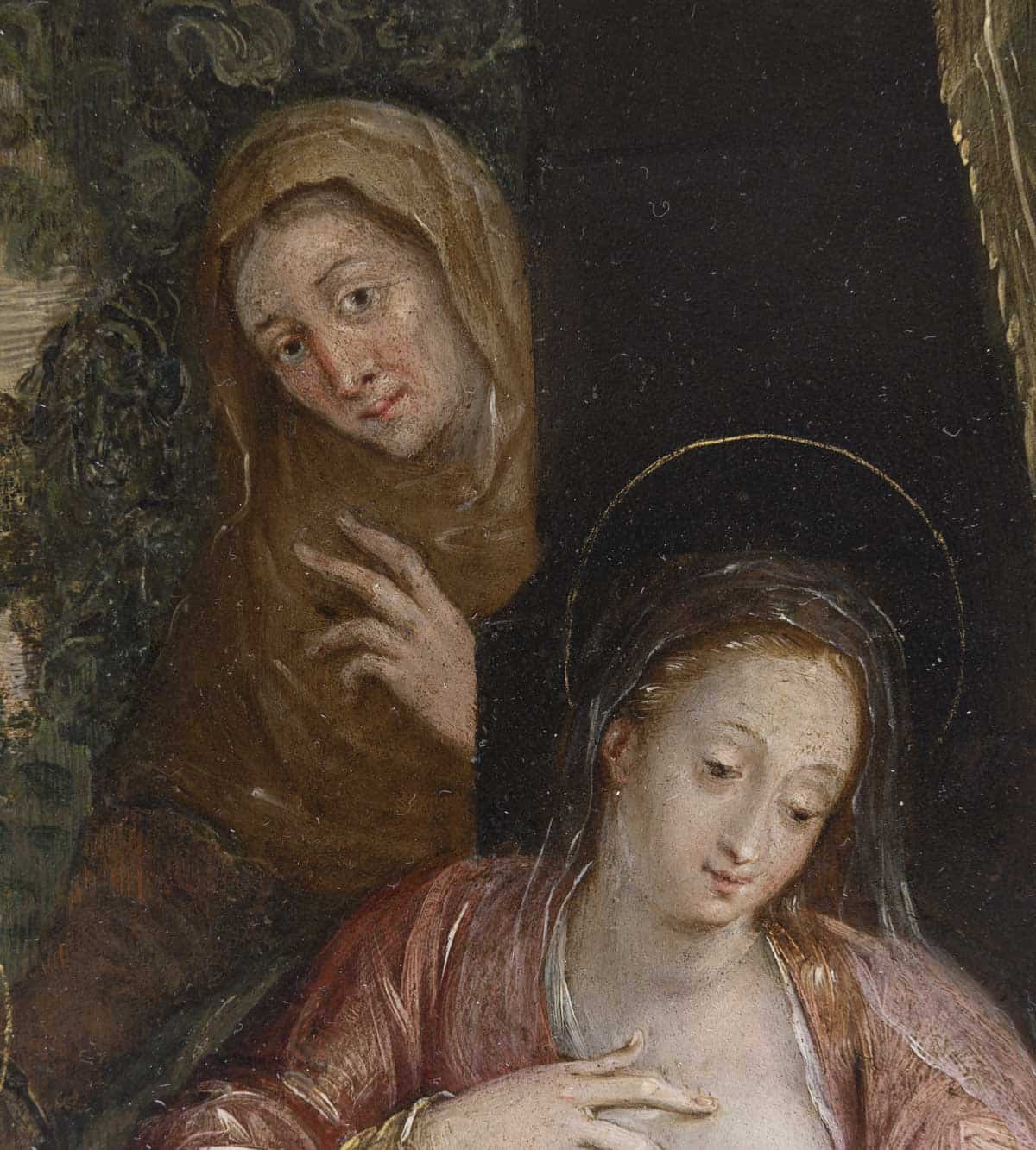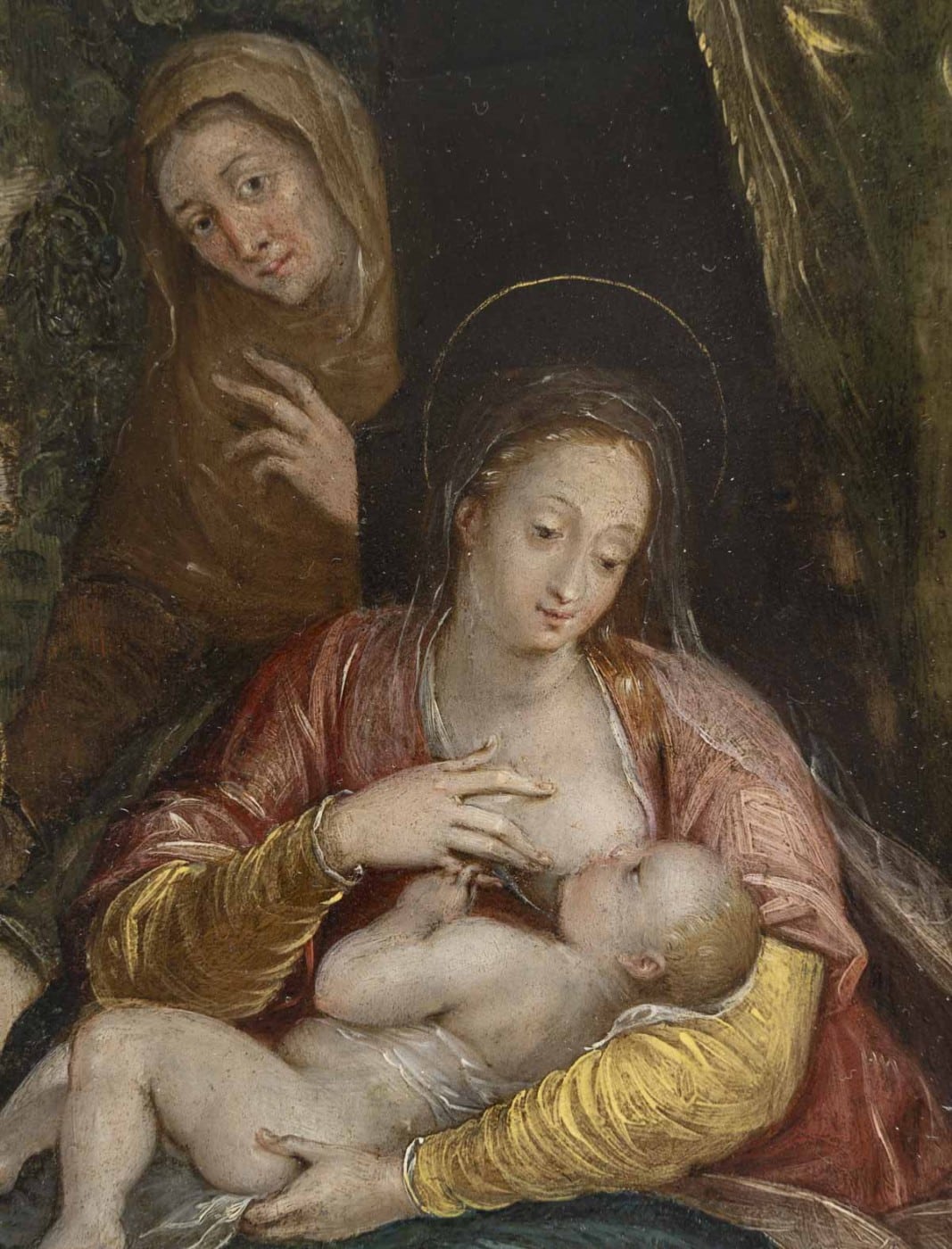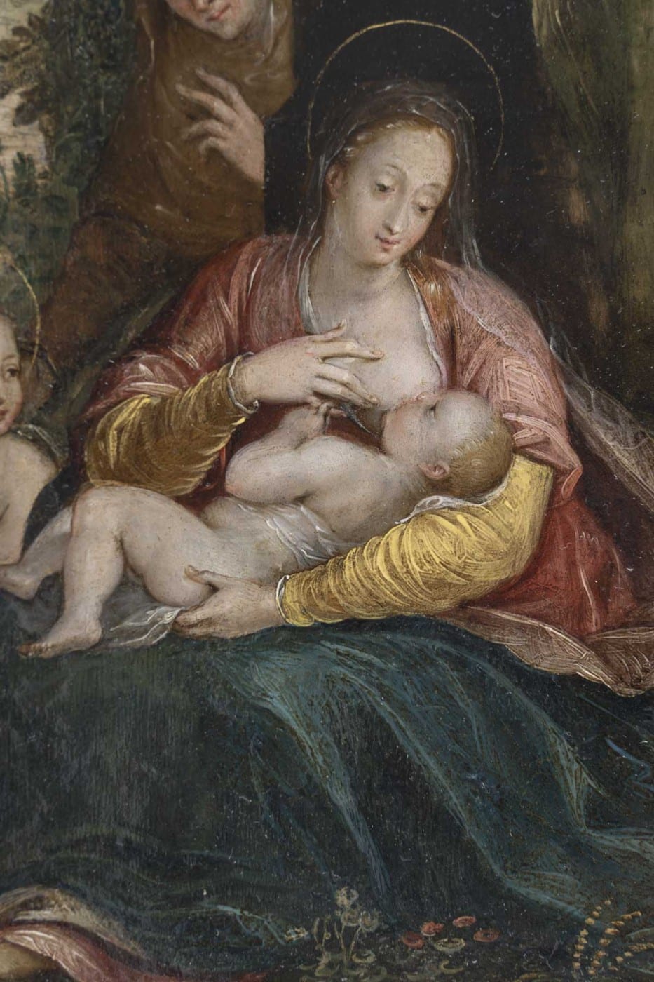 On ne peut qu’être ému devant ce beau visage auréolé de la vierge penché sur l’enfant jésus. Saint-Anne veille attentive tandis que Jean-Baptiste regarde celui qui le guidera. Vêtue d’une robe de couleur rose, elle tient l’enfant jésus sur ses genoux drapés d’une soie brodée de fleurs. L’oeuvre est précieuse, la scène se déroule en extérieur, un rideau sépare et protège la vierge.